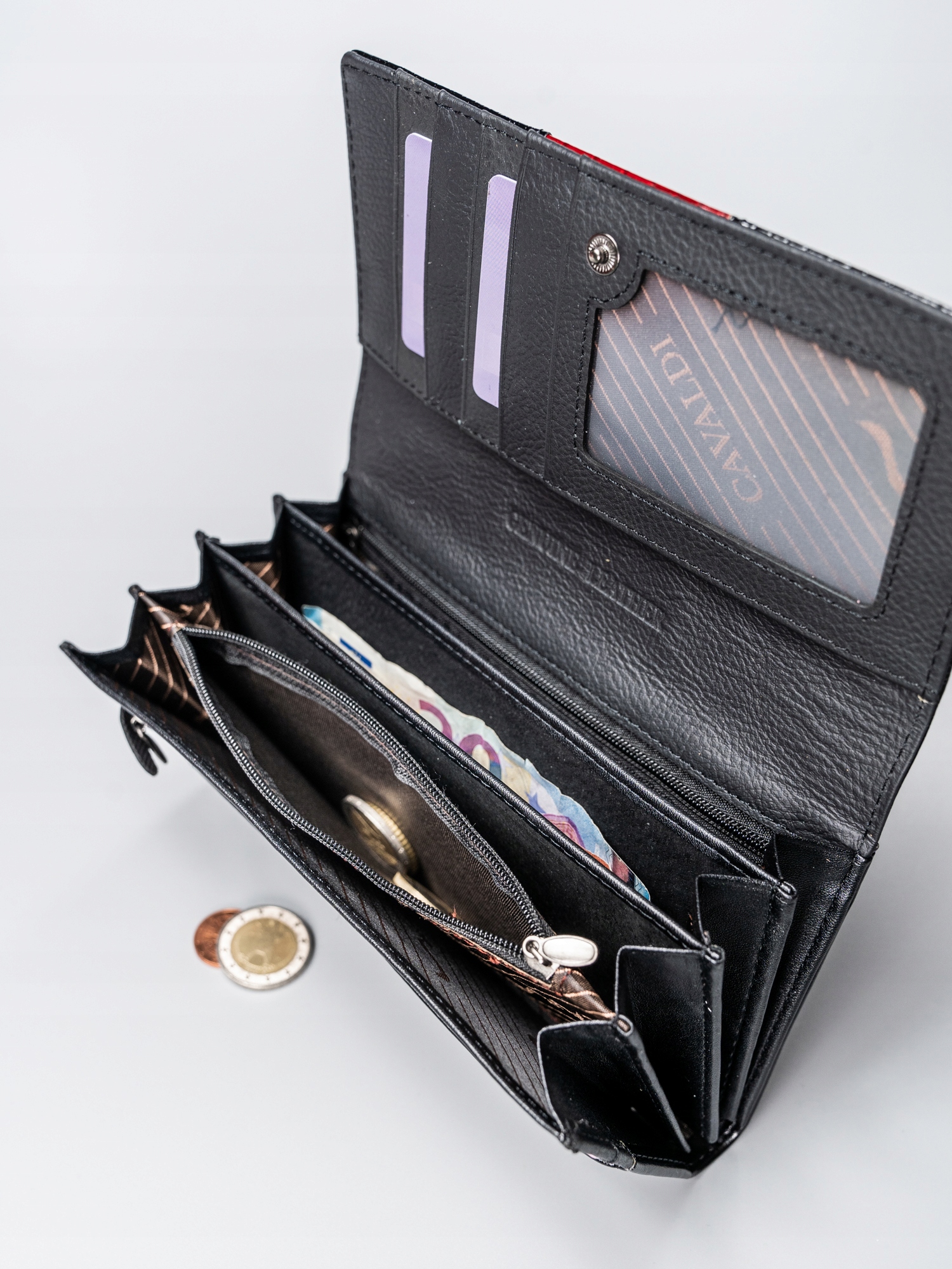 Izdelana iz najkakovostnejšega naravnega in eko usnja, zunaj sijoča, znotraj pa mat. Na sprednji strani denarnice je logotip CAVALDI. Vsaka denarnica ima edinstven slog in značaj. Zasnovana v skladu z najnovejšimi trendi, je popolna izbira za vsako žensko. Odlična kakovost, brezhibna izdelava in edinstven videz – to je naša popolna izbira za vas.