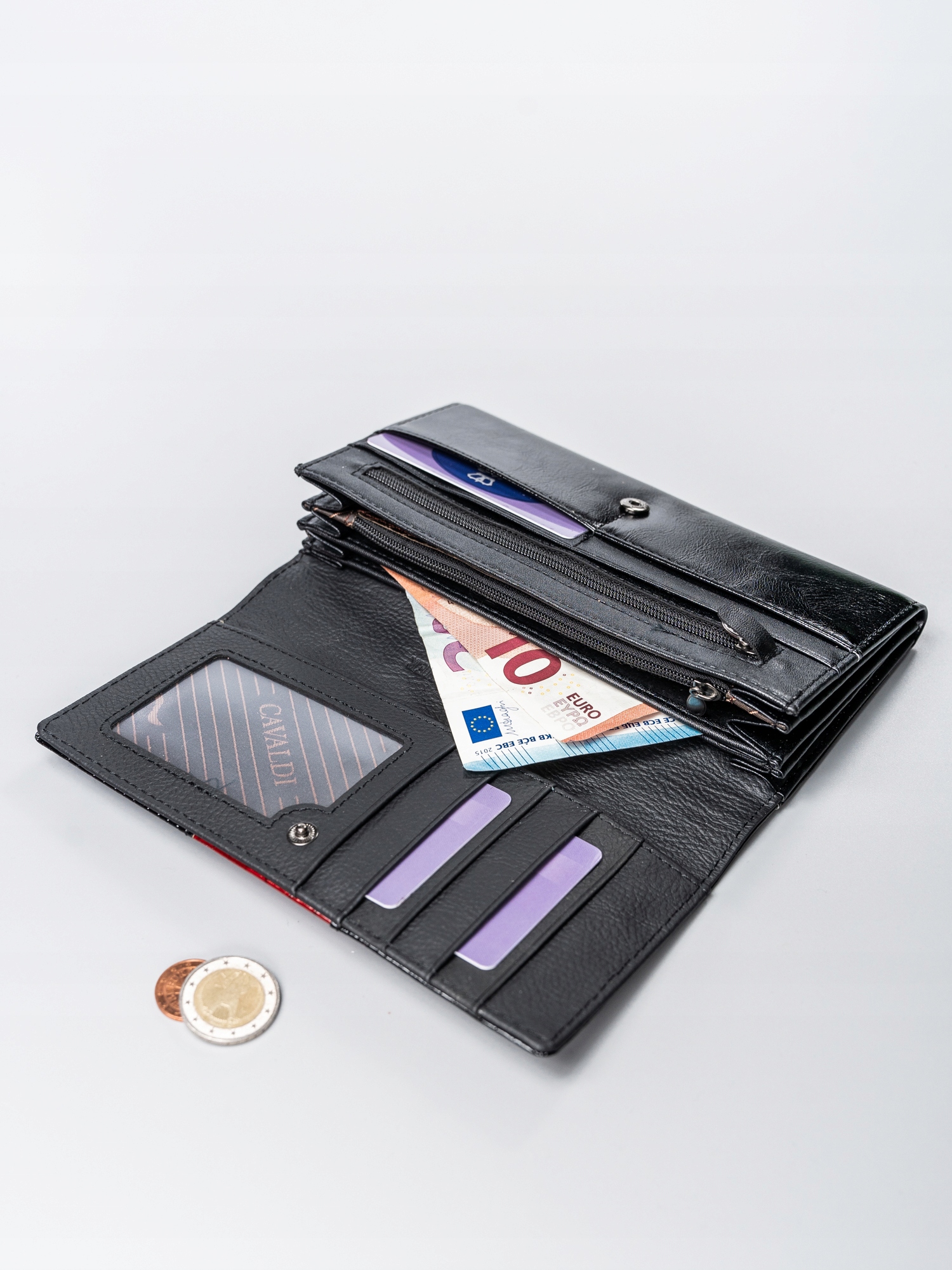 Predstavljamo čudovito, elegantno žensko usnjeno denarnico iz najnovejše kolekcije CAVALDI. Denarnica je na voljo v klasični, vedno modni rdeči barvi.