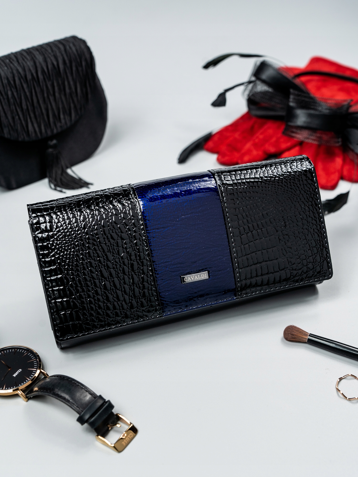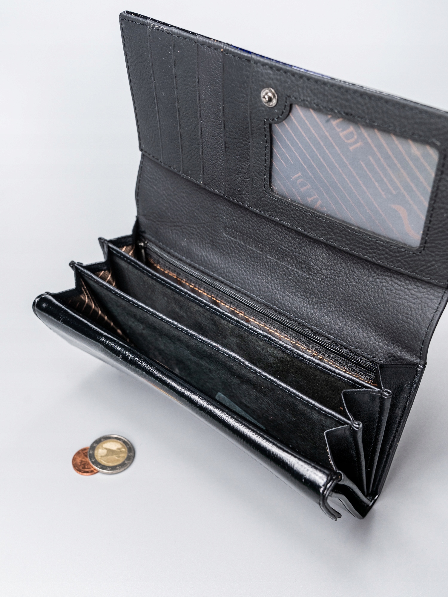 Predstavljamo vam neverjetno, elegantno žensko usnjeno denarnico iz najnovejše kolekcije CAVALDI. Denarnica je izdelana iz osupljivega modrega lakiranega usnja.