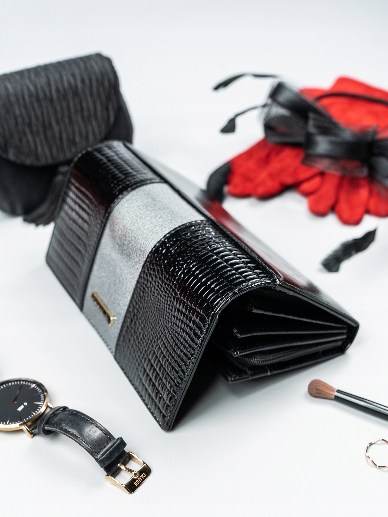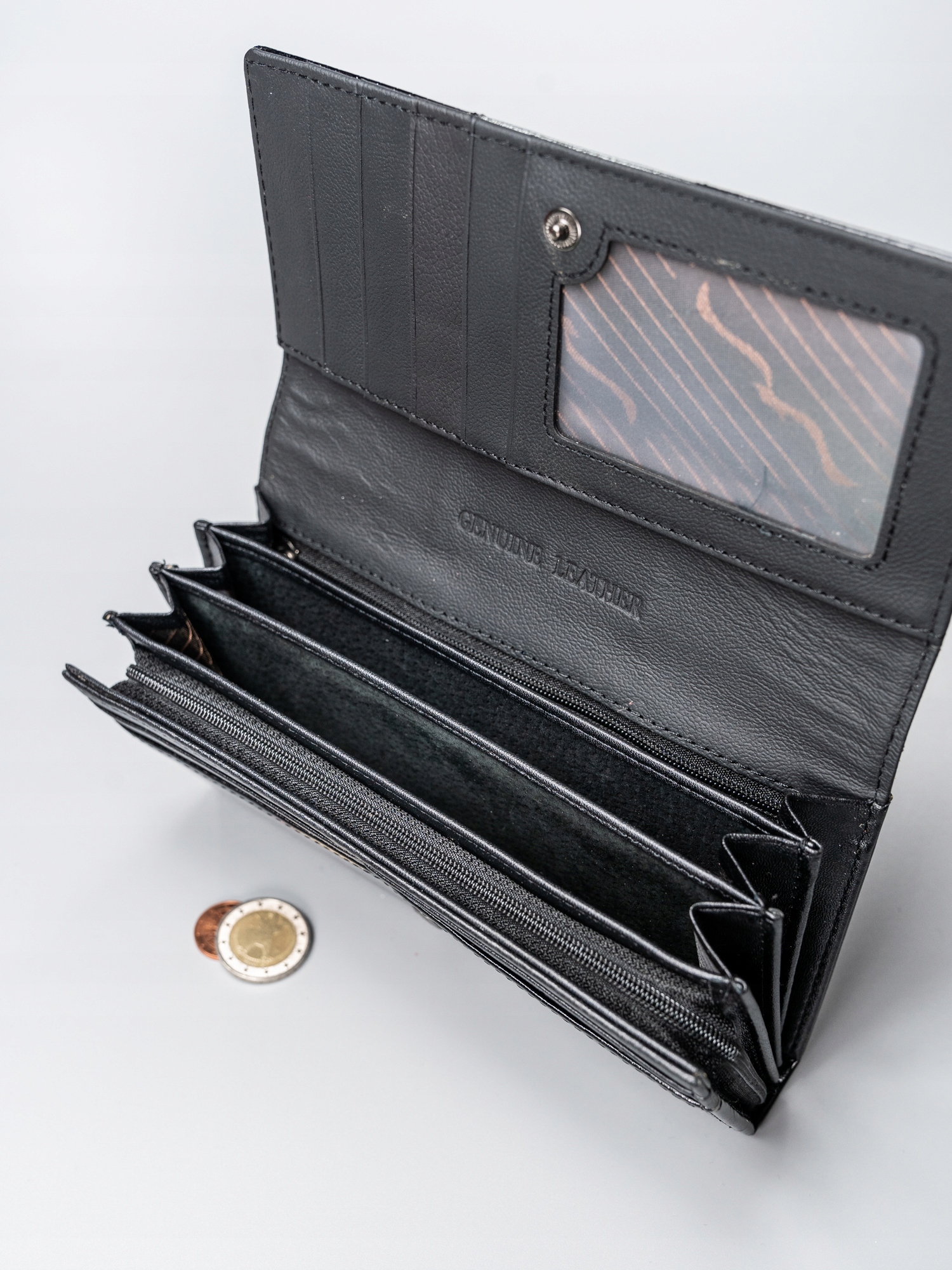 Osupljiva ženska denarnica z neverjetnim vzorcem v temno srebrnem odtenku.