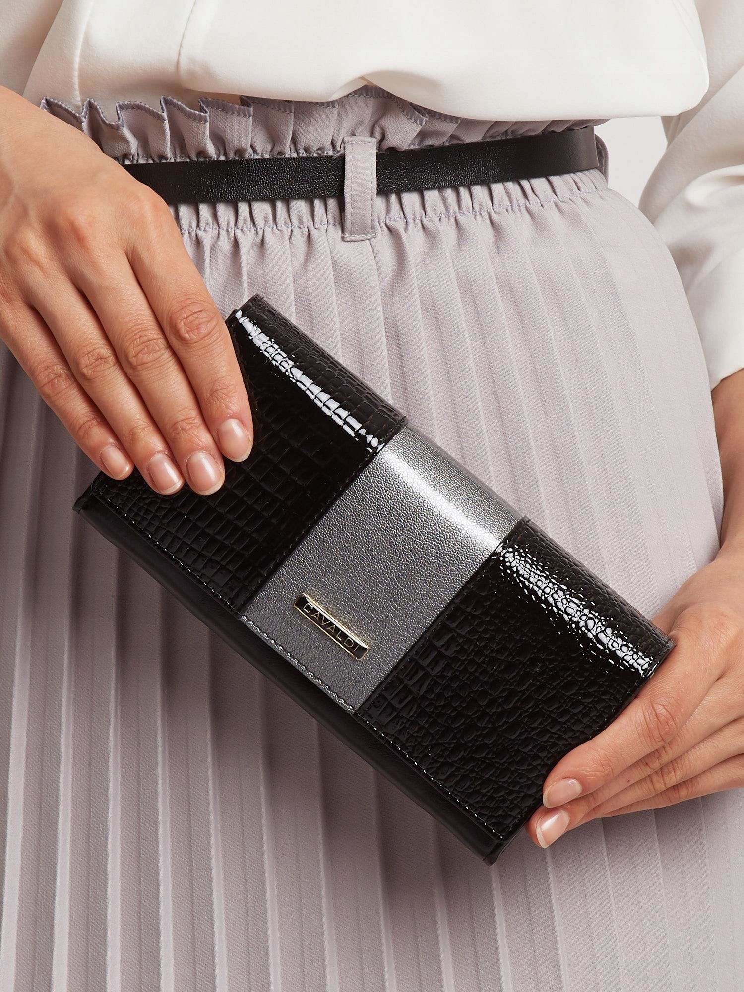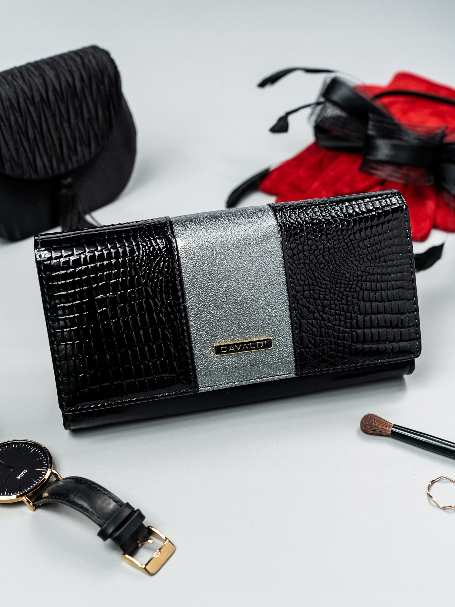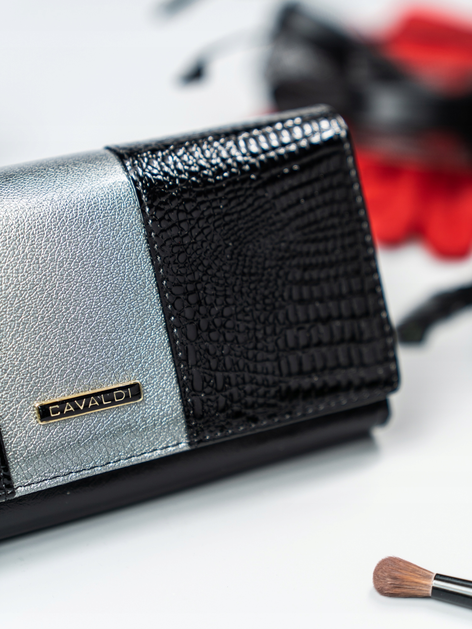 Predstavljamo vam neverjetno, elegantno žensko usnjeno denarnico iz najnovejše kolekcije CAVALDI. Denarnica je izdelana v osupljivem srebrnem laku.