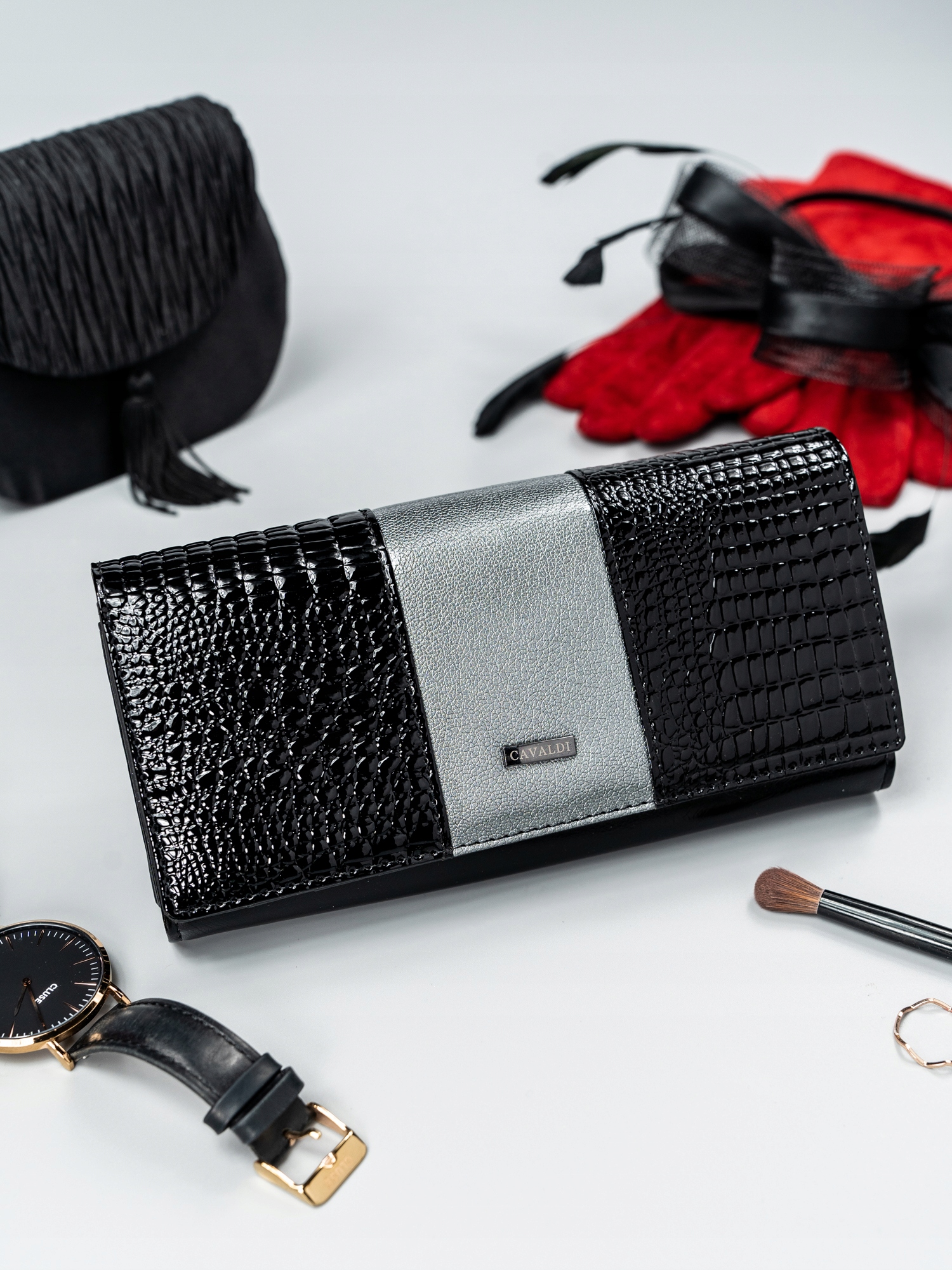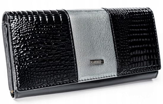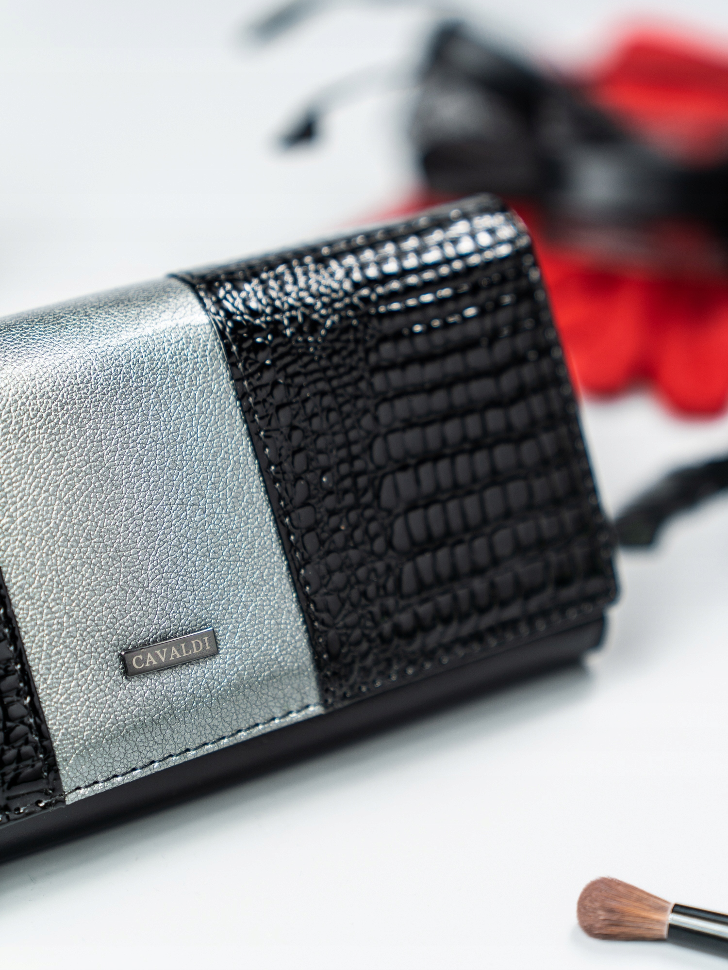 Predstavljamo vam neverjetno, elegantno žensko usnjeno denarnico iz najnovejše kolekcije CAVALDI. Denarnica je izdelana v osupljivem srebrnem laku.