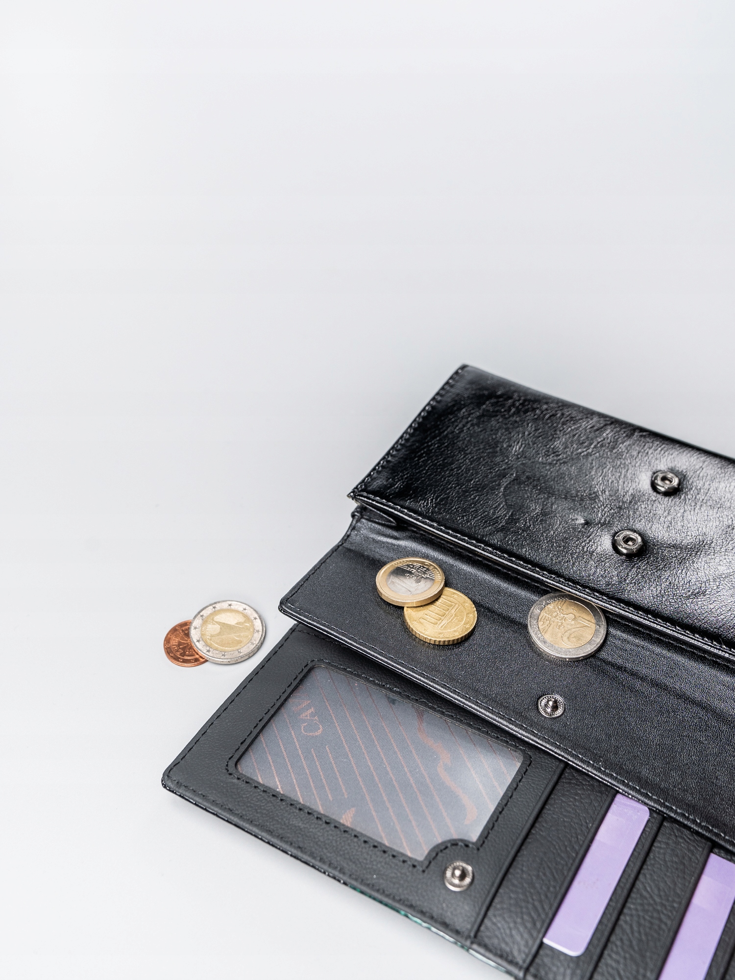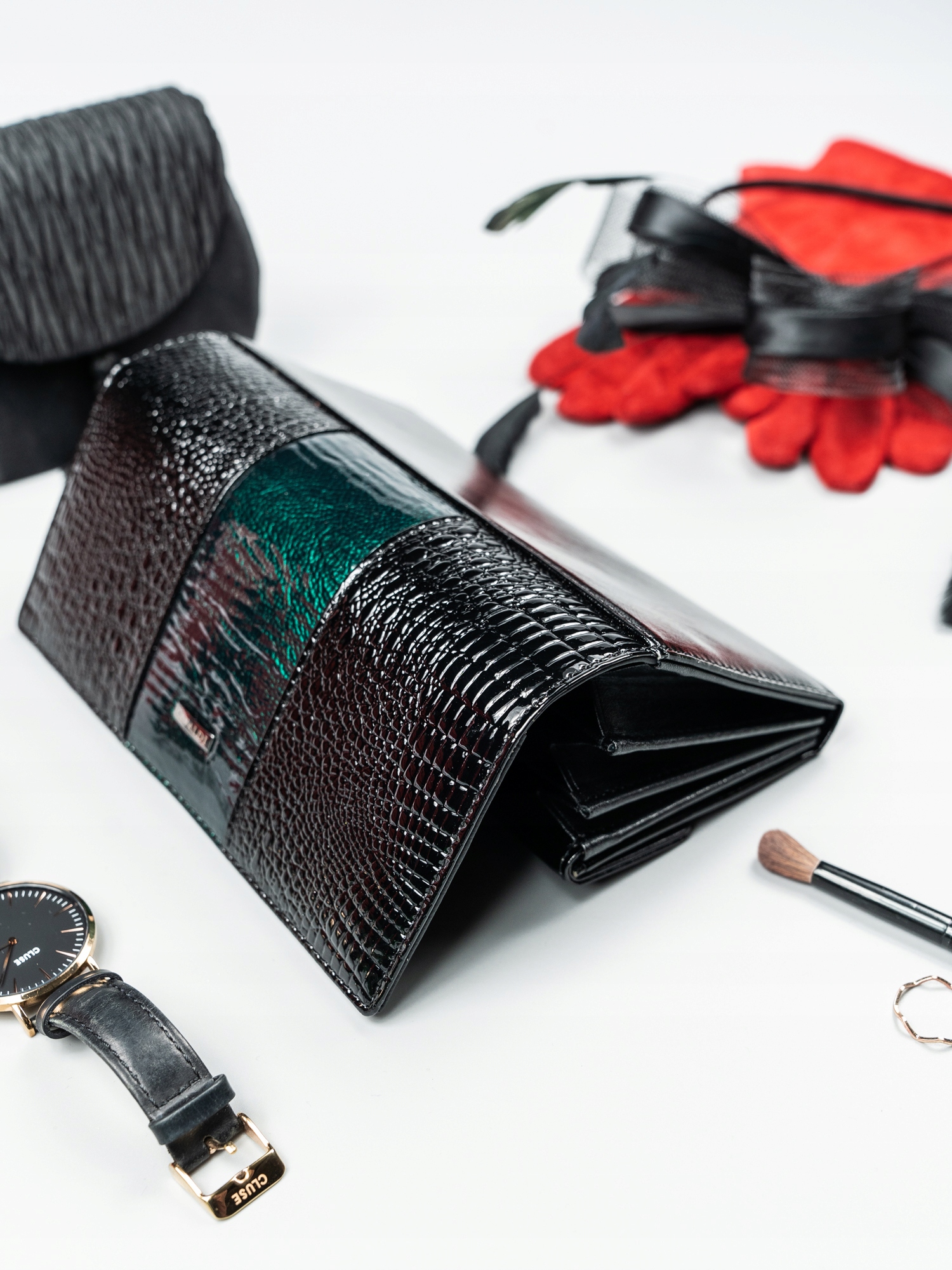 Osupljiva ženska denarnica z neverjetnim vzorcem v temno zeleni barvi.