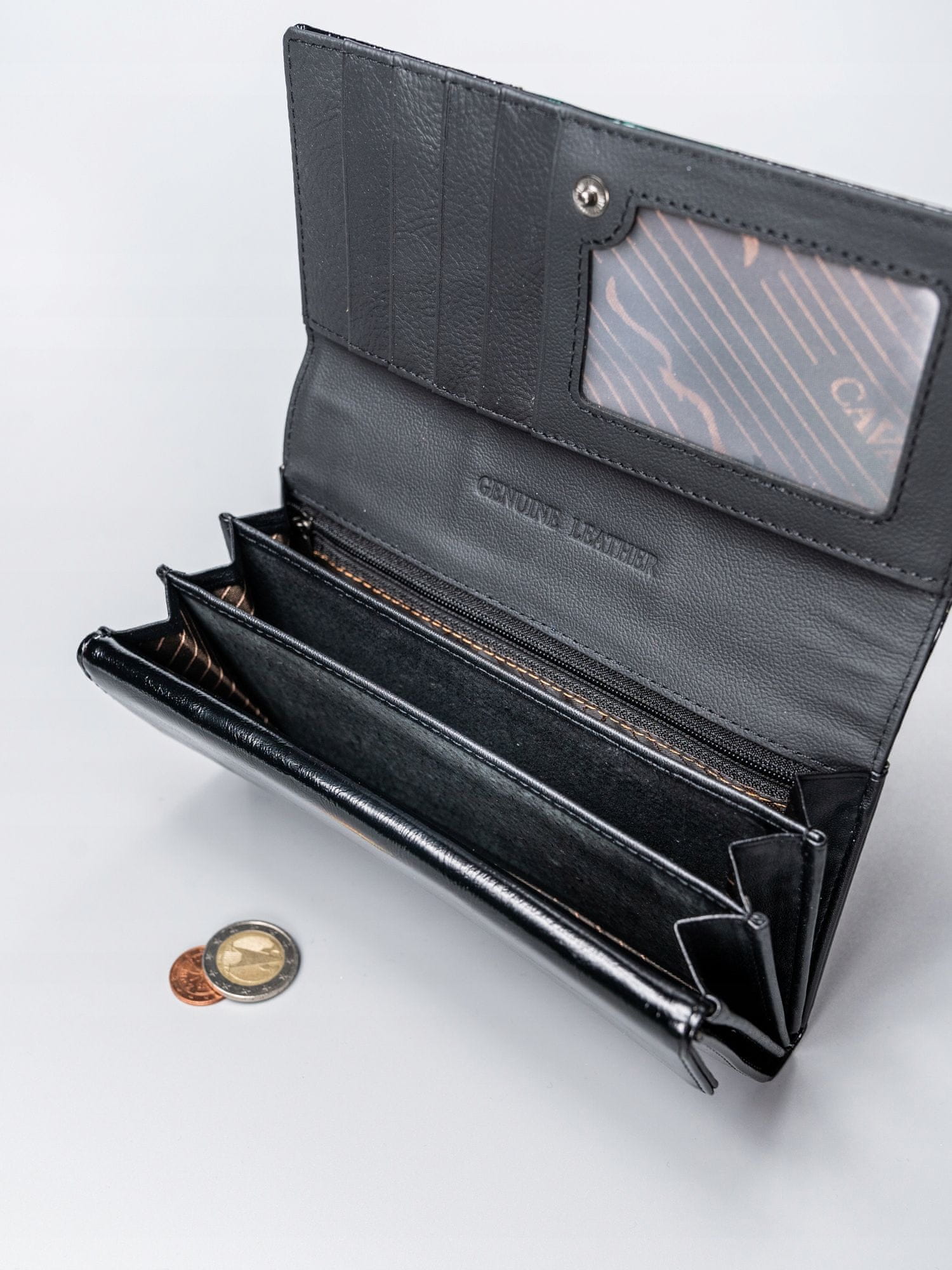Izdelana iz najkakovostnejšega naravnega in eko usnja, patentirana na zunanji strani in mat na notranji strani. Na sprednji strani je logotip CAVALDI. Vsaka denarnica ima edinstven slog in značaj. Zasnovano v skladu z najnovejšimi trendi. Popolna možnost za vsako žensko. Odlična kakovost, brezhibna izdelava in edinstven videz – to je naša popolna možnost za vas.