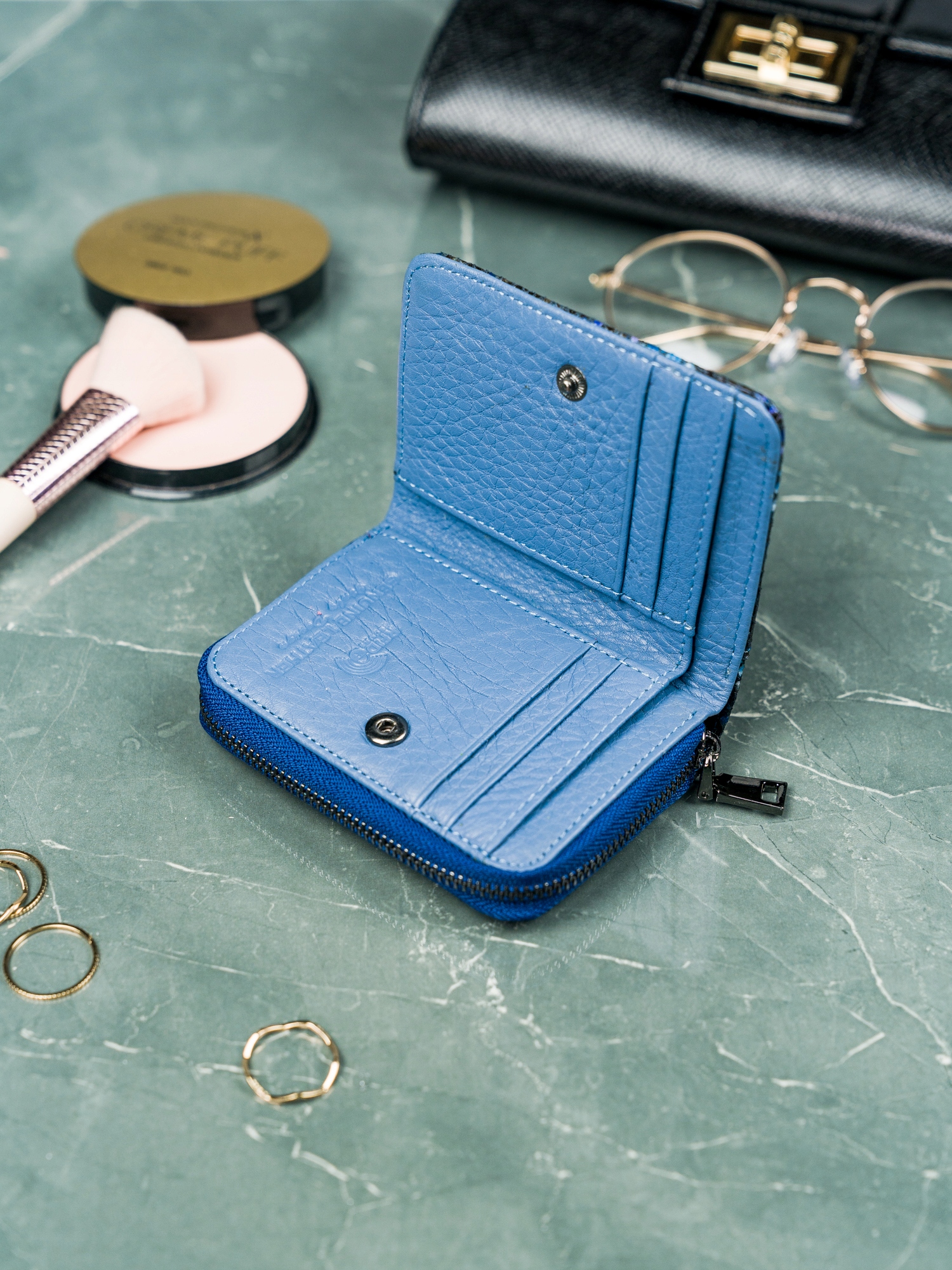 Denarnica se zapenja s klikom. Ko ga odprete, se razkrije prostoren predal z: