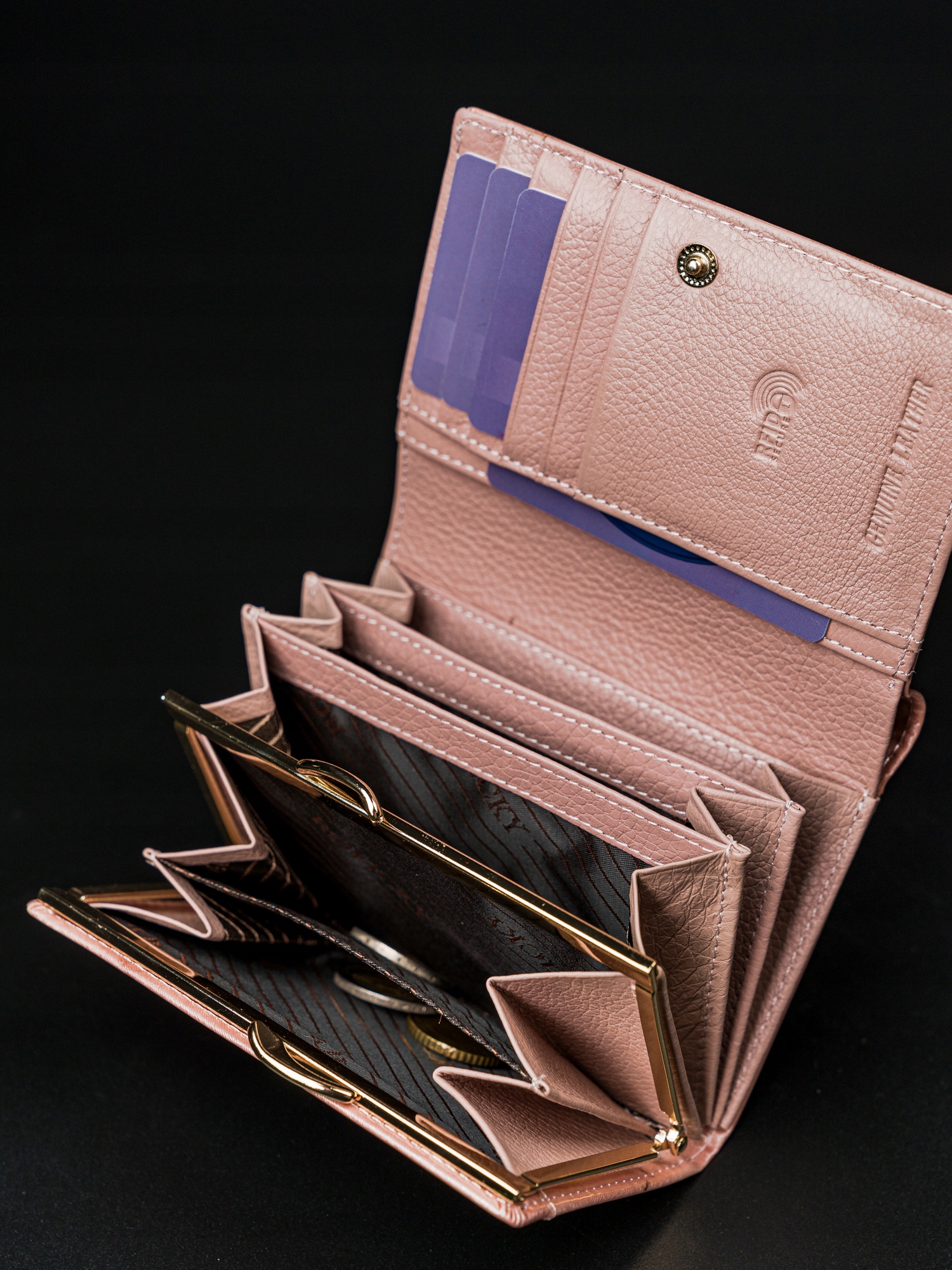 bankovce obstaja ločen predal, ki se razteza praktično čez celotno širino denarnice; Žepi za denar so prav tako podloženi