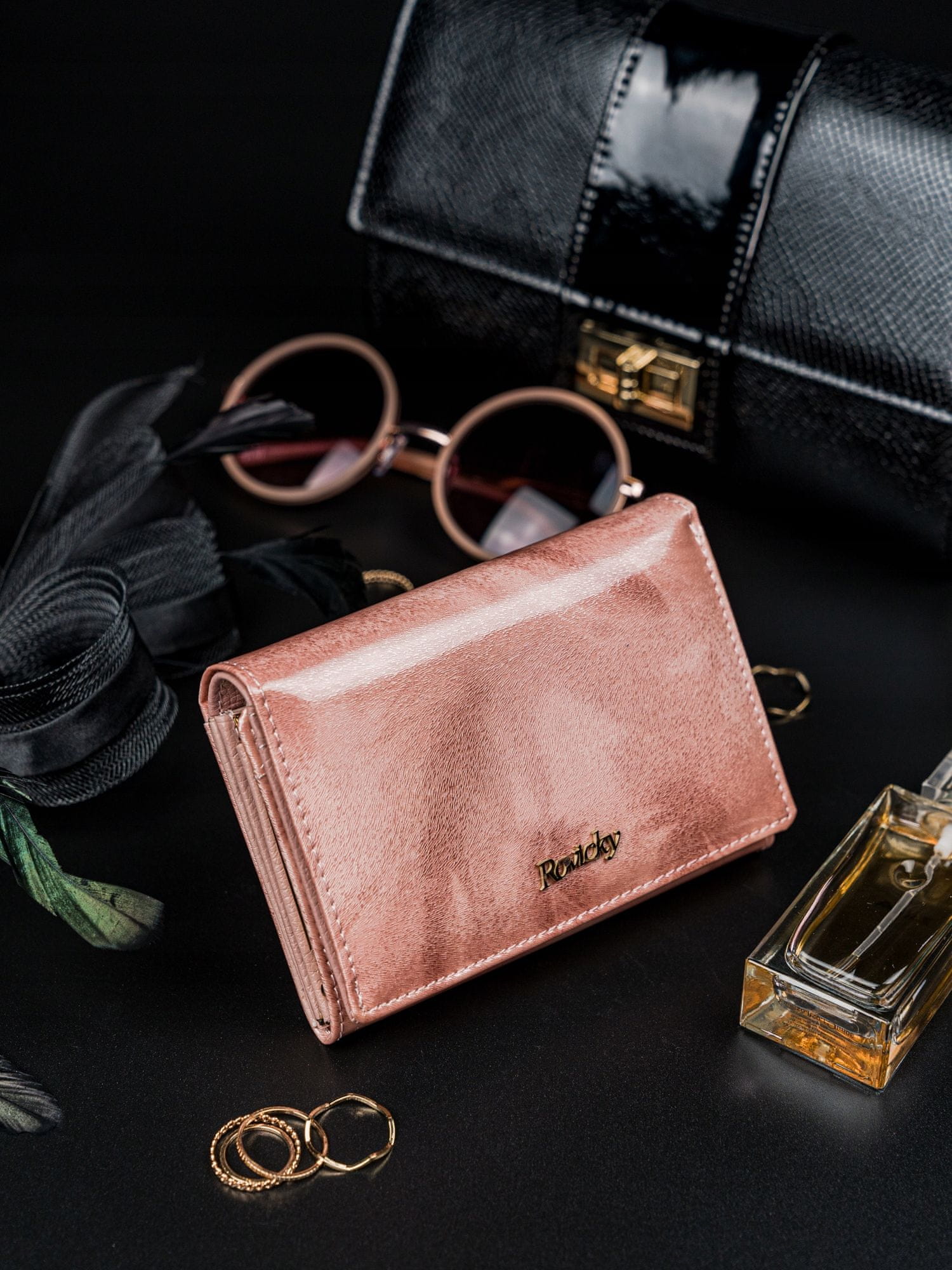 Denarnica iz najnovejše kolekcije Rovicky® je kombinacija umirjene elegance in klasične elegance, ki se odlično dopolnjujeta in vam zagotavljata ne le visokokakovosten izdelek, temveč tudi univerzalen dizajn, ki bo dopolnil vaš slog. Lakasto usnje je nedvomno vrhunec zunanjosti denarnice, notranjost pa se ponaša z vrhunskim mat zaključkom. Sprednja stran denarnice ima nežen, pozlačen logotip.
