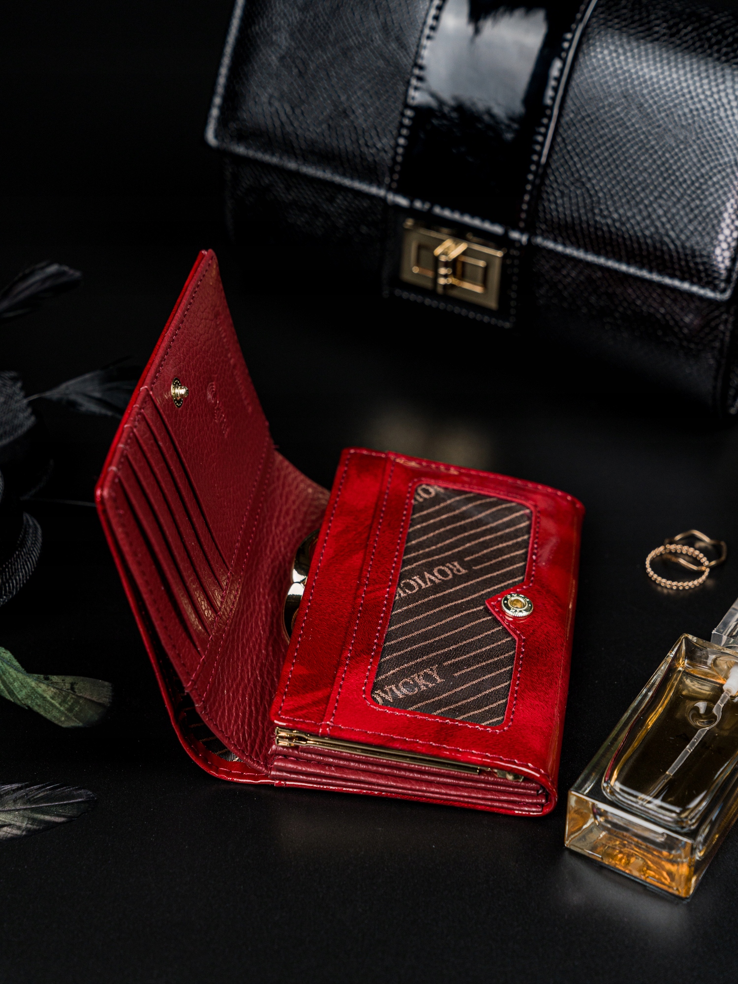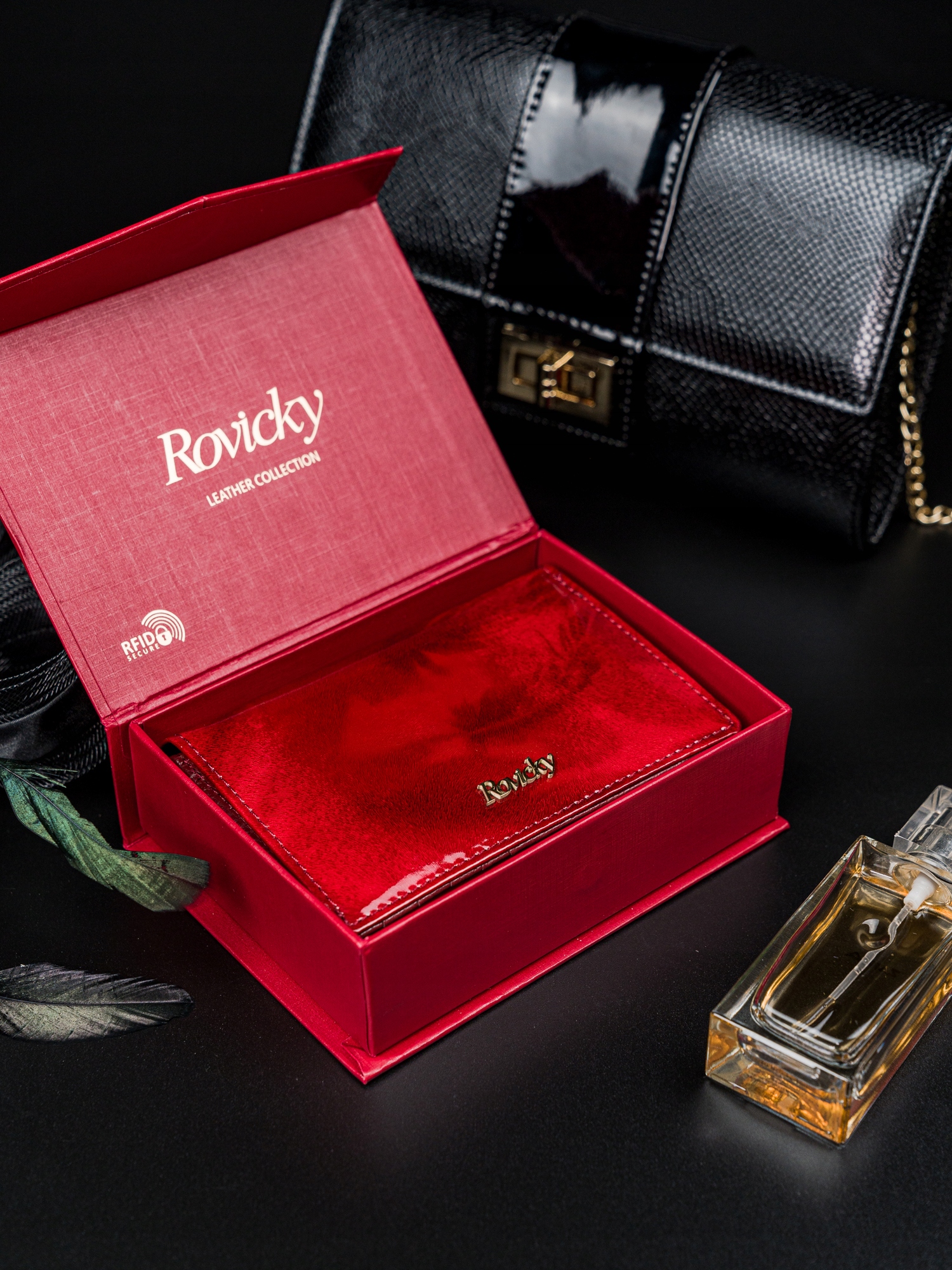 Denarnica iz najnovejše kolekcije Rovicky® je kombinacija umirjene elegance in klasične elegance, ki se odlično dopolnjujeta in vam zagotavljata ne le visokokakovosten izdelek, temveč tudi univerzalen dizajn, ki bo dopolnil vaš slog. Lakasto usnje je nedvomno vrhunec zunanjosti denarnice, notranjost pa se ponaša z vrhunskim mat zaključkom. Sprednja stran denarnice ima nežen, pozlačen logotip.