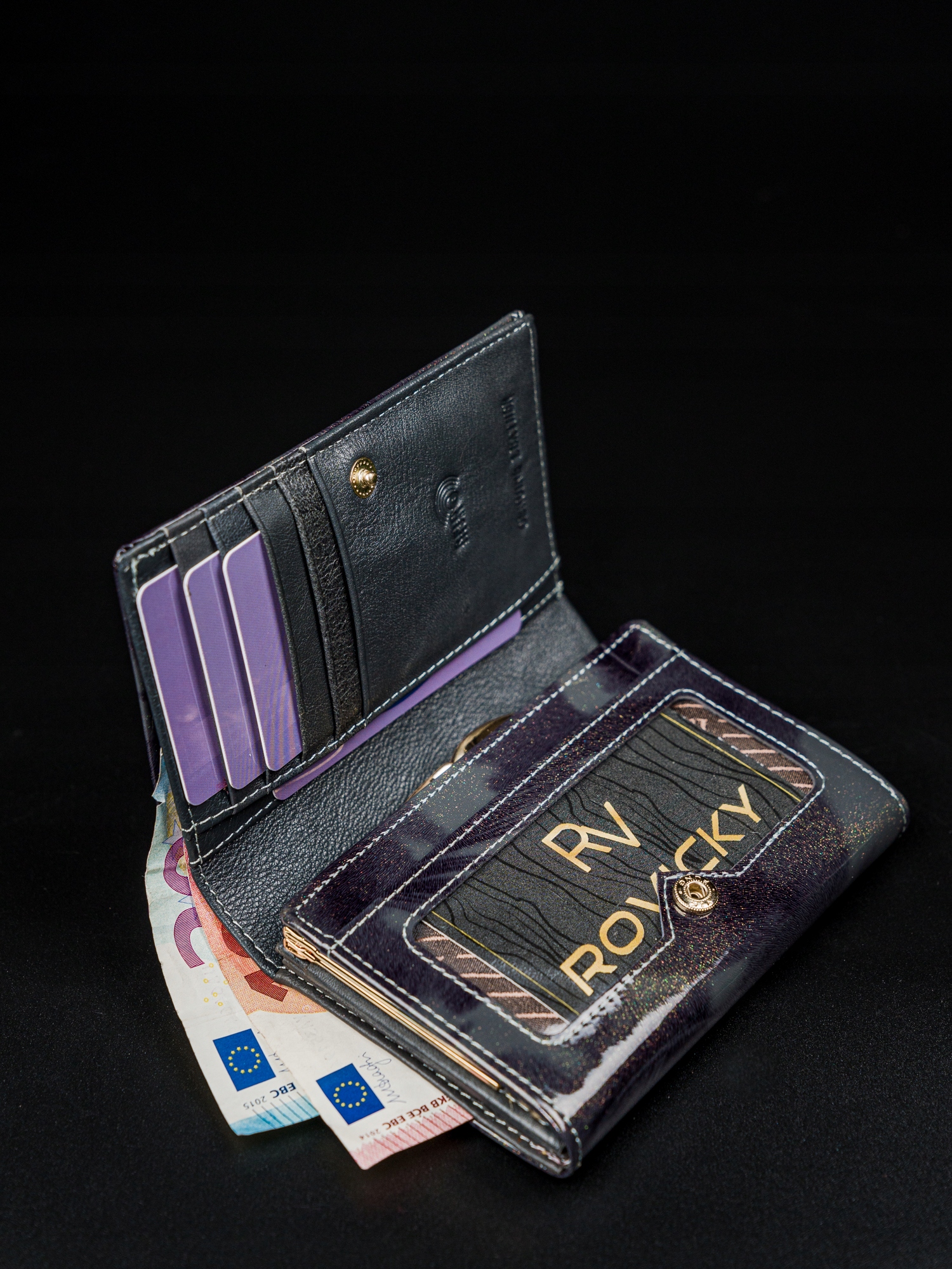 RFID je tehnologija, ki uporablja radijske valove za prenos podatkov. Uporablja se v tehnologiji brezstičnih bančnih kartic. Rovicky denarnice z RFID zaščito imajo v notranjosti poseben material, ki ščiti bančne kartice pred napadi RFID čitalnikov. Kako deluje – z denarnico v žepu hlač, žepu jakne itd. lahko nekdo postavi čitalnik črtne kode blizu žepa in skenira podatke kartice. Če je vaša kartica v denarnici, zaščiteni z RFID, čitalnik ne bo deloval. Vaše kartice/denar so varni!