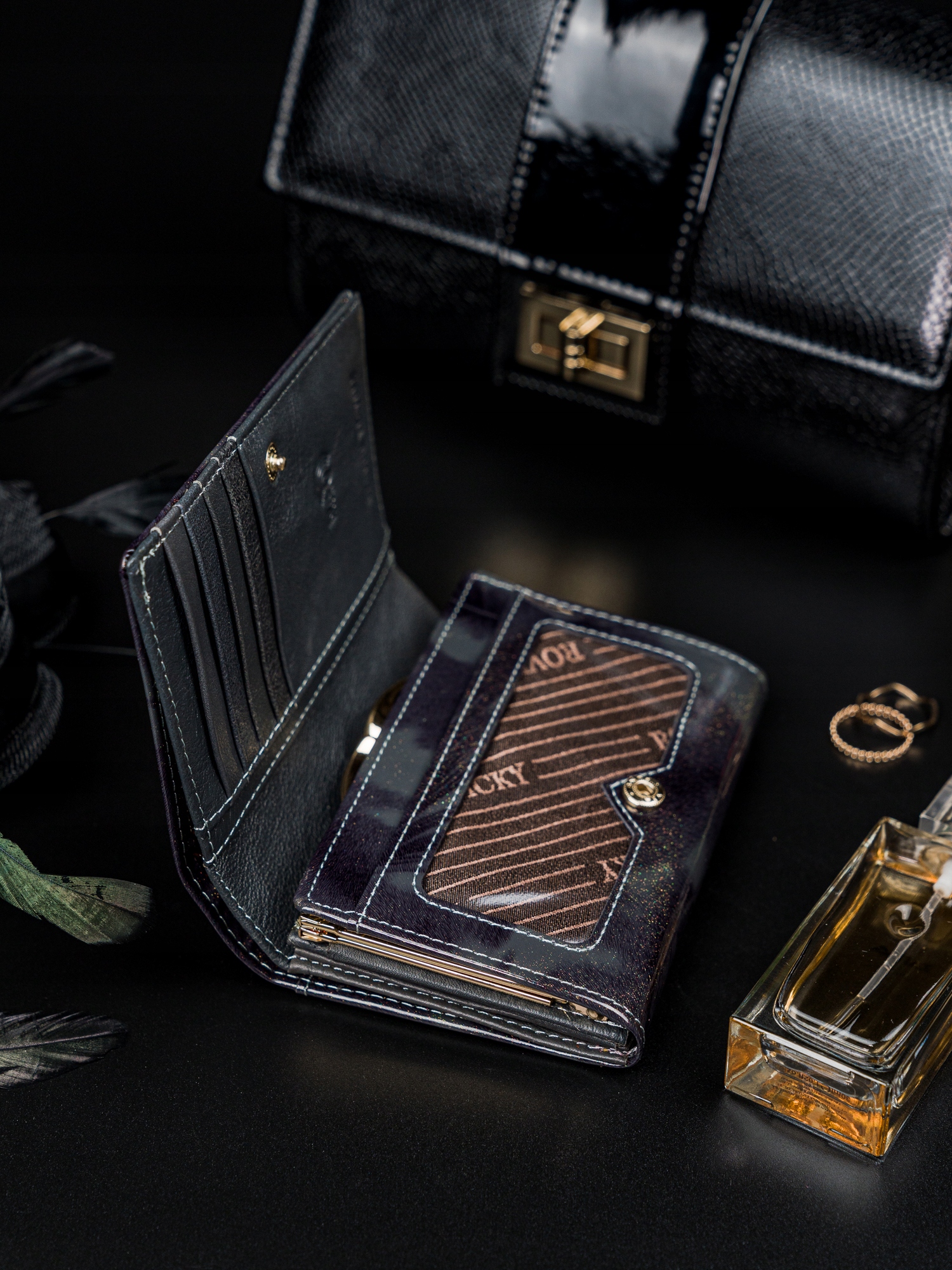 Denarnica iz najnovejše kolekcije Rovicky® je kombinacija umirjene elegance in klasične elegance, ki se odlično dopolnjujeta in vam zagotavljata ne le visokokakovosten izdelek, temveč tudi univerzalen dizajn, ki bo dopolnil vaš slog. Lakasto usnje je nedvomno vrhunec zunanjosti denarnice, notranjost pa se ponaša z vrhunskim mat zaključkom. Sprednja stran denarnice ima nežen, pozlačen logotip.