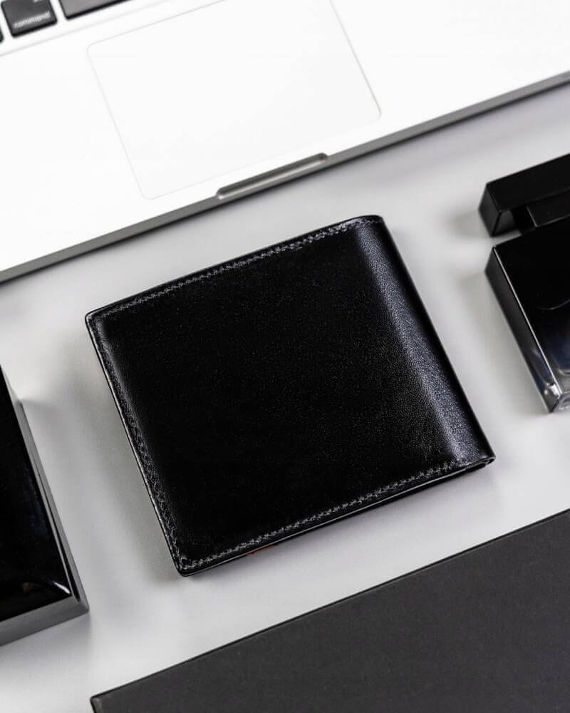 | Črna denarnica z rdečim poudarkom na sprednji strani; |