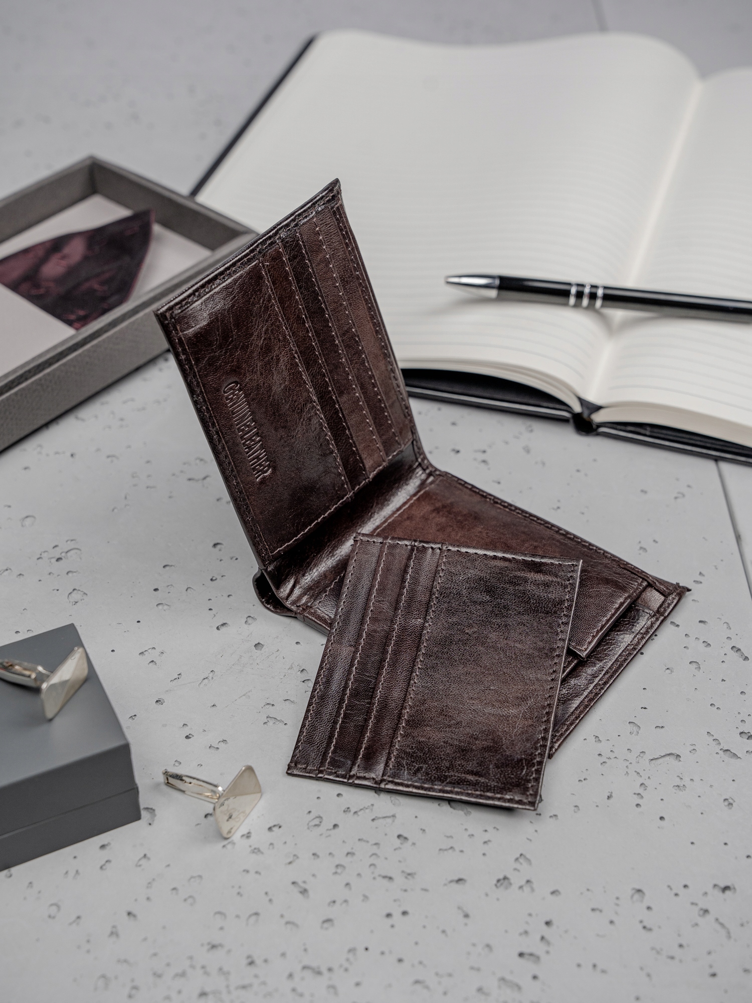 Elegantna moška denarnica s klasičnim dizajnom. Zahvaljujoč premišljeni razporeditvi žepov in rež za kartice bo vanjo shranila vse vaše potrebne dokumente in denar.