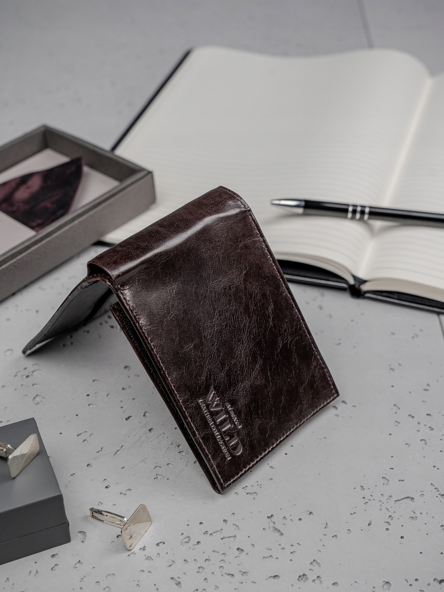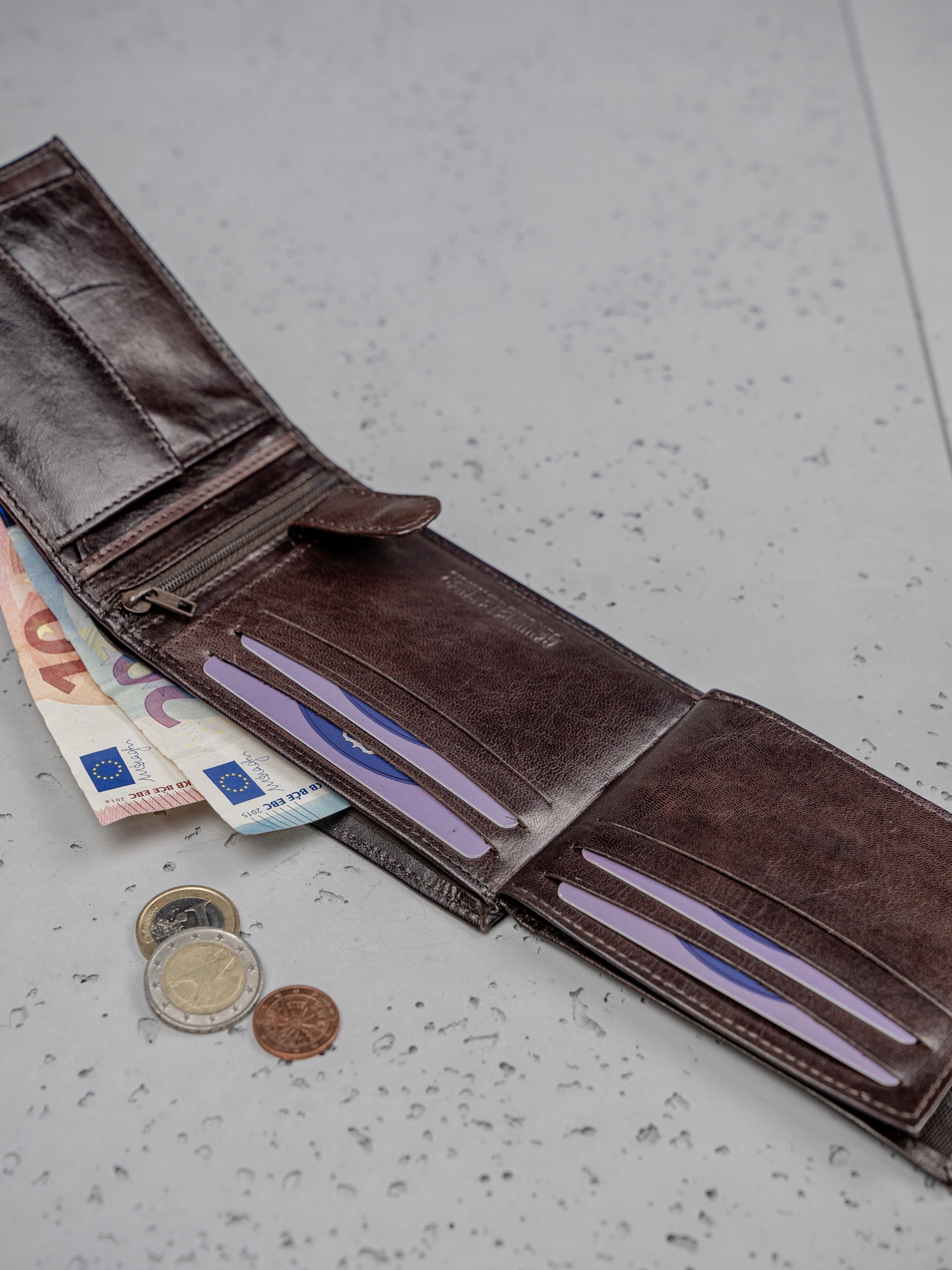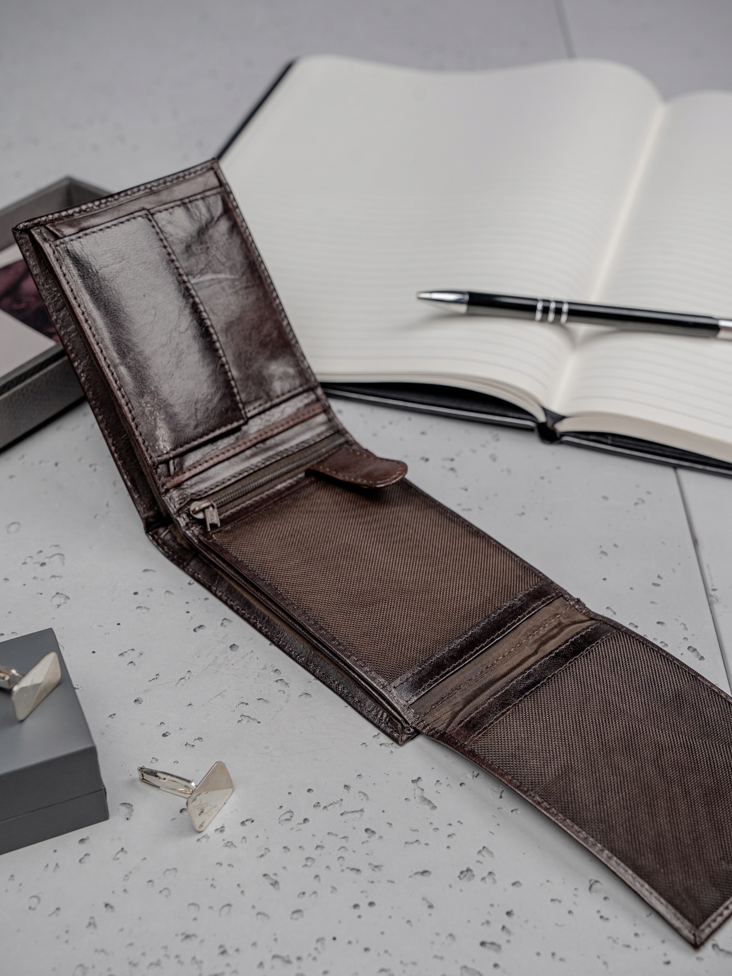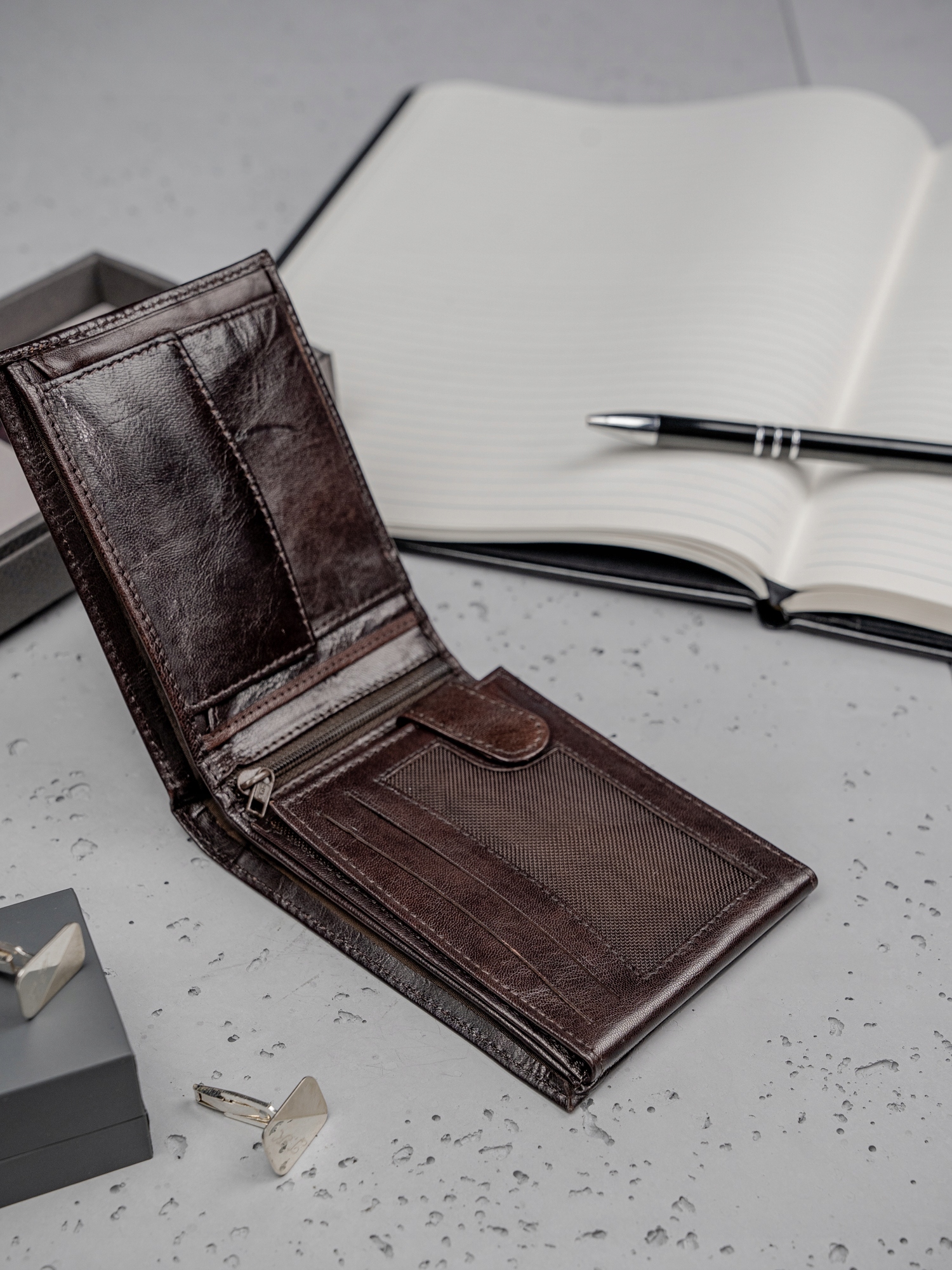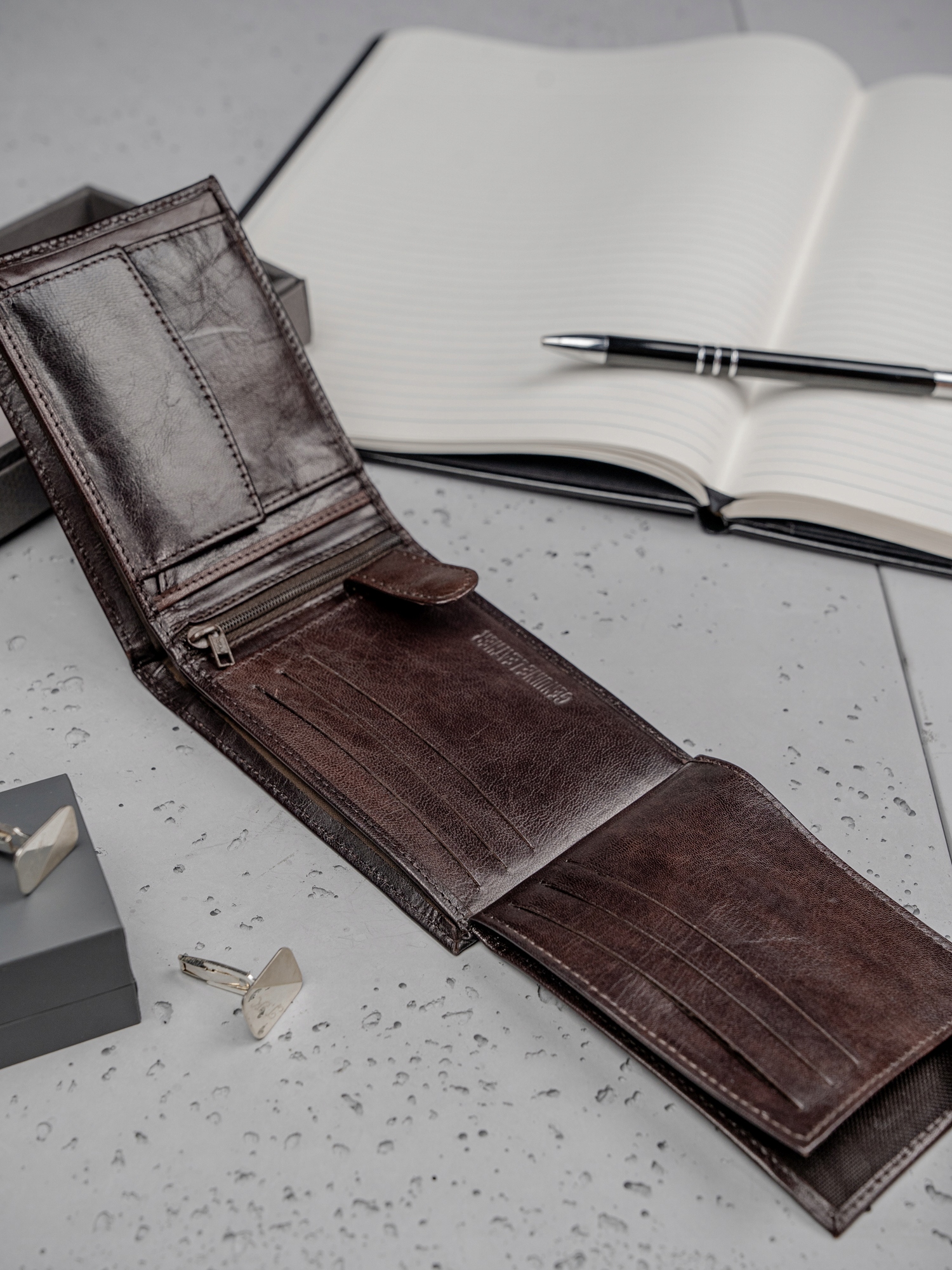 Prostorna in funkcionalna denarnica – model za najzahtevnejše kupce. Izdelek je temno rjave barve, v kateri se boste zagotovo počutili udobno.
