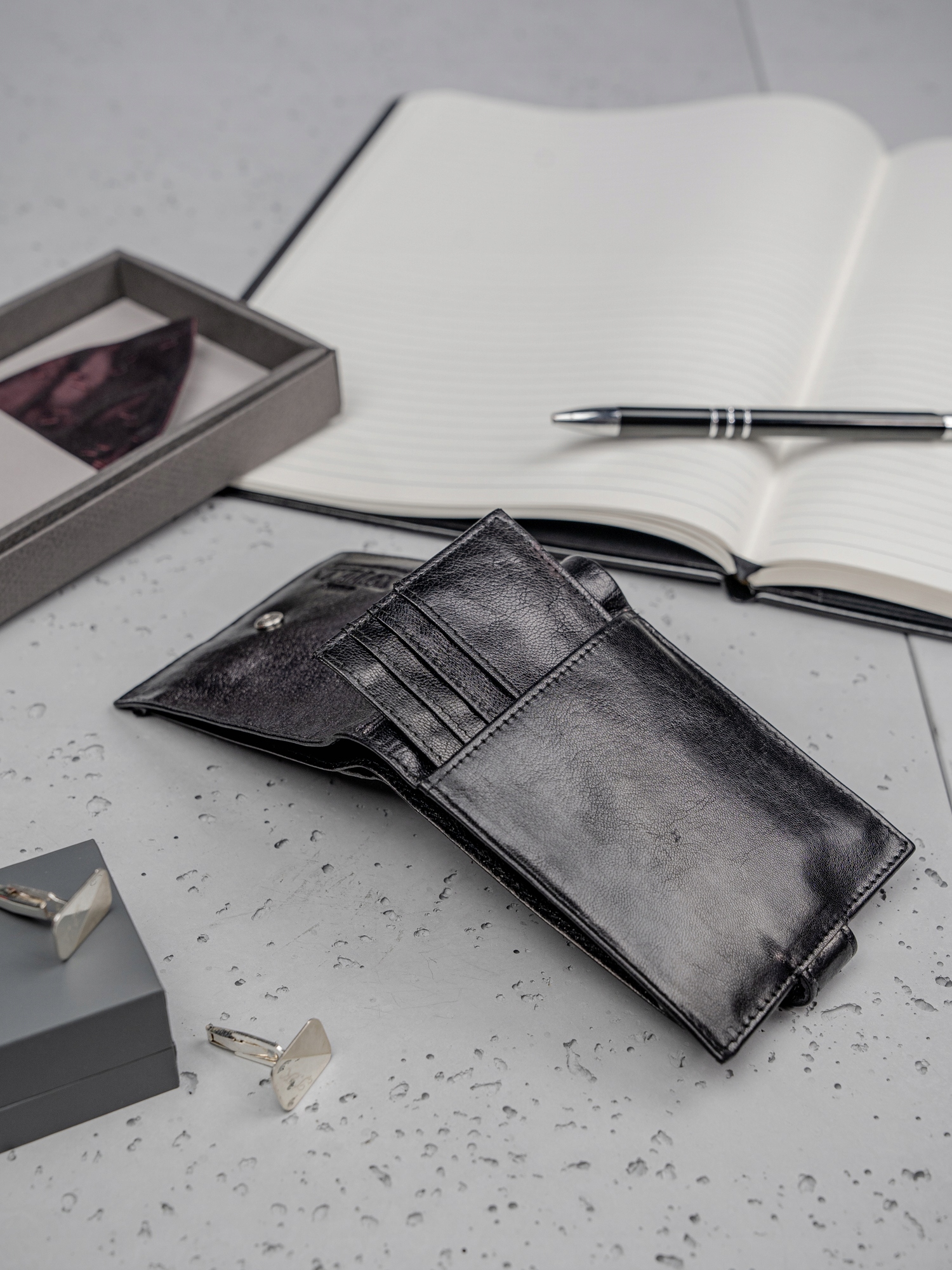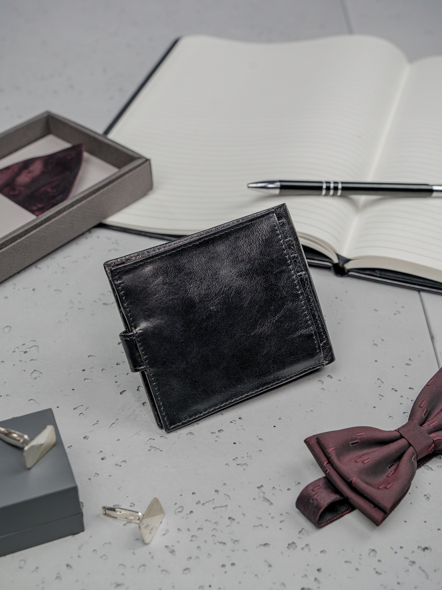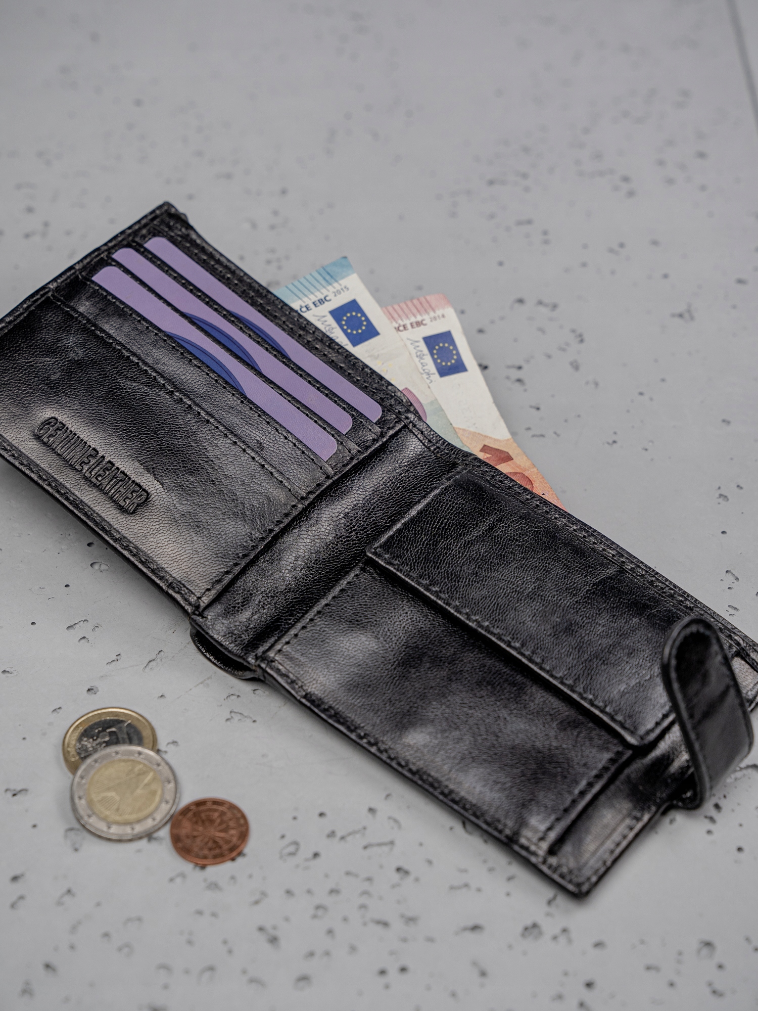 Elegantna moška denarnica s klasičnim dizajnom. Zahvaljujoč premišljeni razporeditvi žepov in rež za kartice bo vanjo shranila vse vaše potrebne dokumente in denar.