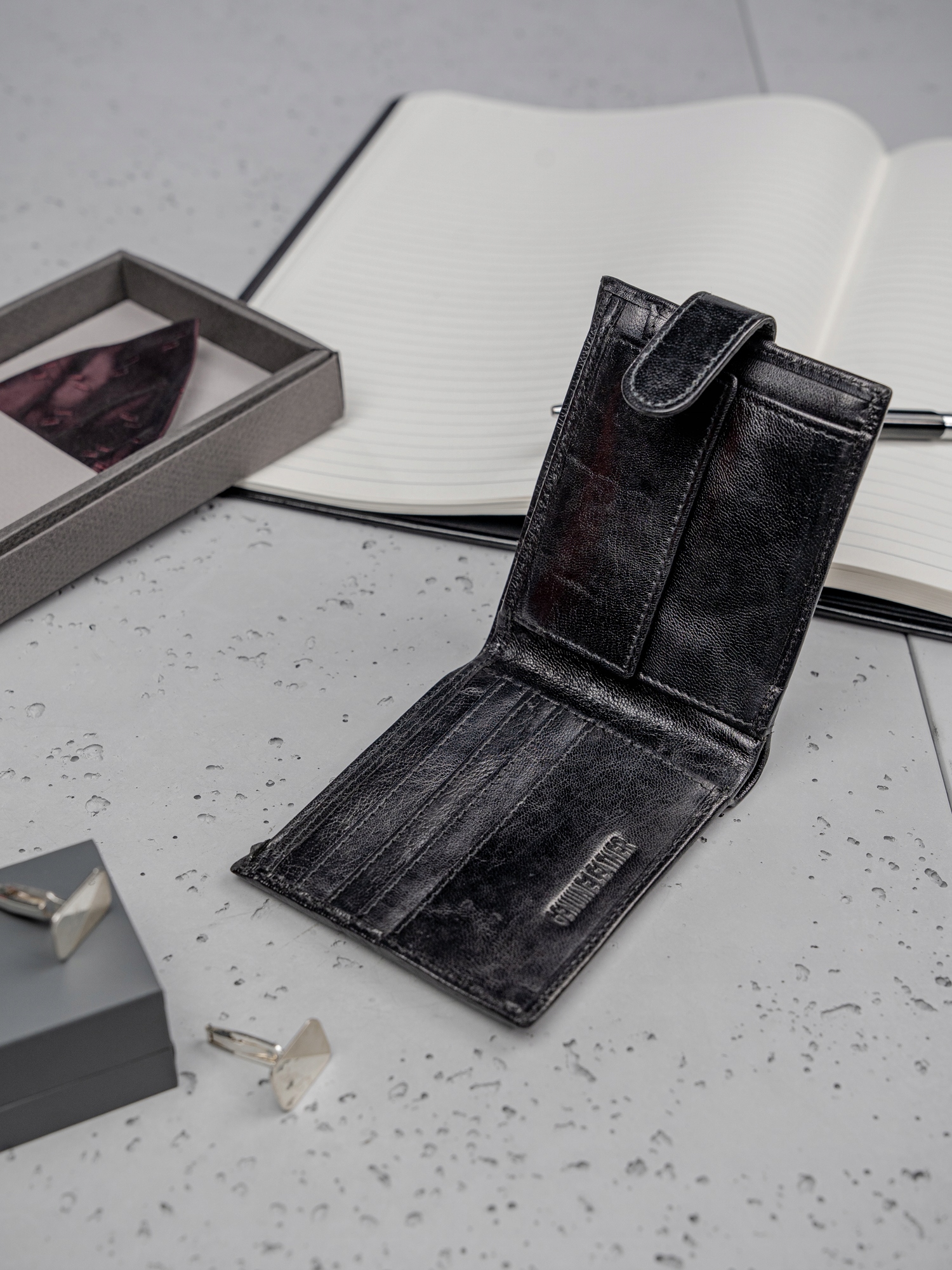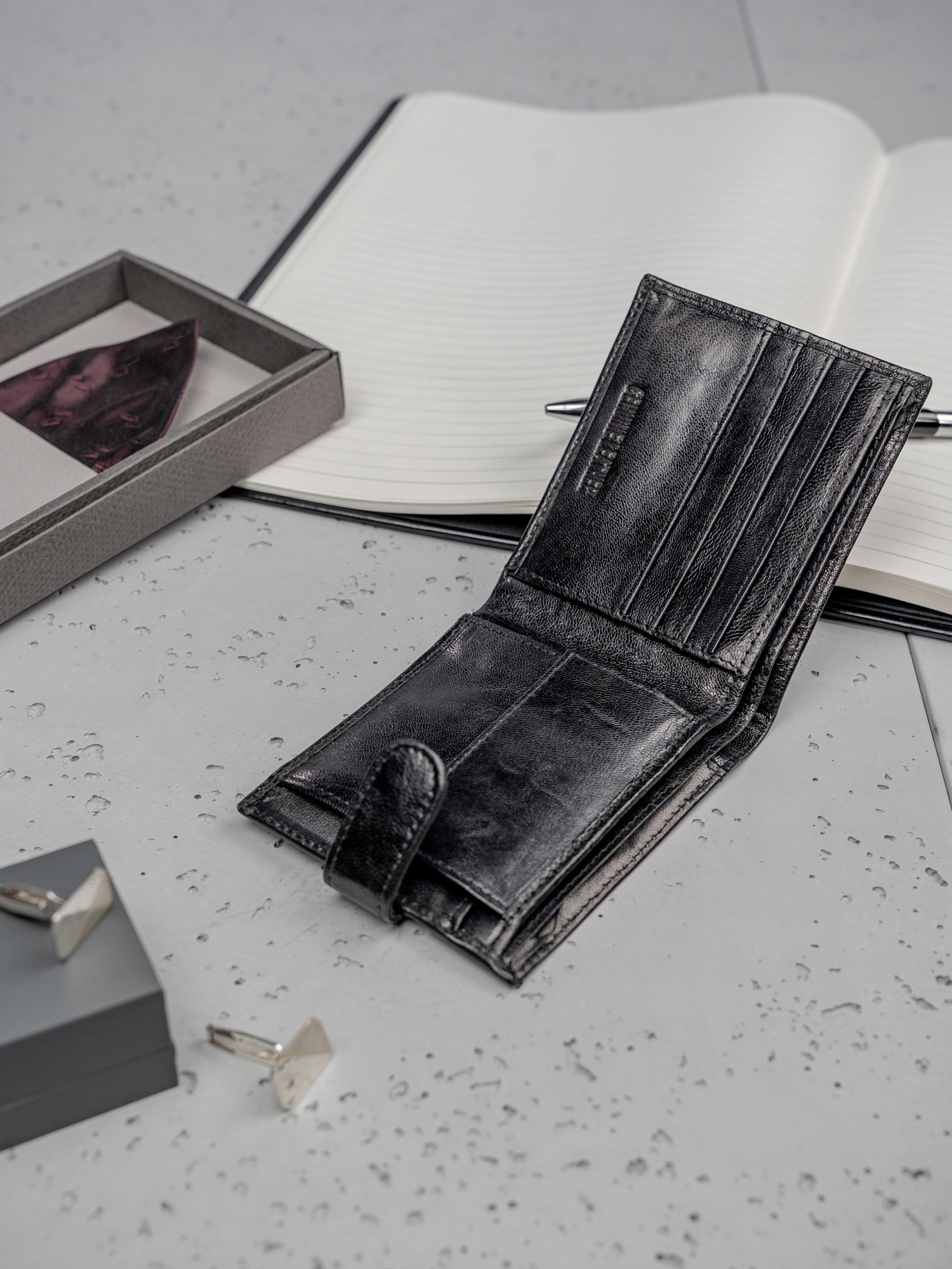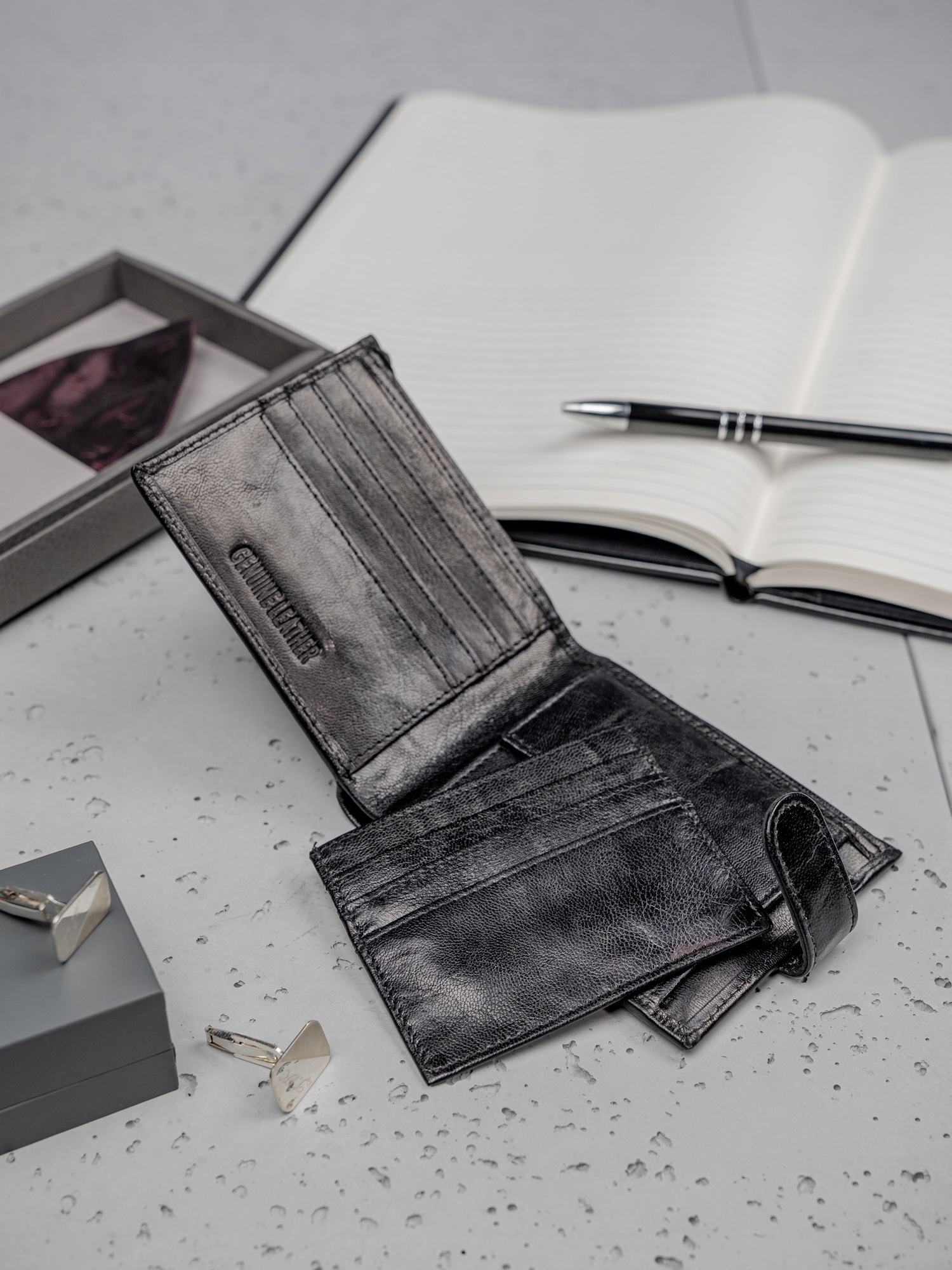 Elegantna moška denarnica s klasičnim dizajnom. Zahvaljujoč premišljeni razporeditvi žepov in rež za kartice bo vanjo shranila vse vaše potrebne dokumente in denar.