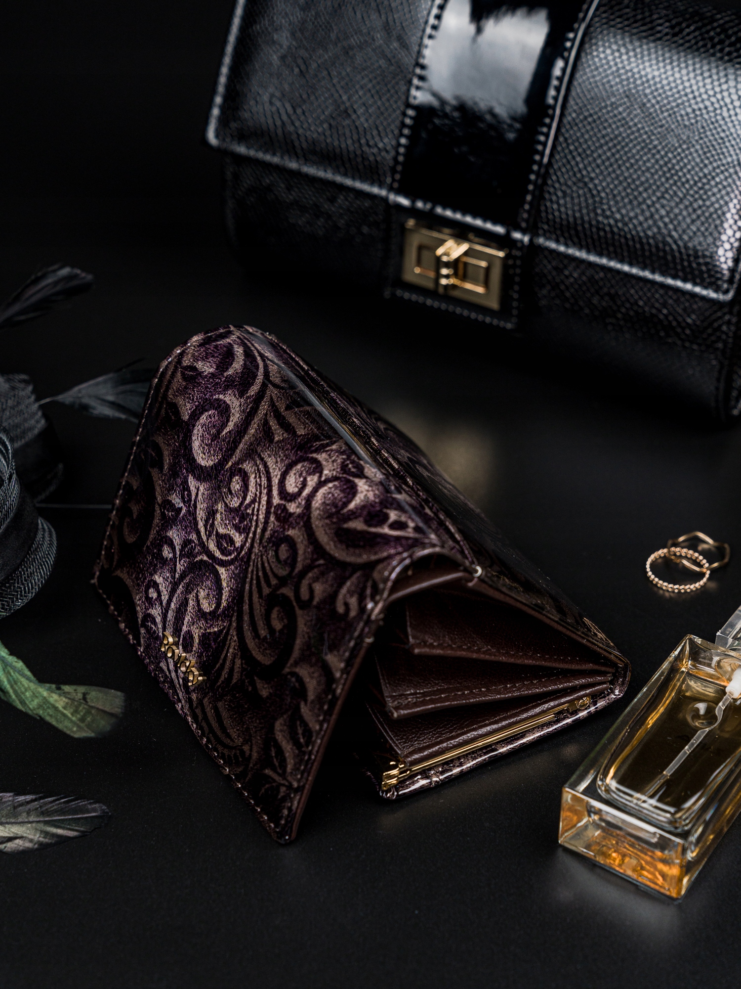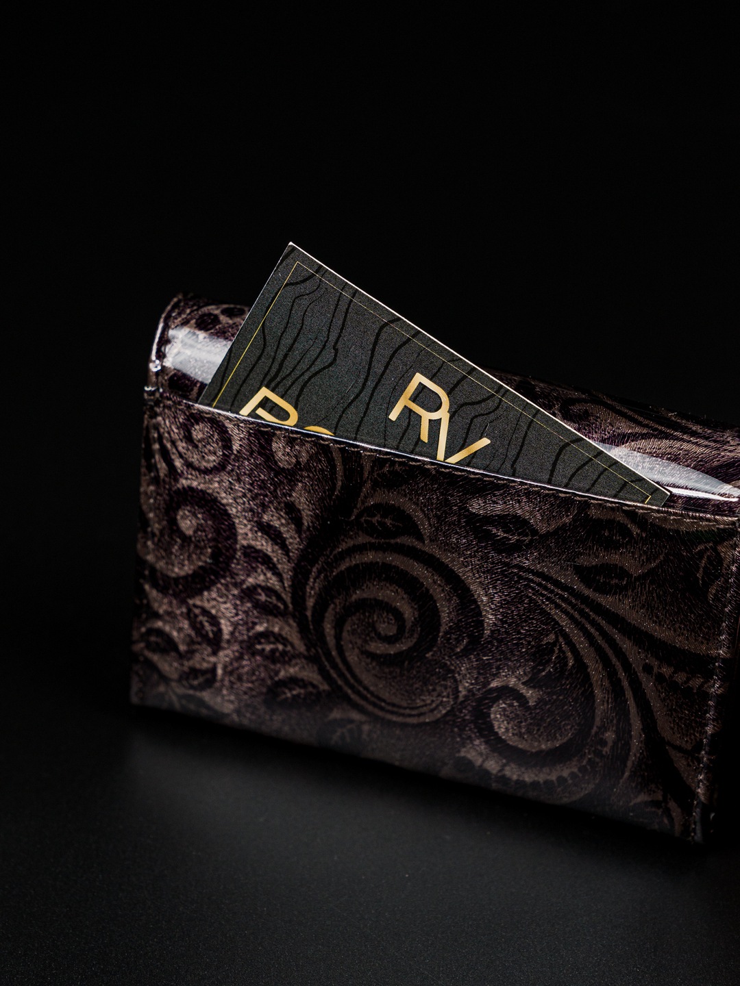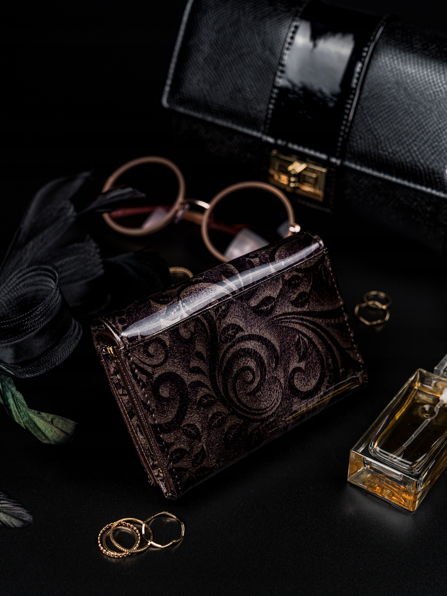 Edinstvena denarnica v črni barvi, vedno modna, z edinstvenim žakardovim okrasjem, ki spominja na 3D dizajn mačjega očesa, ki ga zagotovo prepoznate iz kozmetičnih salonov. Odslej lahko vaša denarnica odlično dopolnjuje vašo manikuro. Izdelek je na sprednjem zavihku okrašen z pozlačenim logotipom, ki ustvarja neverjetno eleganten in okusen videz.