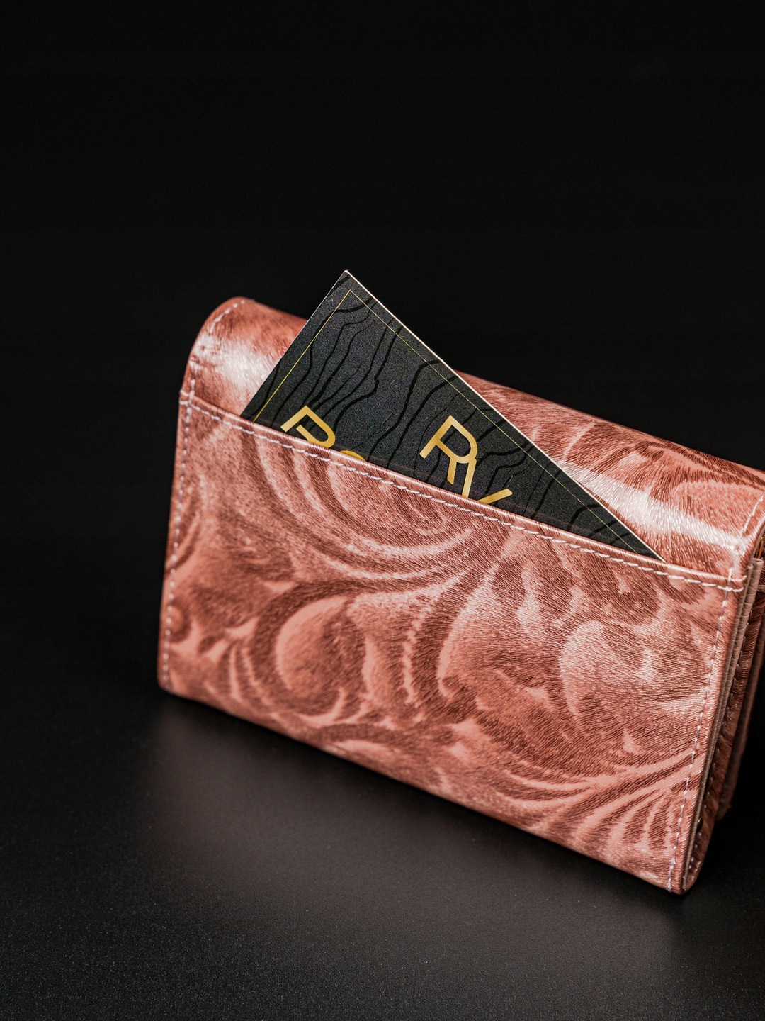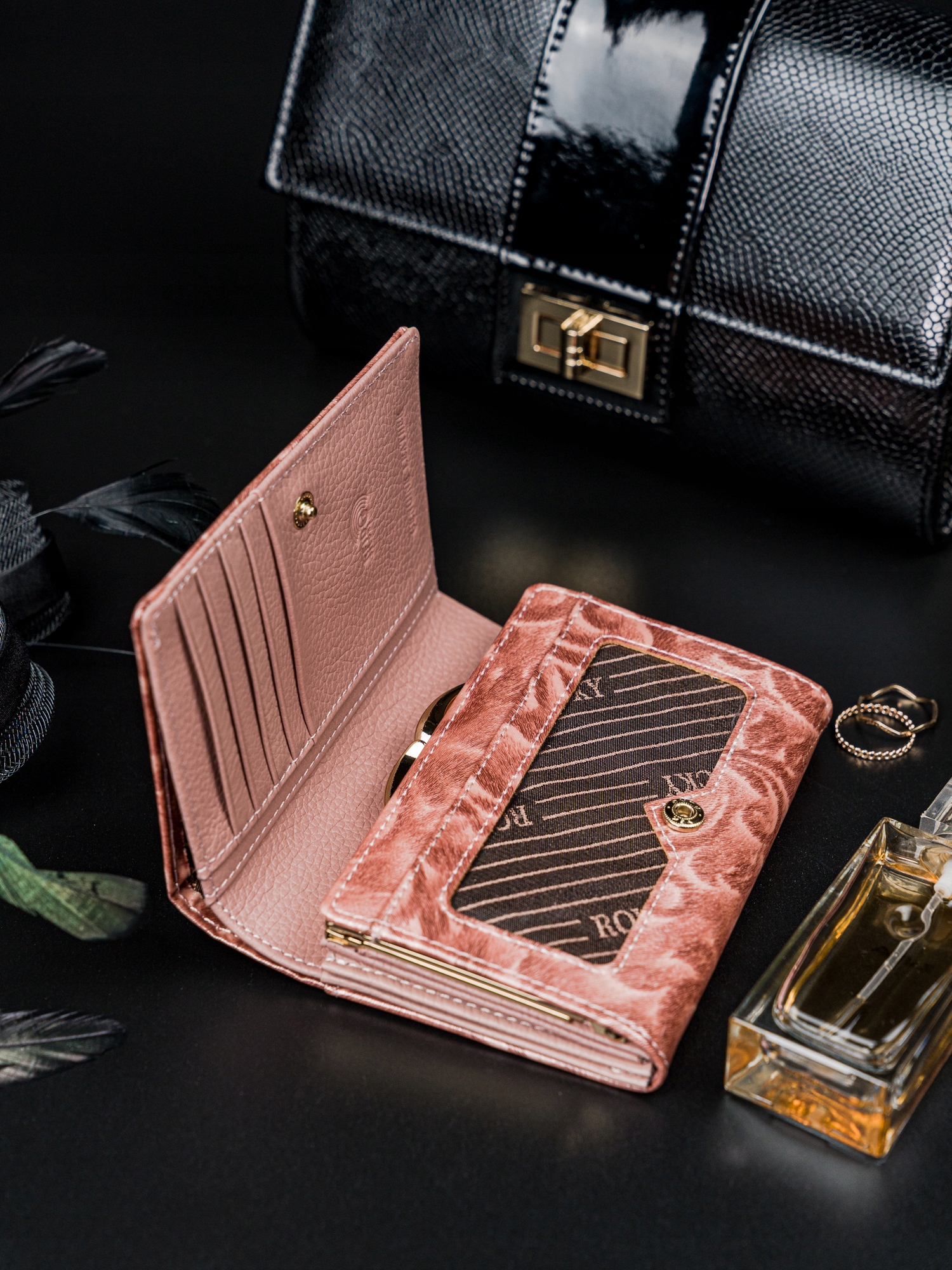 Unikatna denarnica v brezčasno modni roza barvi z edinstvenim žakardovim okrasjem, ki spominja na 3D dizajn mačjega očesa, ki ga zagotovo prepoznate iz kozmetičnih salonov. Odslej lahko vaša denarnica odlično dopolnjuje vašo manikuro. Izdelek je na sprednjem zavihku okrašen z pozlačenim logotipom, ki ustvarja neverjetno eleganten in okusen videz.
