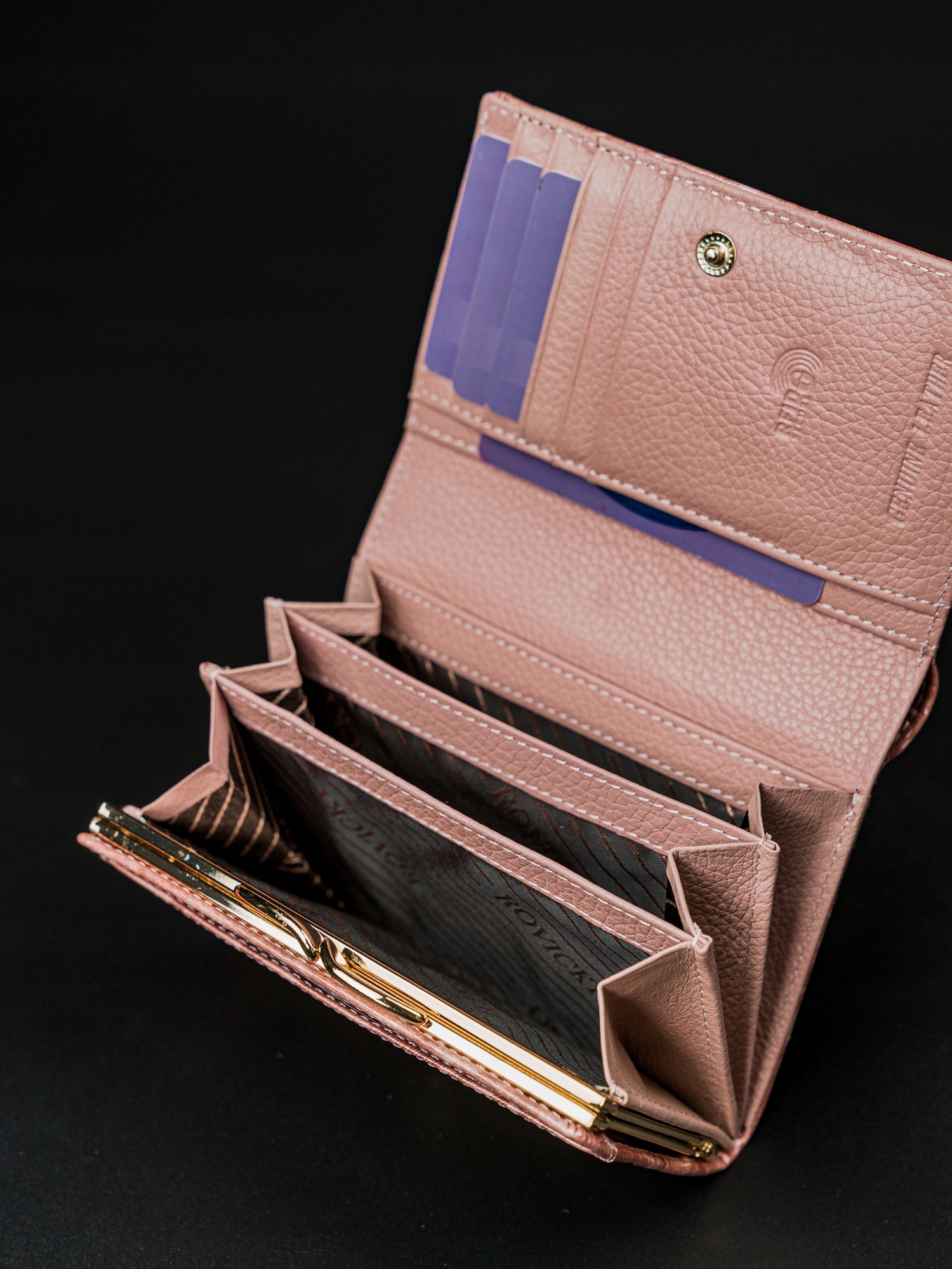 Na zadnji strani denarnice je všit odprt žep. To je zelo priročna rešitev za dokumente, ki jih pogosto uporabljate. Ni vam treba odpreti celotne denarnice, da bi jo vzeli ven.