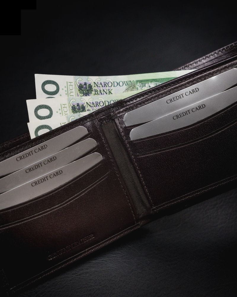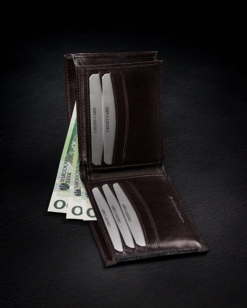 Opremljena z tehnologijo RFID STOP, ki ščiti denarnico pred tatovi, ki uporabljajo čitalnike kartic.