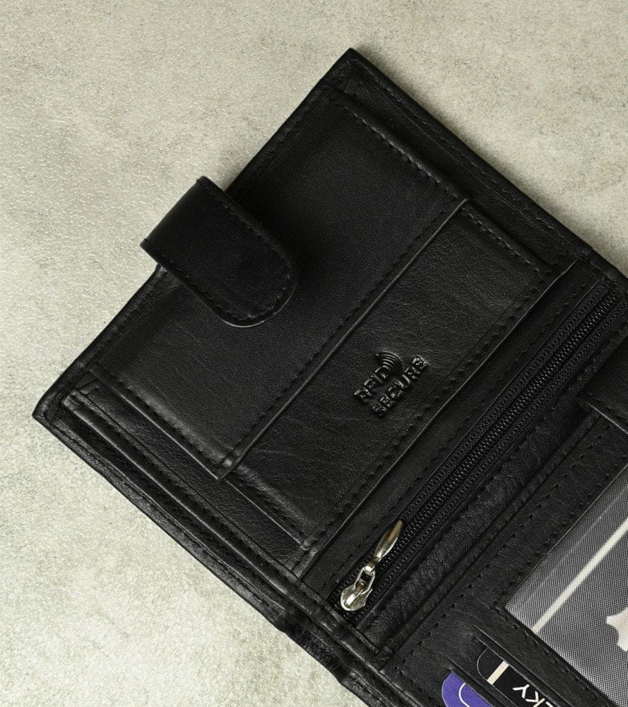Opremljena s tehnologijo RFID, , ki denarnico ščiti pred tatovi, ki uporabljajo čitalnike kartic.