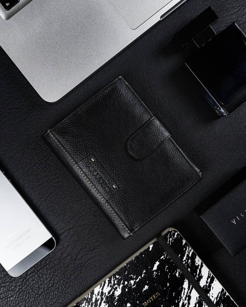 Denarnica iz pravega usnja. Ta model ima membrano,     RFID Stop     ki ščiti podatke kartice pred posnemanjem. Predal za kartico in dokumente je zavarovan z dodatno zaponko. Na sredini denarnice je dodaten predal z zadrgo. Denarnica ima zaponko in je pakirana v elegantni škatli – idealna za darilo.