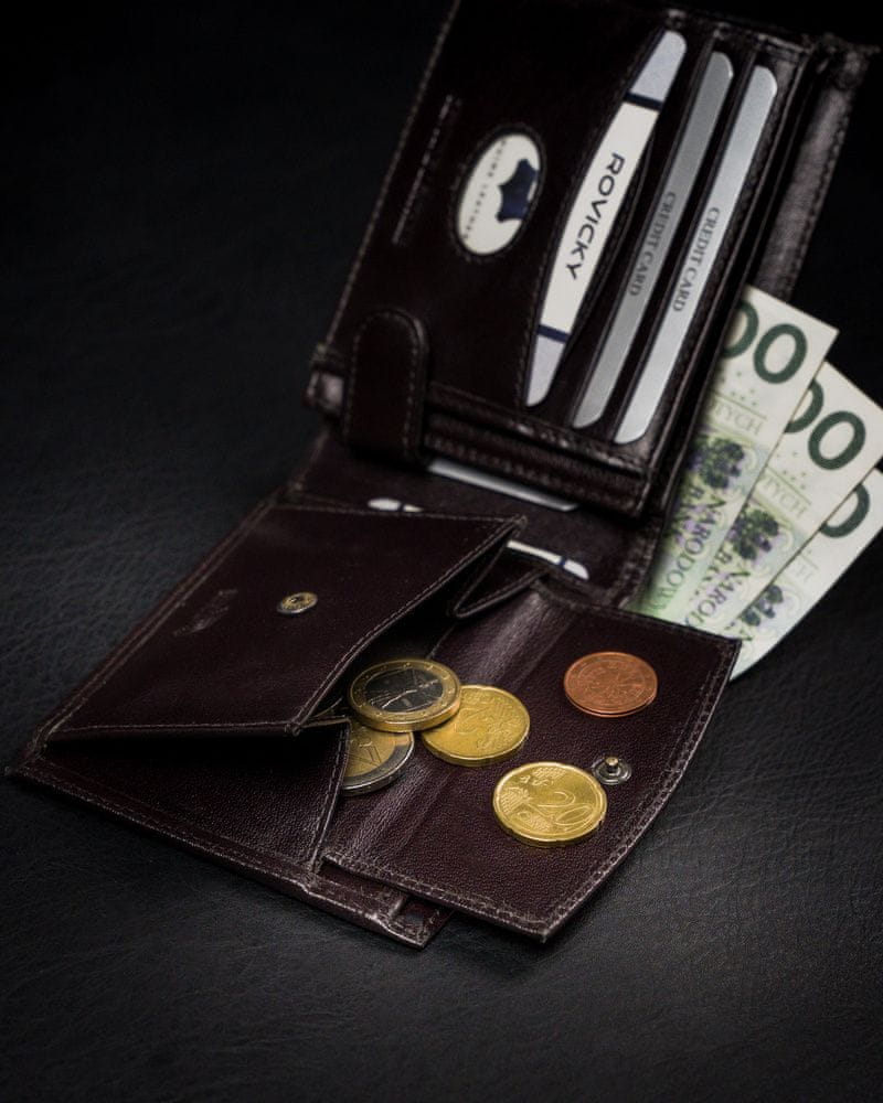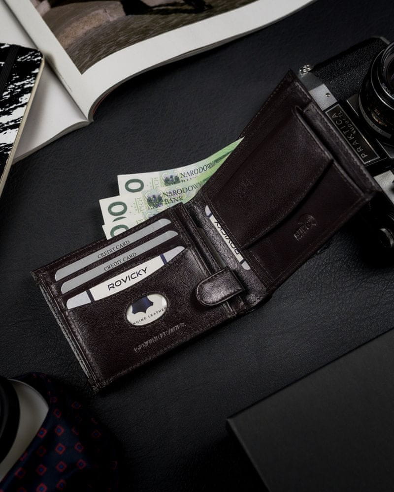 Moška denarnica Poljska znamka     Rovicky®     izdelana iz zelo trpežnega, naravnega polnozrnatega govejega usnja z nežnim sijajem. Tradicionalno strojena, mehka in prijetna na dotik. Z izbiro denarnice iz tega materiala ste lahko prepričani, da kupujete izdelek, ki bo zdržal leta!