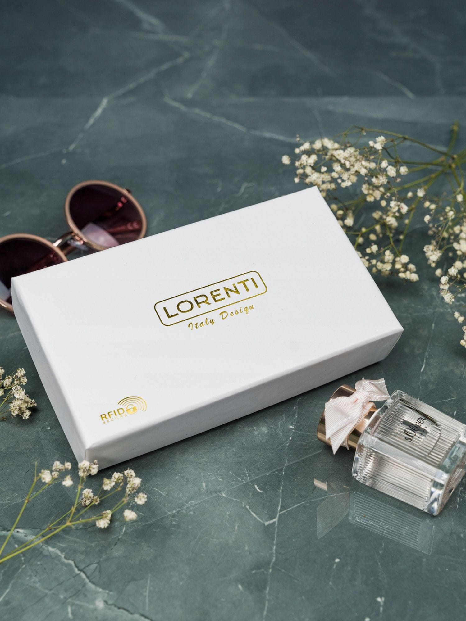 Denarnica je pakirano v škatli z blagovno znamko Lorenti® . Odlično kot darilo. To je izjemno pomembno, če je denarnica namenjena ljubljeni osebi. Ni vam več treba izgubljati časa in denarja z iskanjem darilne embalaže. Dovolj je okrasni trak ali pentlja in lahko se veselite veselja prejemnika.