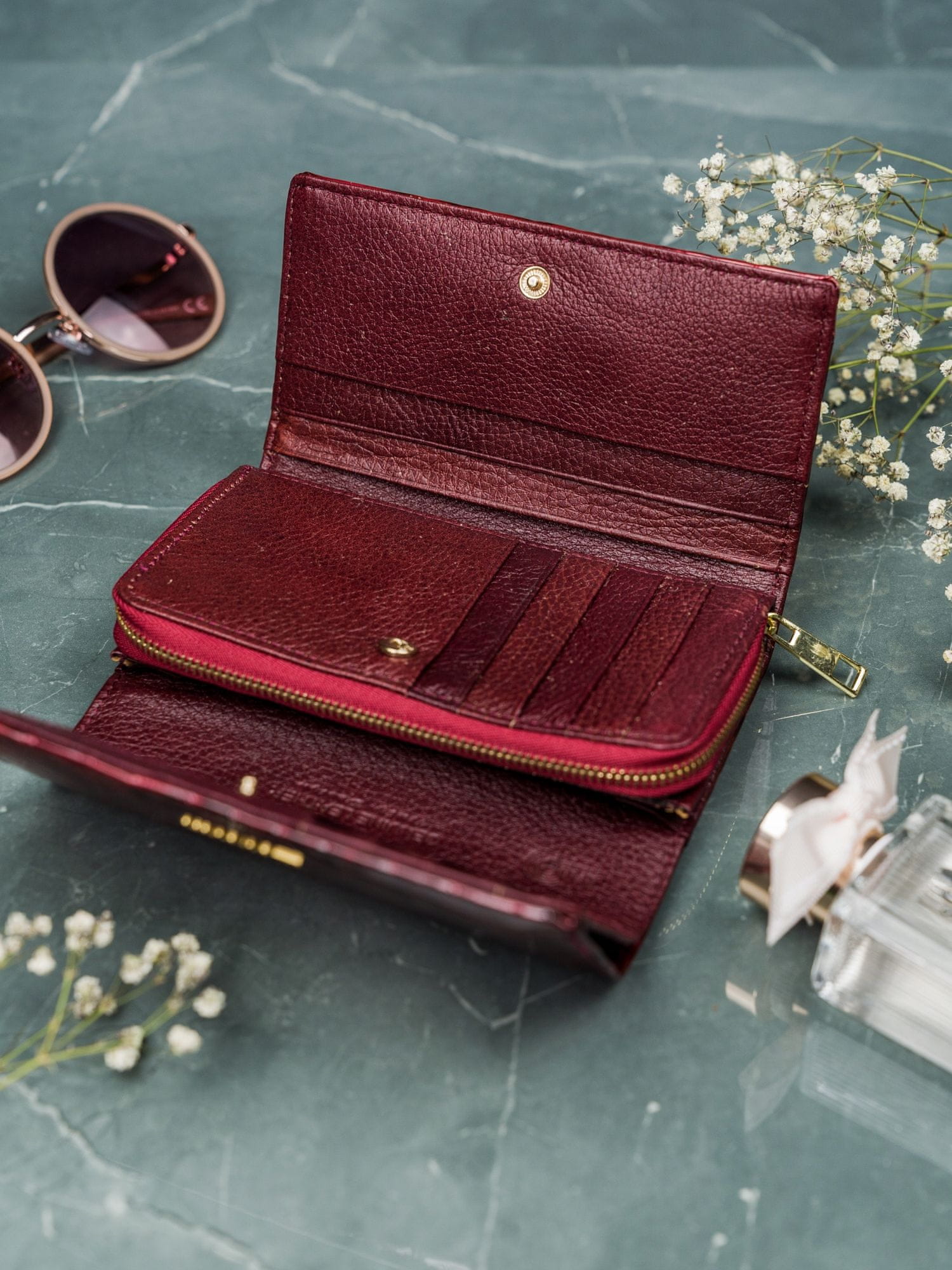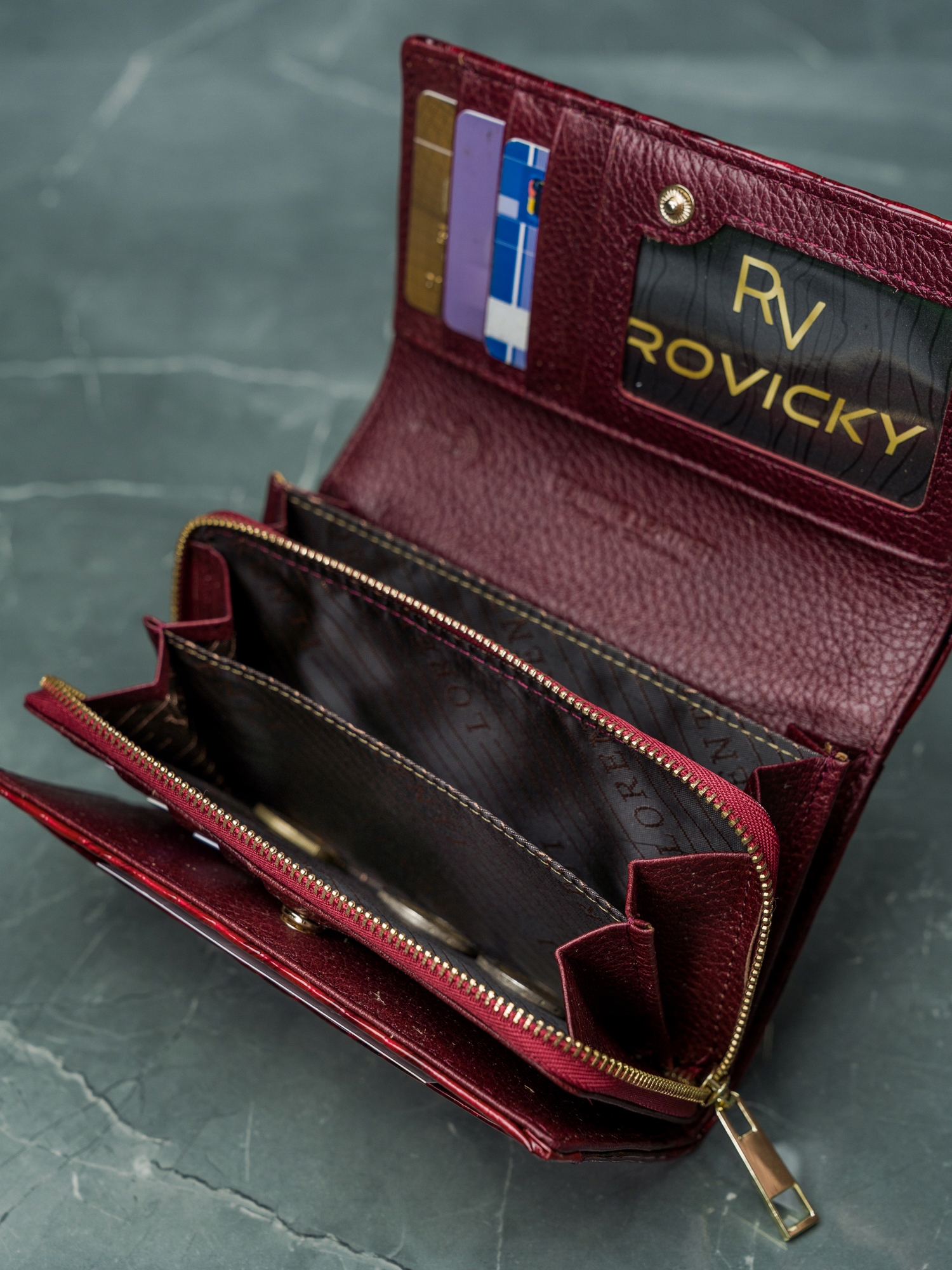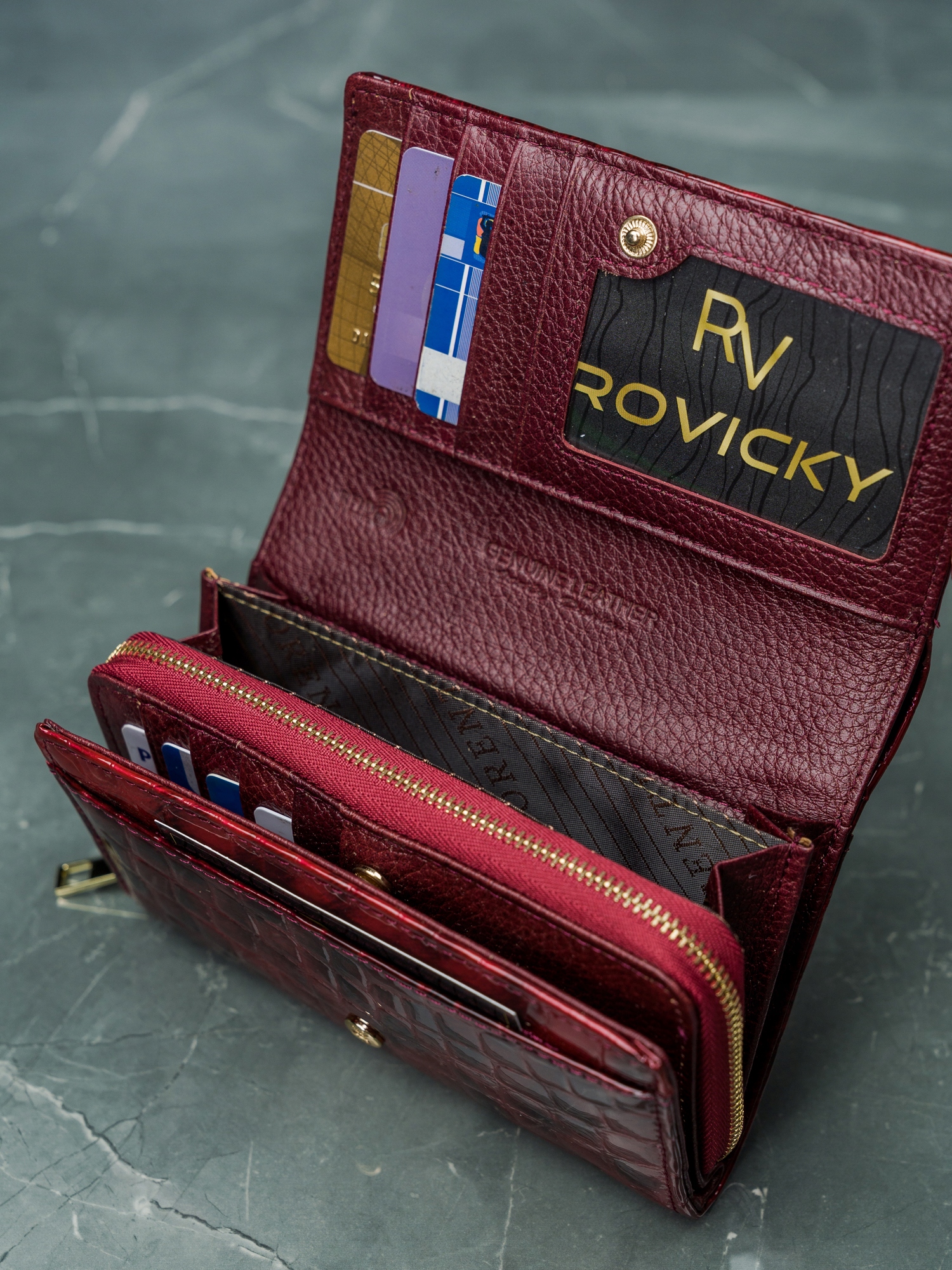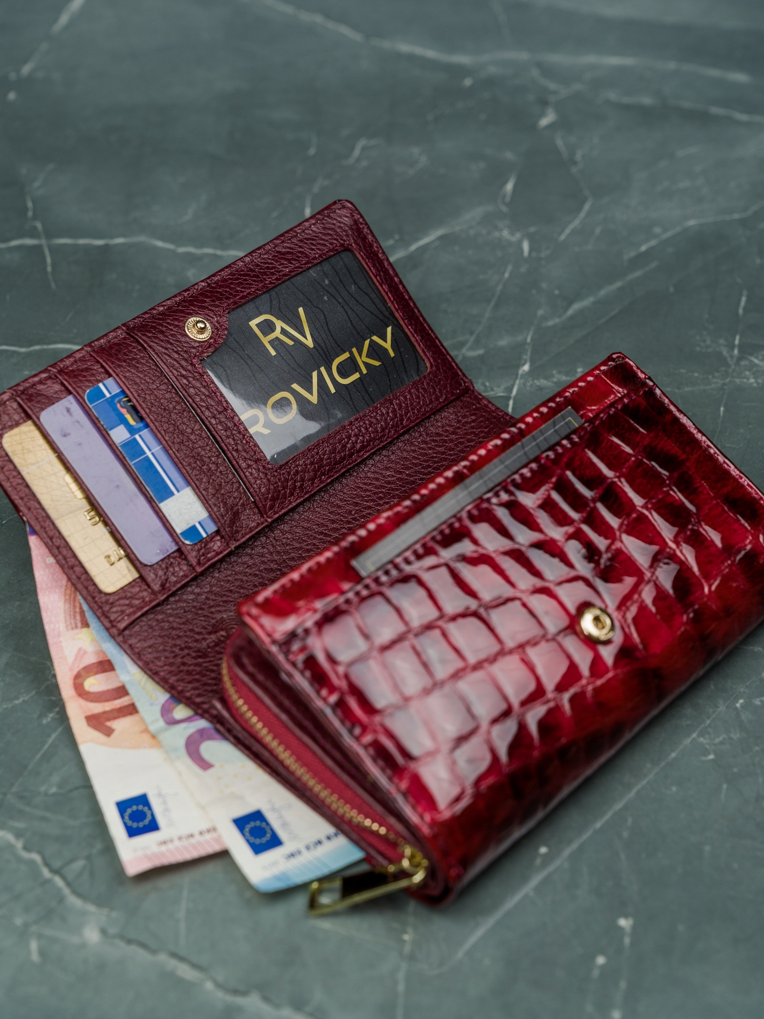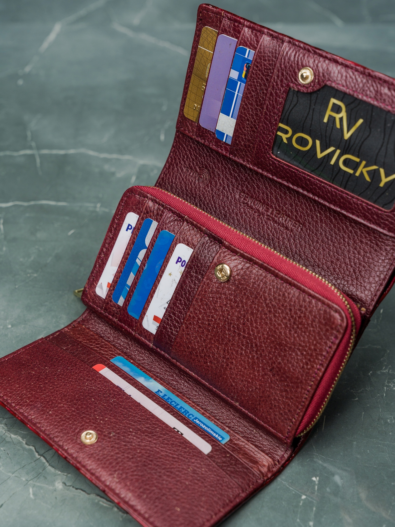 1 predal z zadrgo v osrednjem delu denarnice; Predal za kartice in dokumente sta podložena. To preprečuje drgnjenje pri neštetokratnem vstavljanju in odstranjevanju kartic.