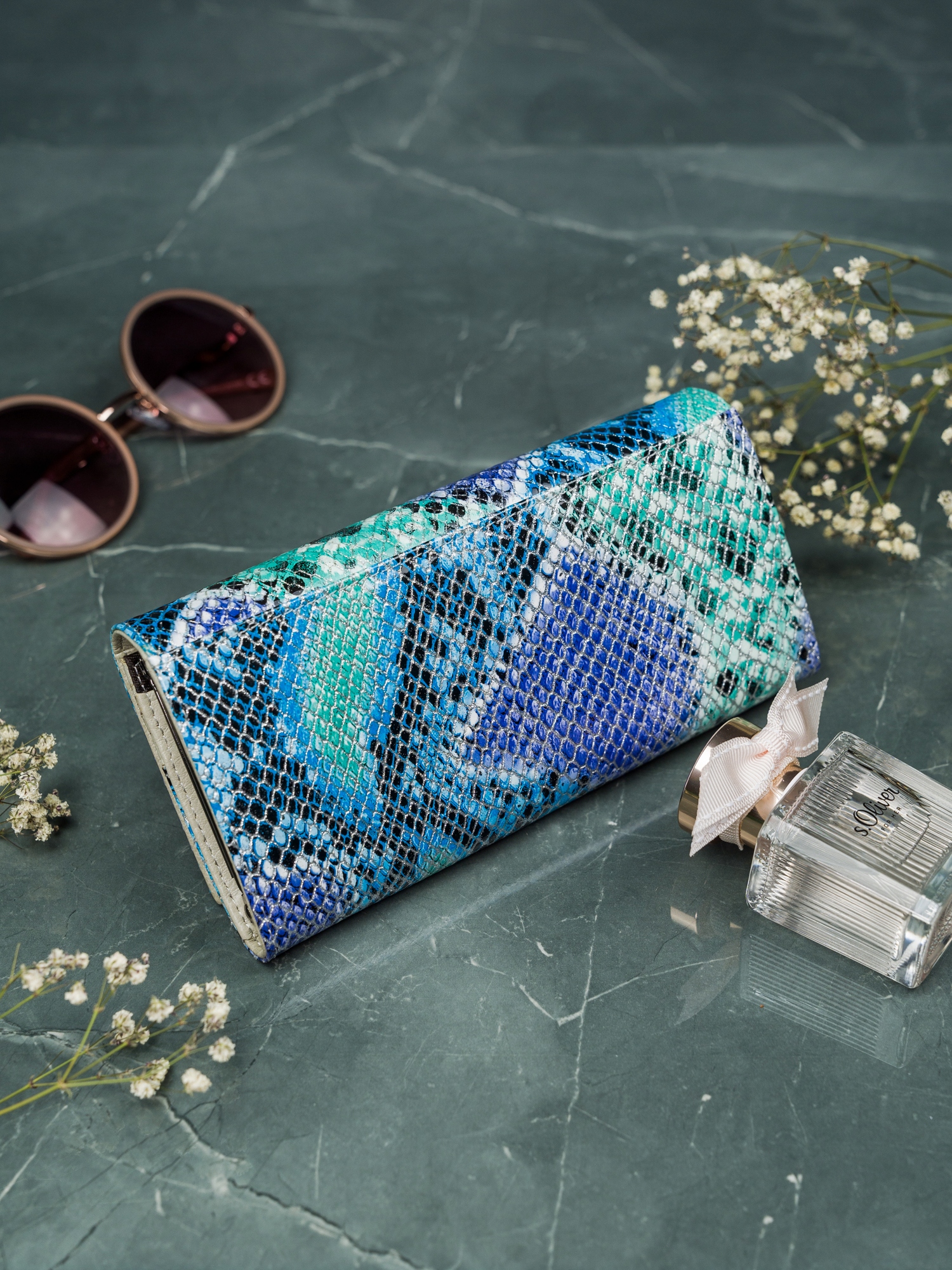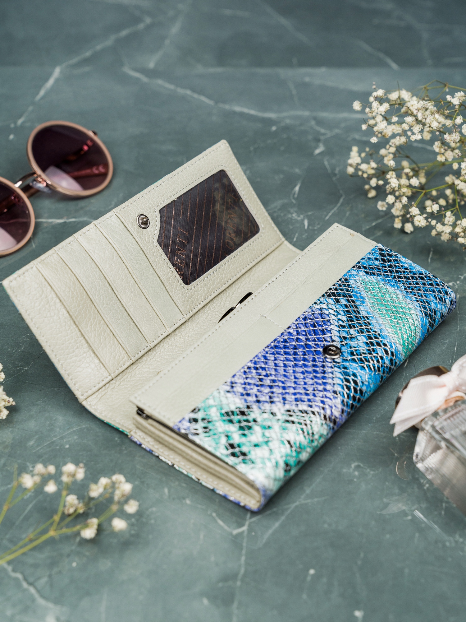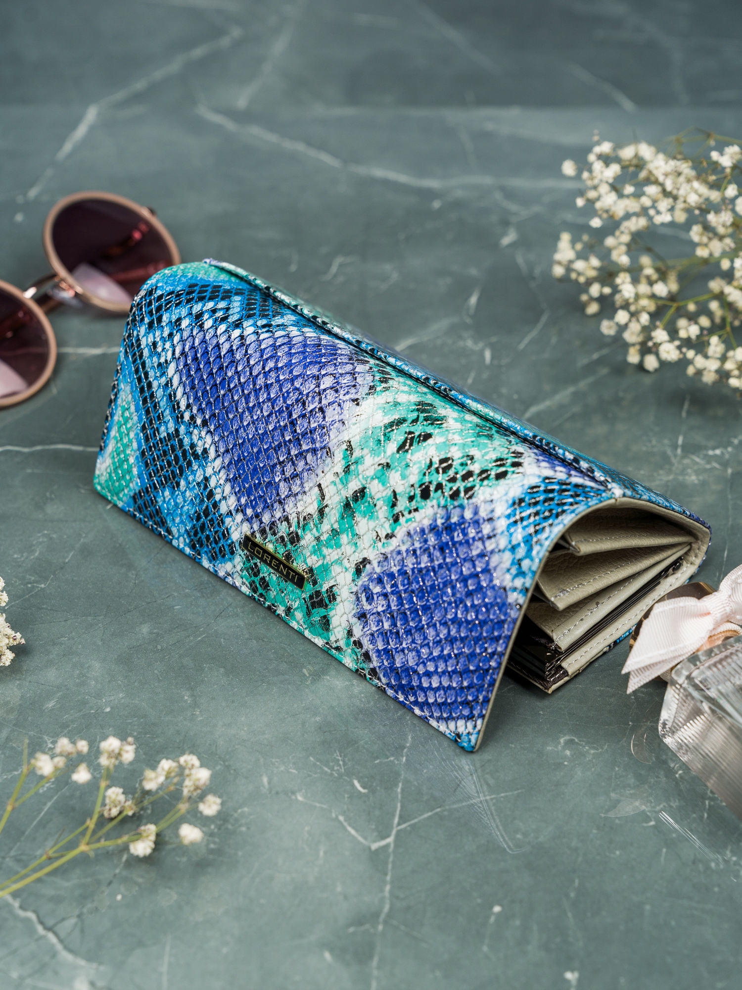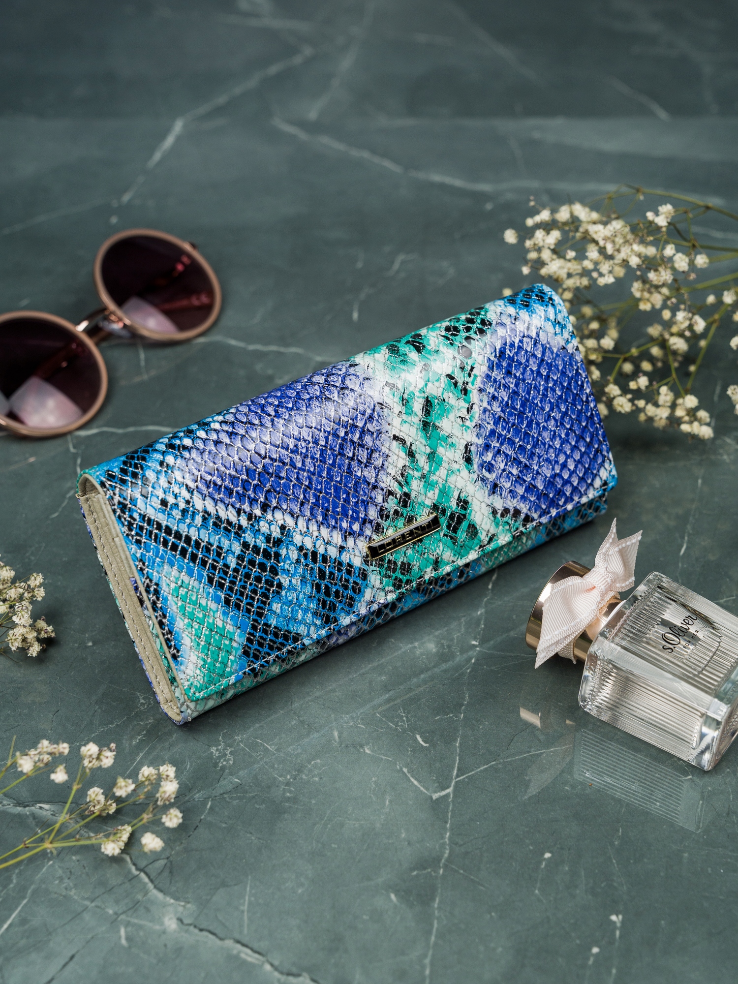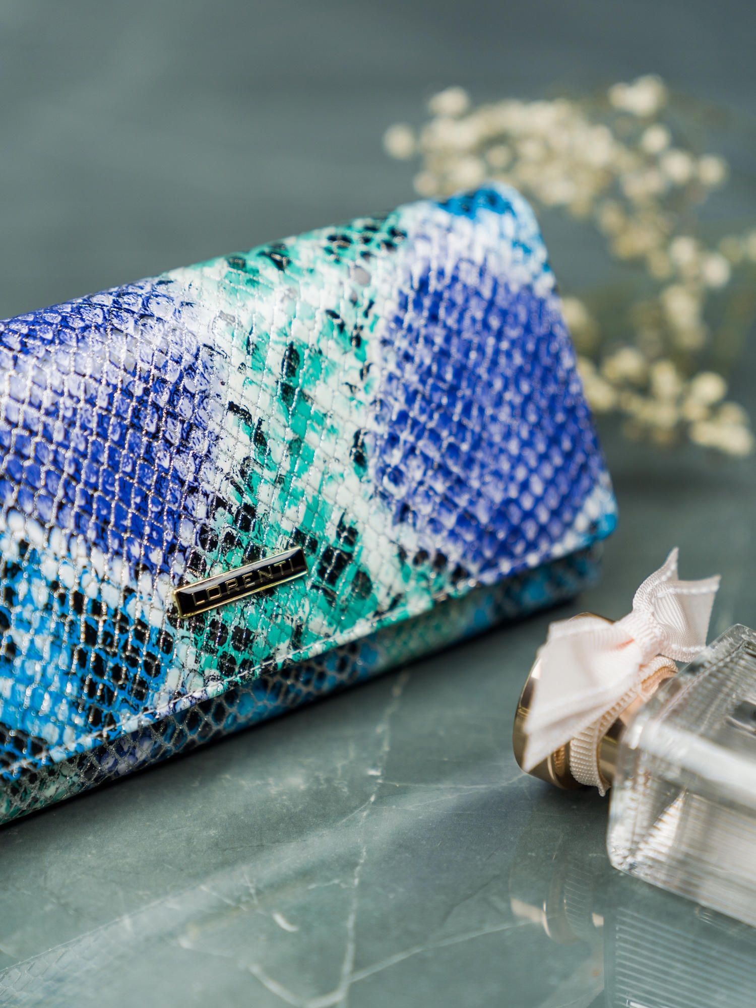 Ženska denarnica iz lakiranega usnja z RFID zaščito, znamke LORENTI, zapiranje na pritisk, večbarvna z dominantno modro in vijolično barvo.
