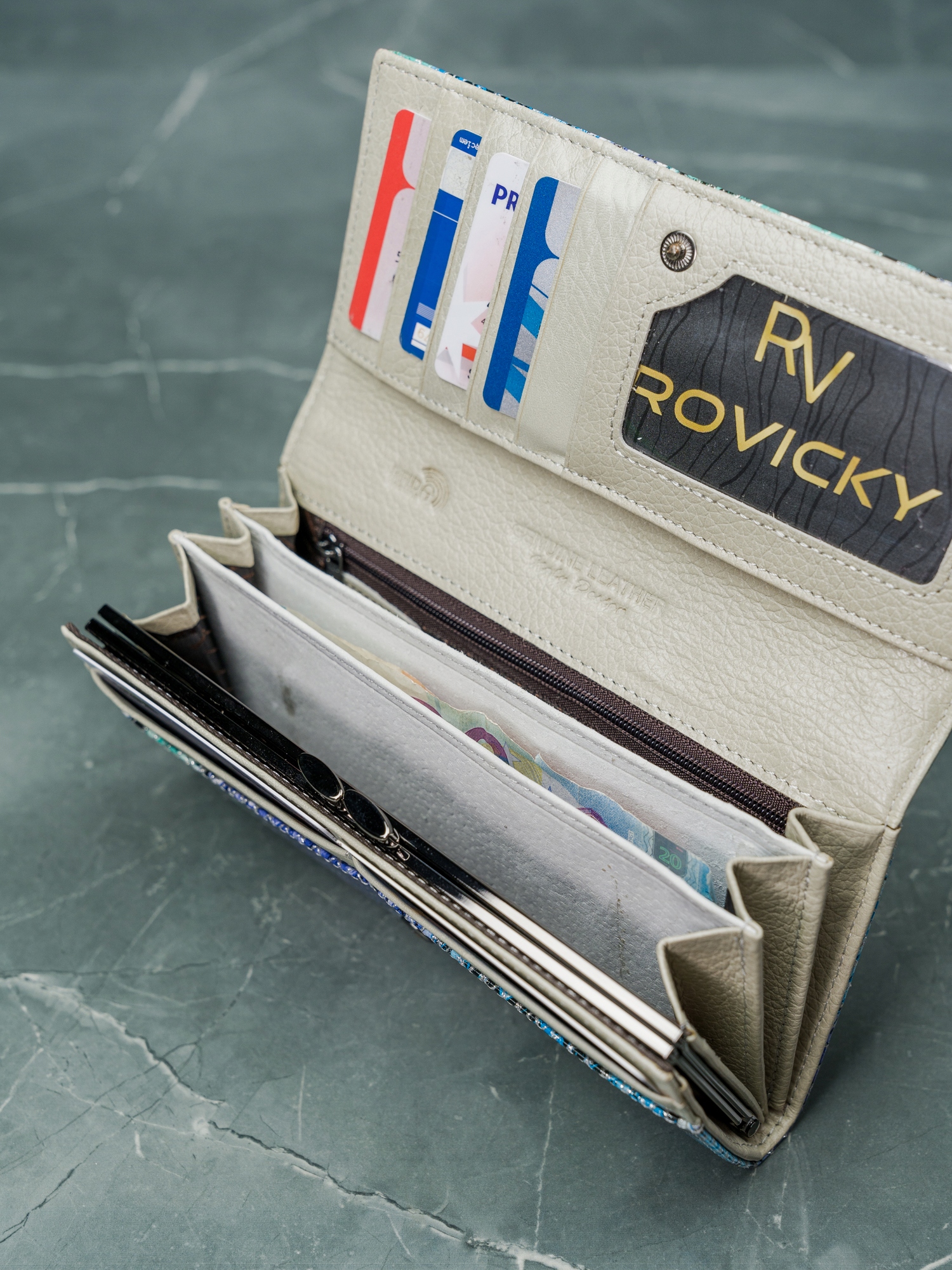RFID se nanaša na tehnologijo, ki uporablja radijske valove za prenos podatkov. Uporablja se v tehnologiji brezstičnih bančnih kartic. Denarnice Rovicky z zaščito RFID imajo v notranjosti poseben material, ki ščiti bančne kartice pred napadi bralnikov RFID. Kako deluje: z denarnico v žepu hlač, žepu jakne itd. lahko nekdo postavi skener črtne kode blizu žepa in skenira podatke kartice. Če je vaša kartica v denarnici, zaščiteni z RFID, skener ne bo deloval. Vaše kartice/denar so varni!