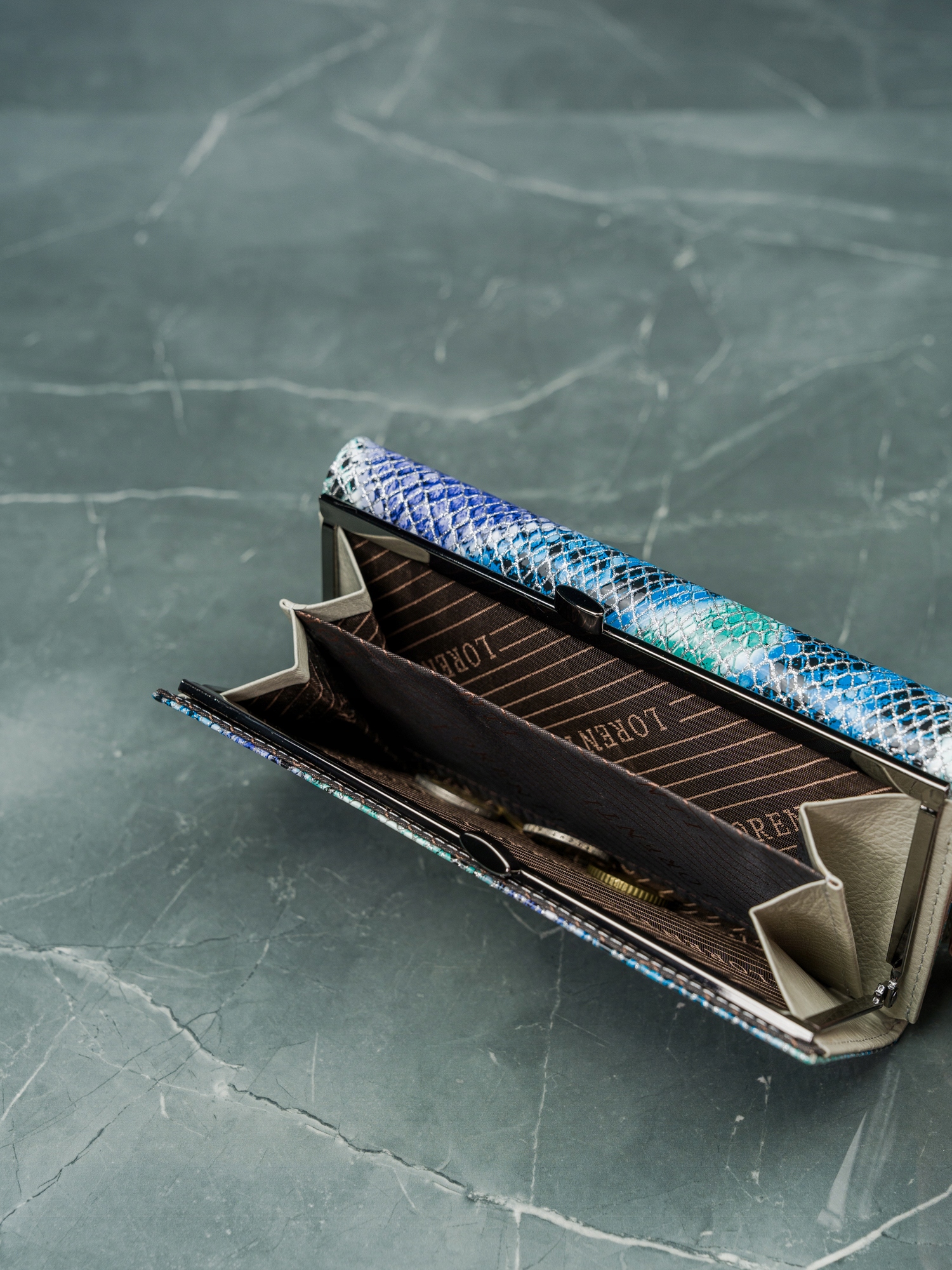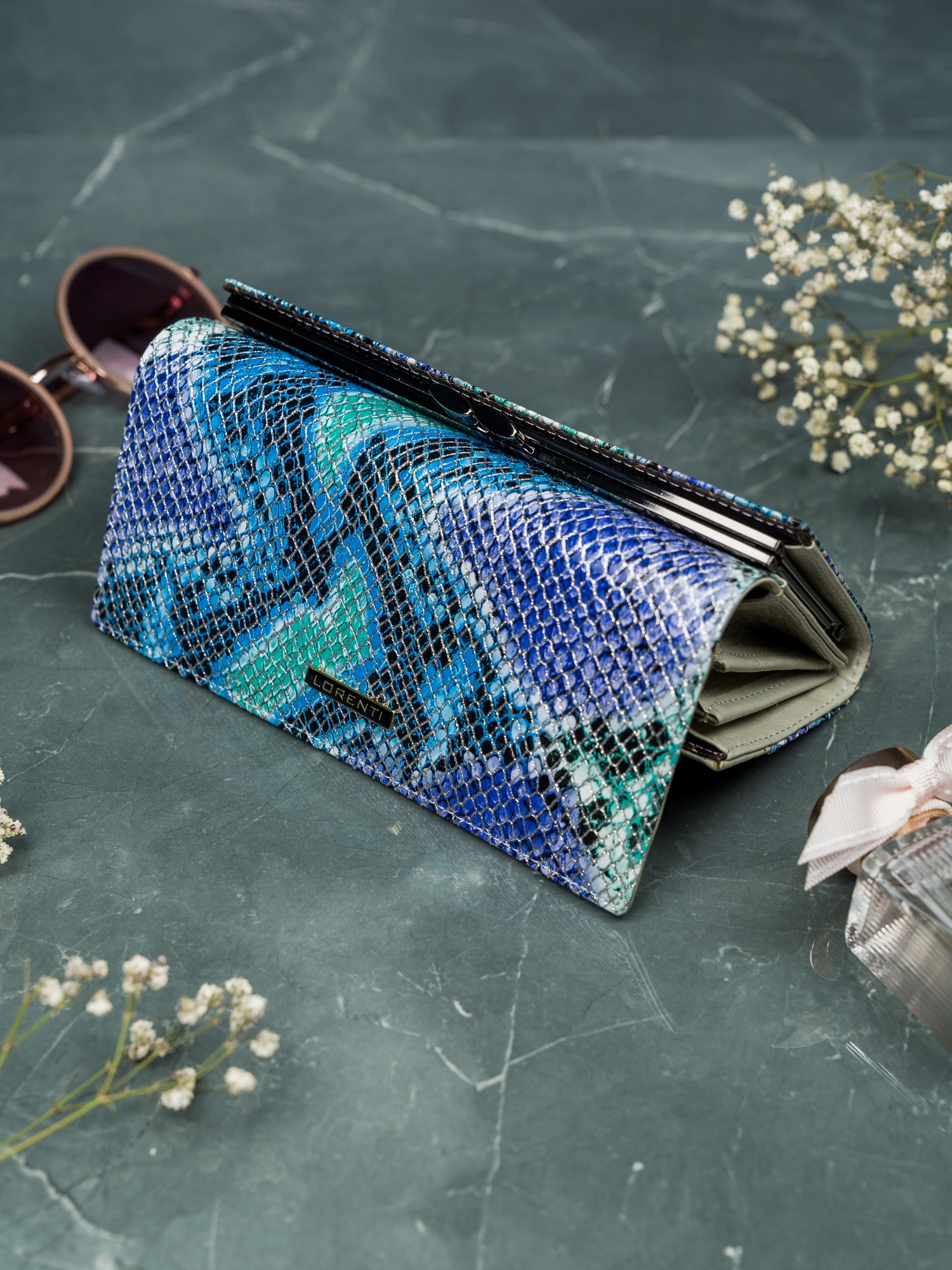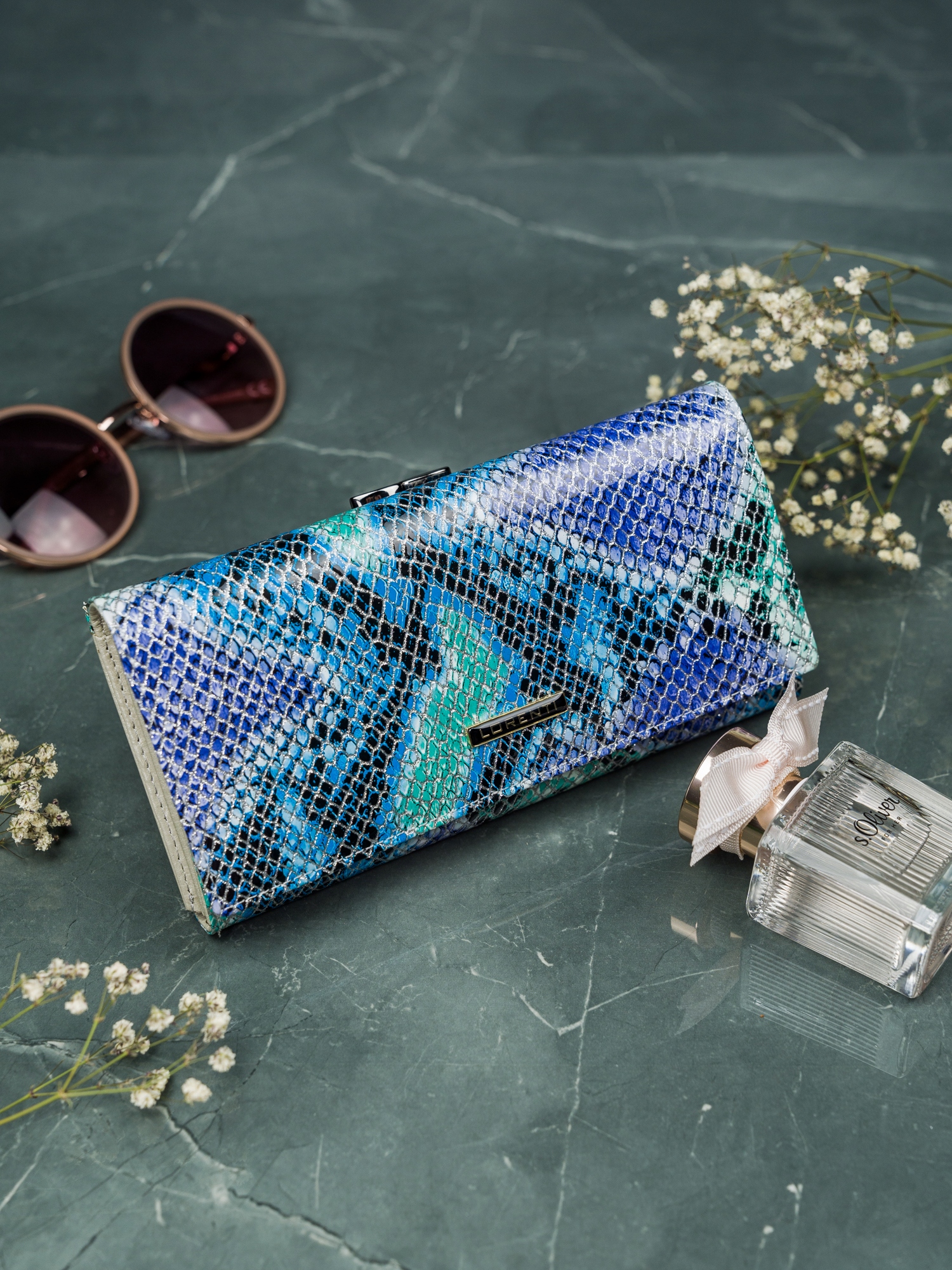 Velika ženska denarnica iz lakiranega usnja z RFID zaščito znamke LORENTI, z zapiranjem na gumb in zaponko, večbarvna z dominantno modro in vijolično barvo.