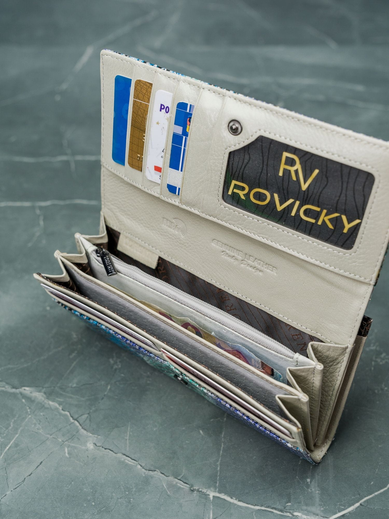RFID se nanaša na tehnologijo, ki uporablja radijske valove za prenos podatkov. Uporablja se v tehnologiji brezstičnih bančnih kartic. Denarnice Rovicky z zaščito RFID imajo v notranjosti poseben material, ki ščiti bančne kartice pred napadi bralnikov RFID. Kako deluje: z denarnico v žepu hlač, žepu jakne itd. lahko nekdo postavi skener črtne kode blizu žepa in skenira podatke kartice. Če je vaša kartica v denarnici, zaščiteni z RFID, skener ne bo deloval. Vaše kartice/denar so varni!