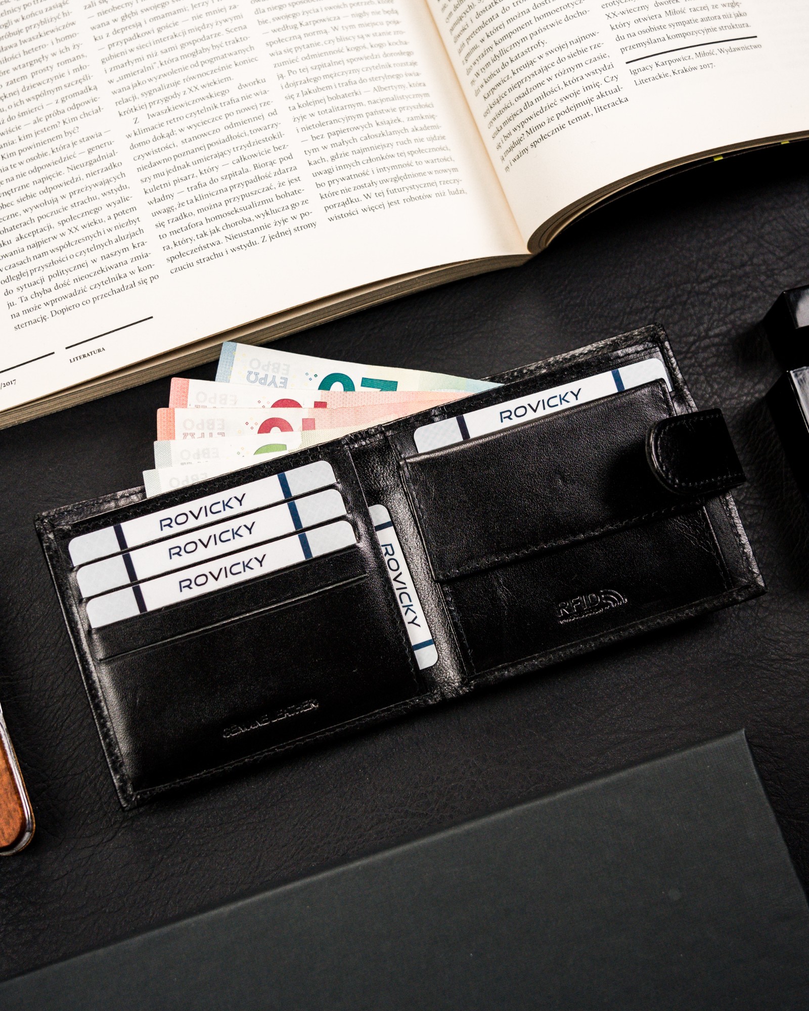 Moška denarnica Rovicky iz pravega usnja z zaponko in RFID zaščito kartic