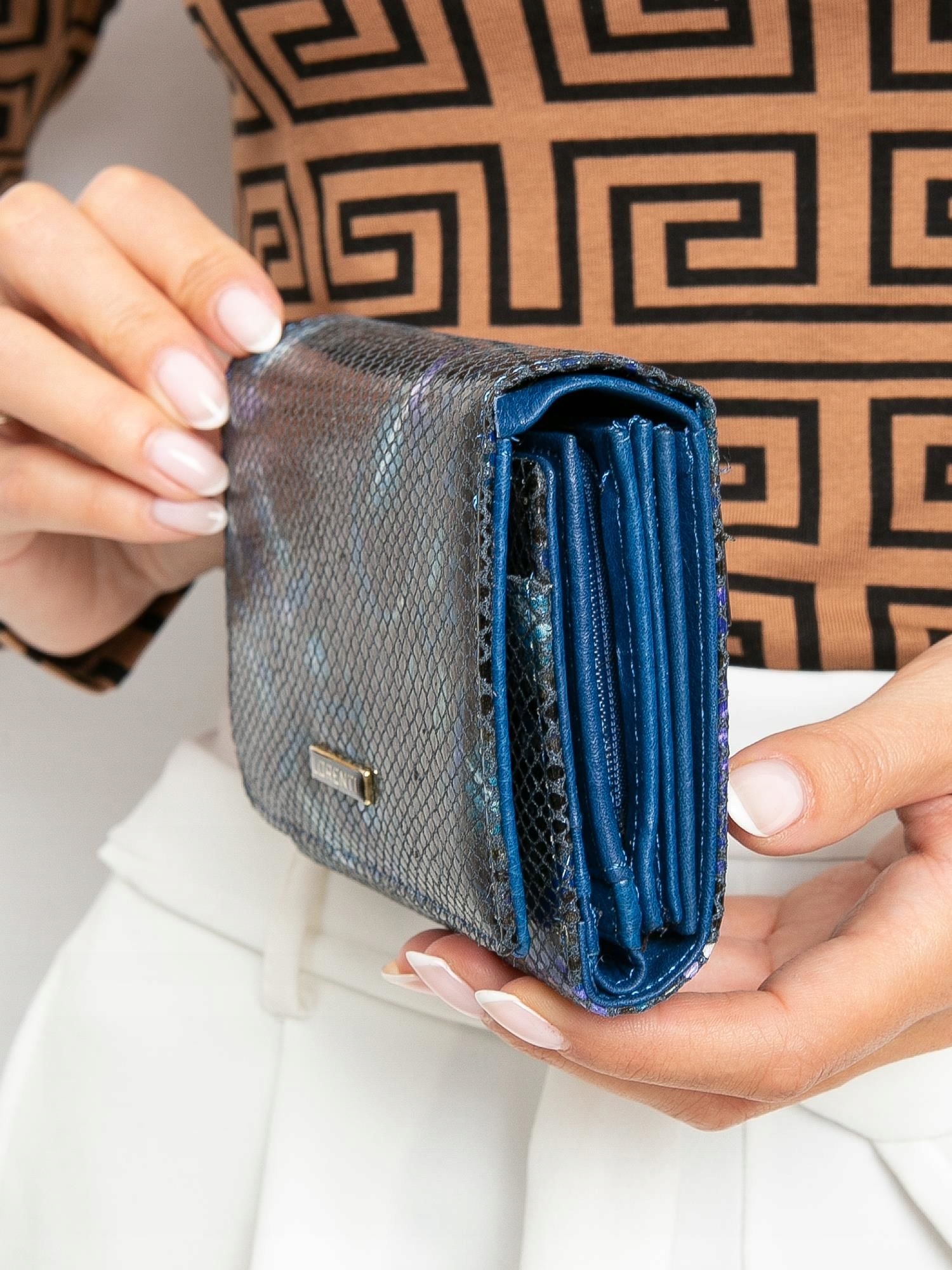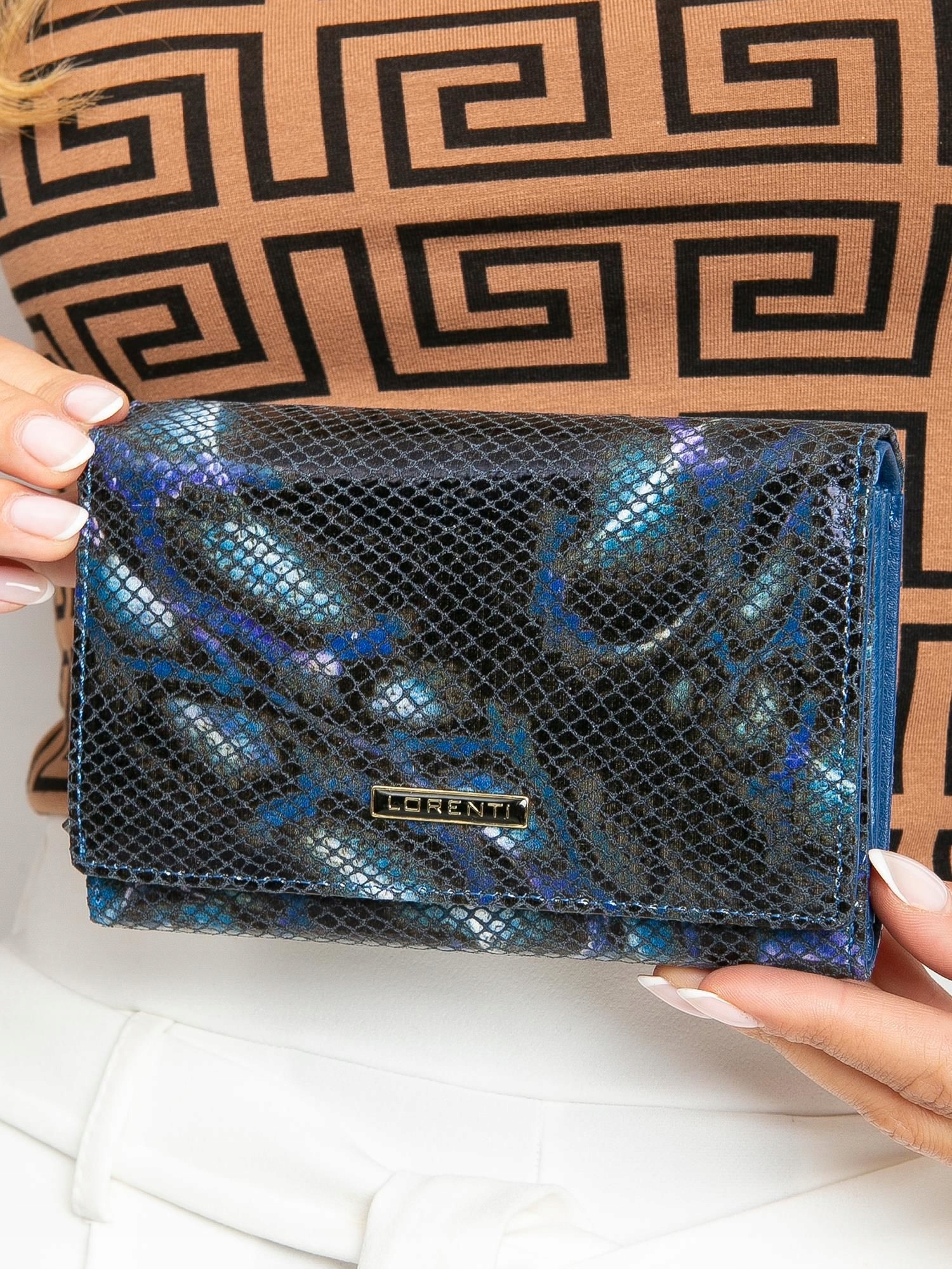 Ženska usnjena denarnica z RFID zaščito znamke LORENTI, z zapiranjem na gumb in zaponko, z motivom kačje kože.
