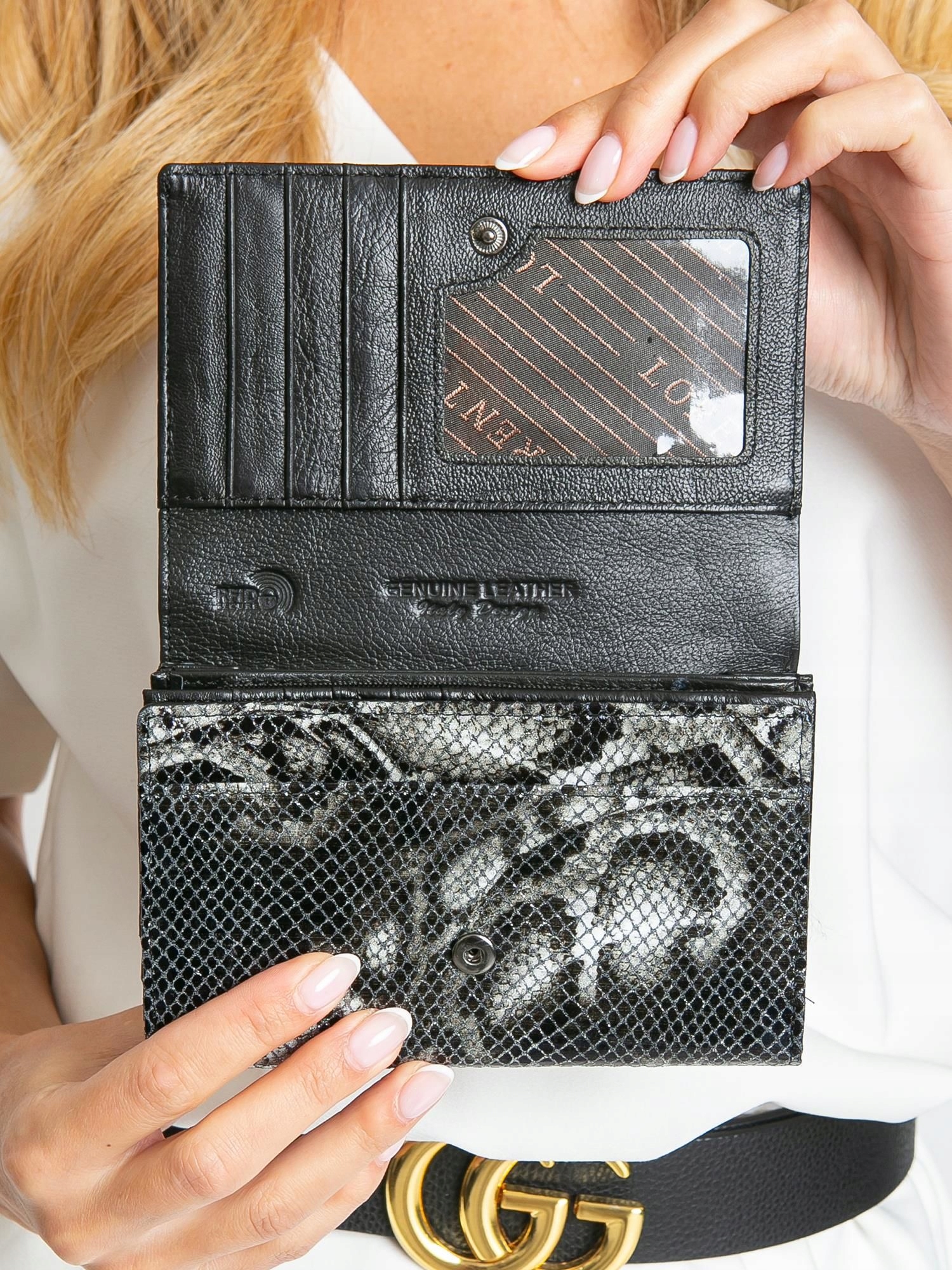 Ženska usnjena denarnica z RFID zaščito znamke LORENTI, z zapiranjem na gumb in zaponko, z motivom kačje kože.