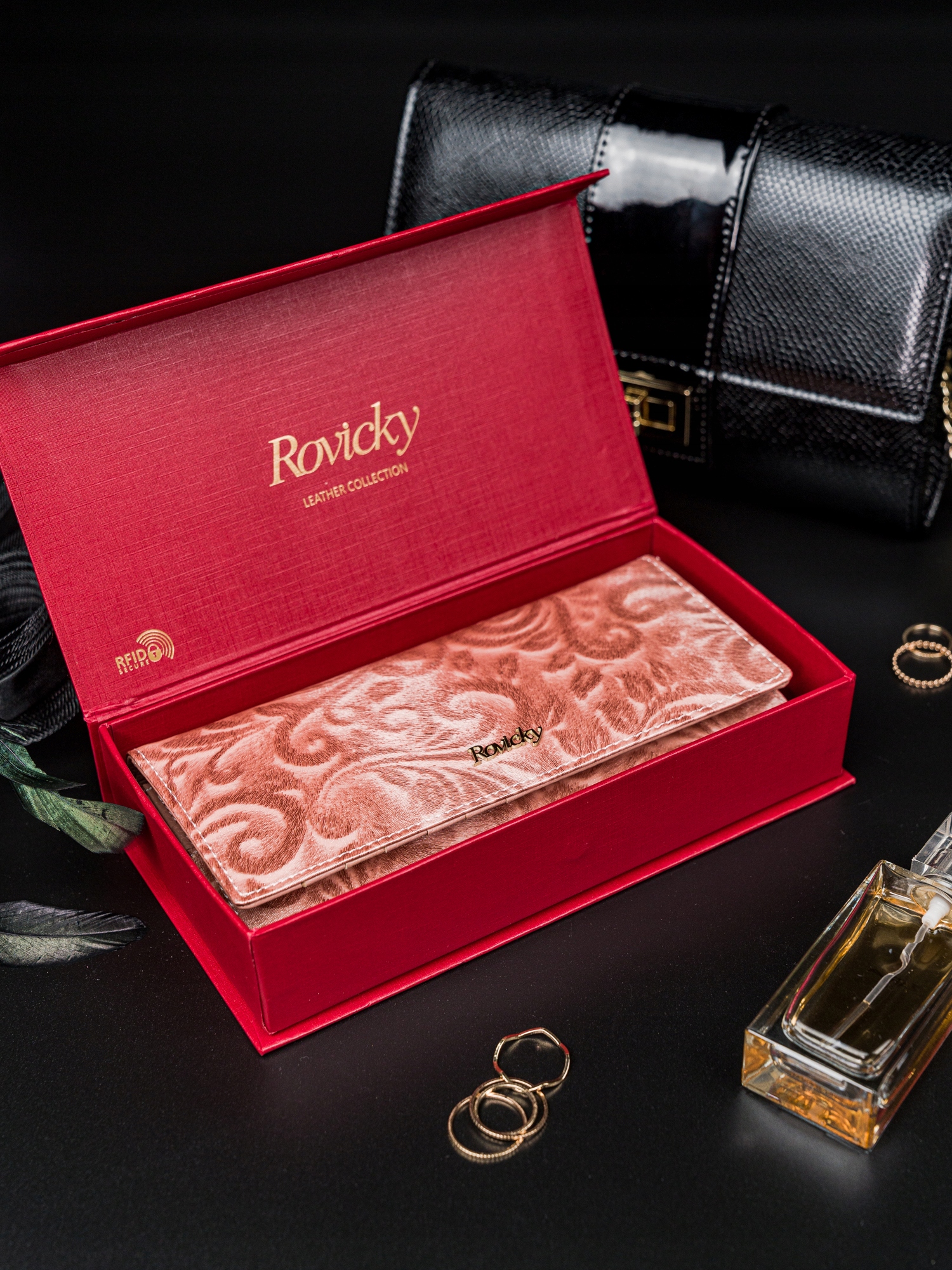 Izdelana iz najkakovostnejšega pravega usnja, lakiranega na zunanji strani in matiranega na notranji strani. Na sprednji strani denarnice je logotip blagovne znamke Rovicky®. Vsaka denarnica ima edinstven slog in značaj. Zasnovana je v skladu z najnovejšimi trendi in je popolna izbira za vsako žensko. Odlična kakovost, brezhibna izdelava in edinstven videz so naša popolna izbira za vas. Izdelek poljske blagovne znamke