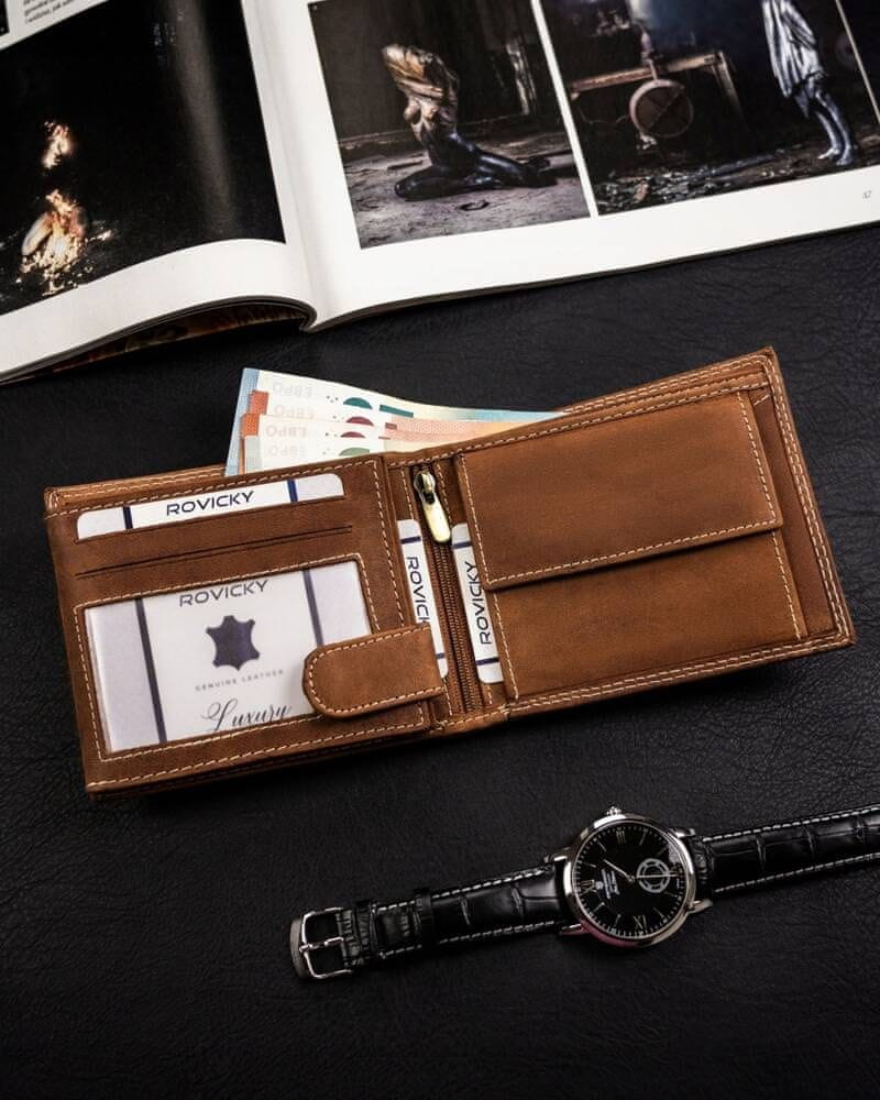 Denarnica iz trpežnega pravega nubuk usnja. Model s klasičnim slogom. Denarnica je vodoravna in nima zunanje zaponke. Ima prostorno notranjost –