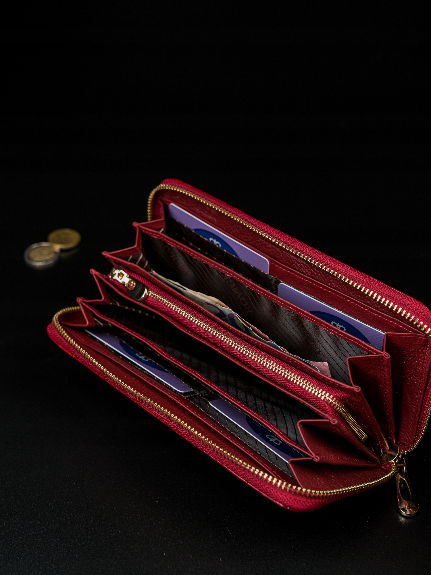 Rdeča denarnica iz pravega usnja je videti najbolje in je najbolj privlačna večini žensk. Pravijo, da rdeče denarnice nosijo čustvene, energične, močne, pogumne in tekmovalne osebe. Dodatek rdeče denarnice pomaga ženskam, da izstopajo iz množice. Lastnice denarnic v tej barvi običajno preživljajo svoje družine in lahko zaslužijo velike vsote denarja. Feng šuj pa ve, da denarju ustreza rdeča barva, zato ne „pobegne“ pred rdečimi denarnicami. Zato bo takšna denarnica želja po blaginji. Ali ne pomislimo na to intuitivno, ko izbiramo rdečo denarnico zase ali za darilo?