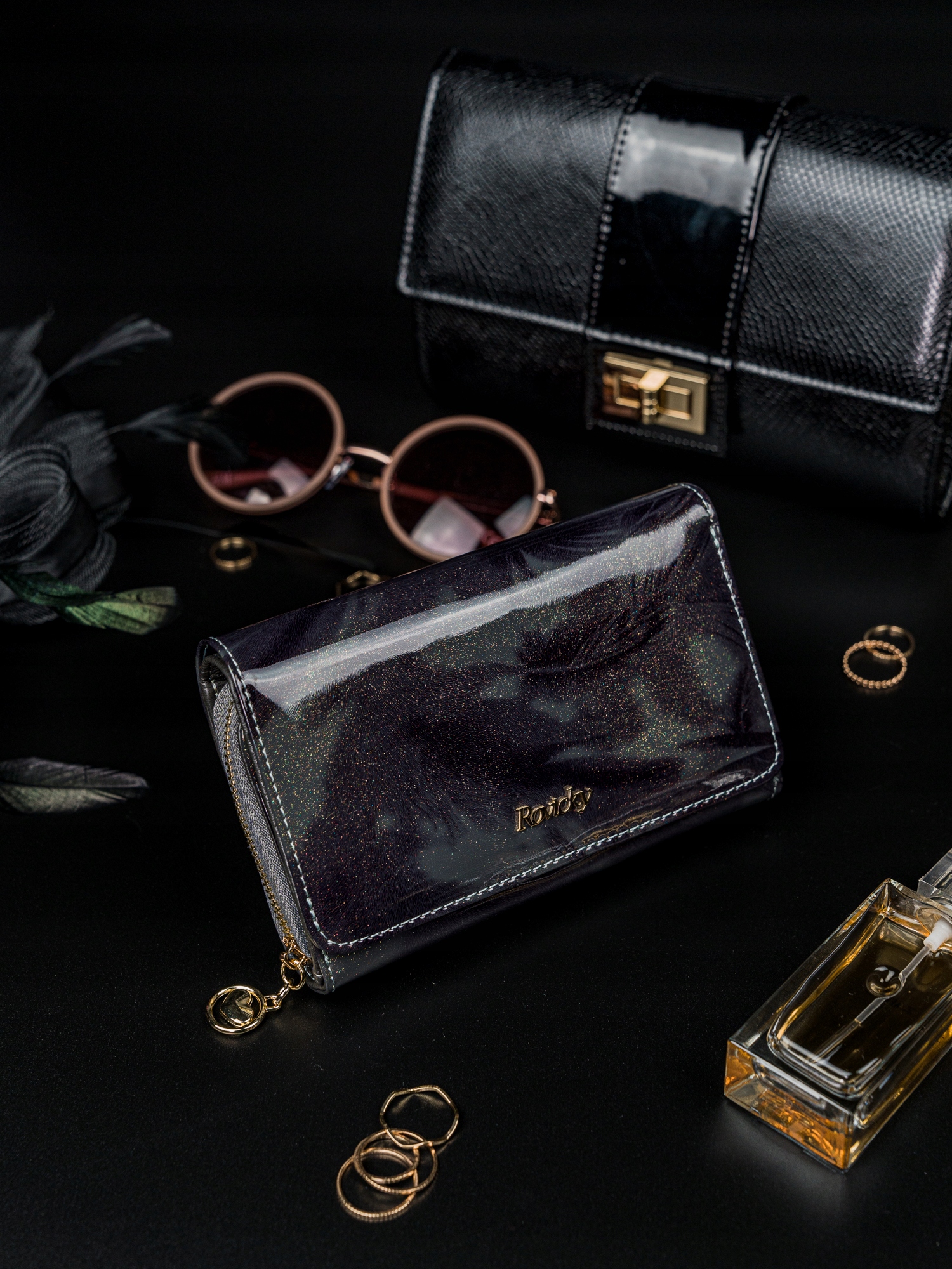 Denarnica iz najnovejše kolekcije Rovicky® je kombinacija umirjene elegance in klasične elegance, ki se odlično dopolnjujeta in vam zagotavljata ne le visokokakovosten izdelek, temveč tudi univerzalen dizajn, ki bo dopolnil vaš slog. Zunanjost iz lakiranega usnja je nedvomno vrhunec denarnice, notranjost pa se ponaša z vrhunsko mat površino. Na sprednji strani je nežen, pozlačen logotip.