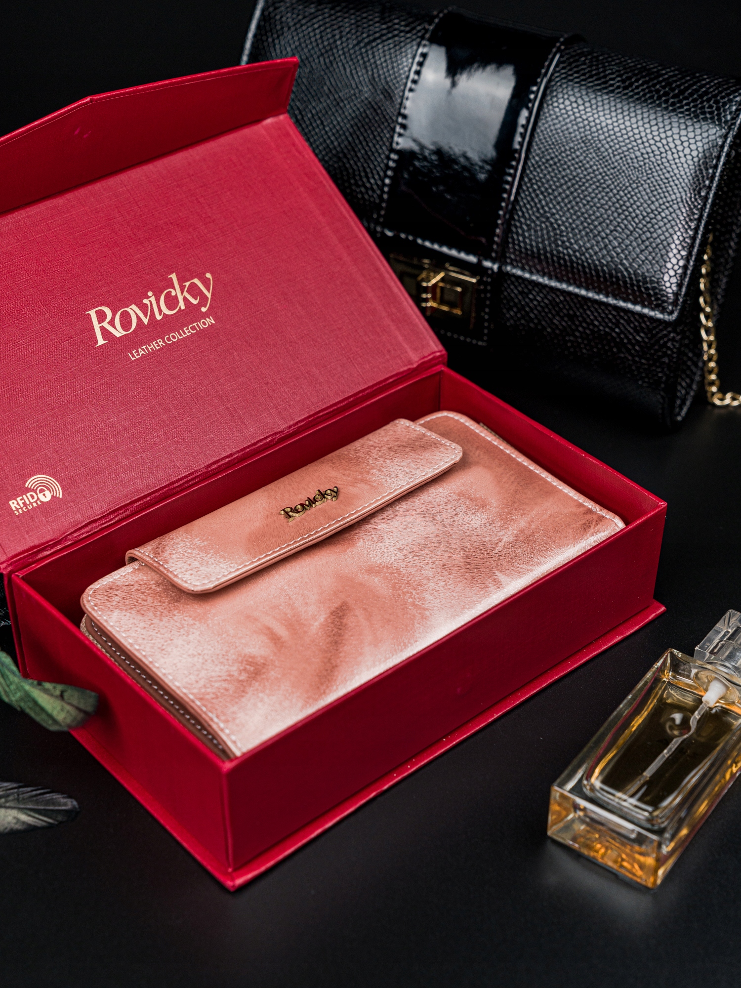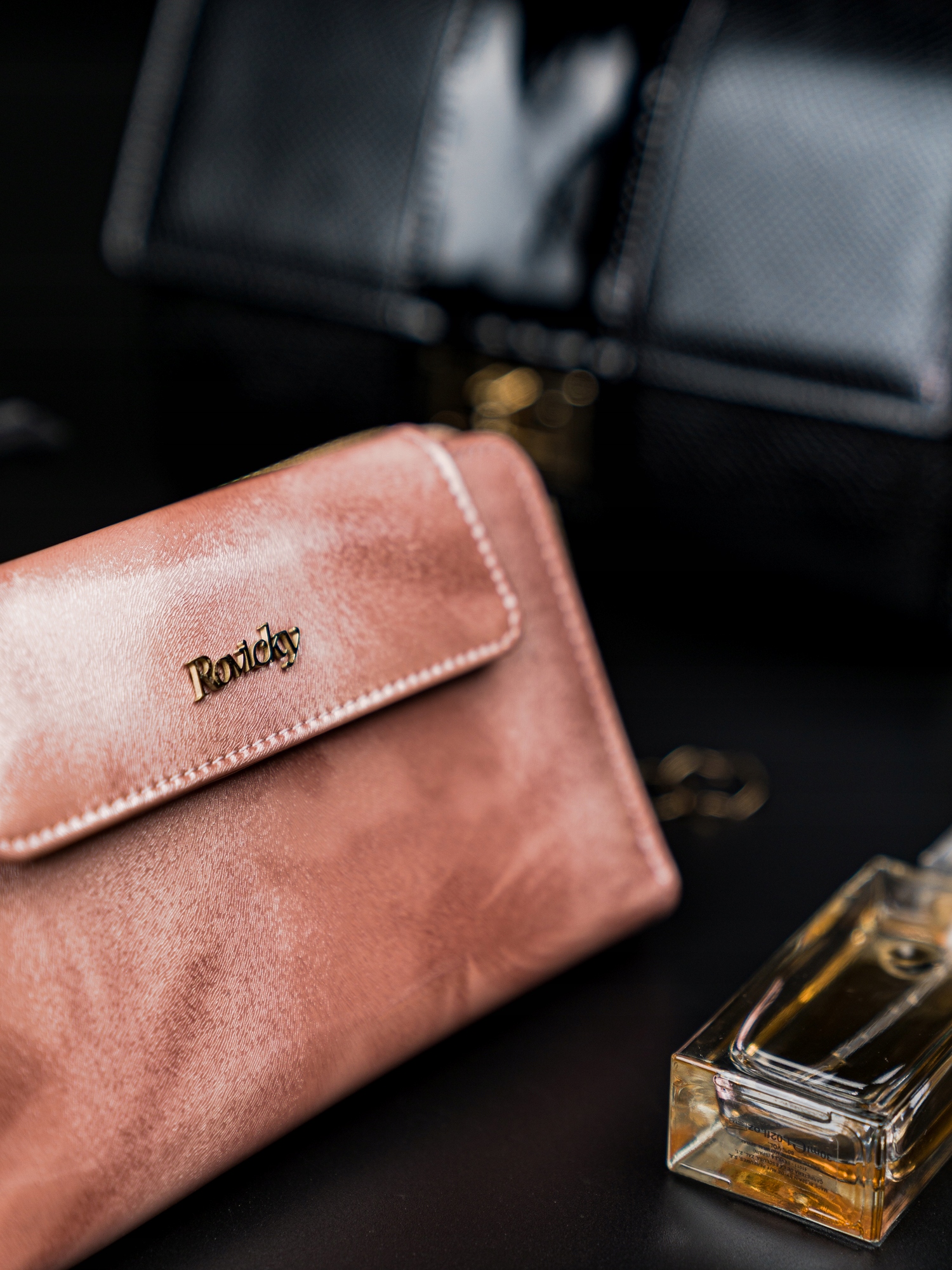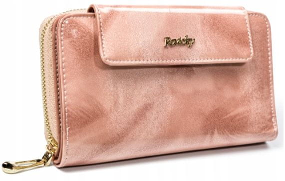 Denarniška denarnica iz najnovejše kolekcije Rovicky® je kombinacija umirjene elegance in klasične elegance, ki se odlično dopolnjujeta in vam zagotavljata ne le visokokakovosten izdelek, temveč tudi univerzalen dizajn, ki bo dopolnjeval vaše obleke. Lakasto usnje je nedvomno vrhunec na zunanji strani denarnice, notranjost pa se ponaša z vrhunskim mat zaključkom. Sprednja stran denarnice ima nežen, pozlačen logotip.