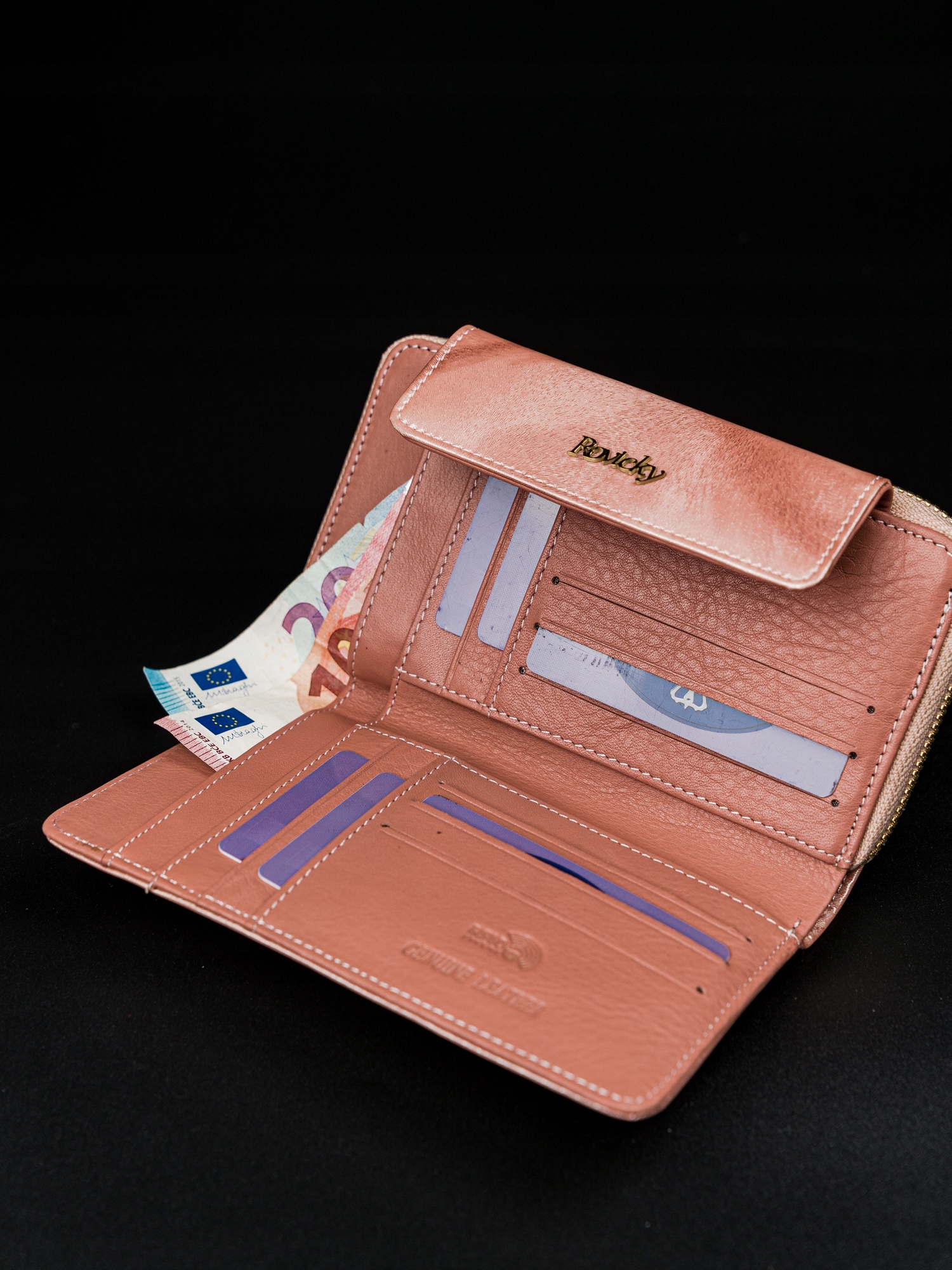 Velik žep za kovance Ta model ima zunanji, tridelni žep za kovance, razdeljen na tri dele. Srednji predal se zapira z dodatno zadrgo. Stranska predala se lahko uporabljata tudi za shranjevanje dokumentov ali bankovcev – sta resnično prostorna.