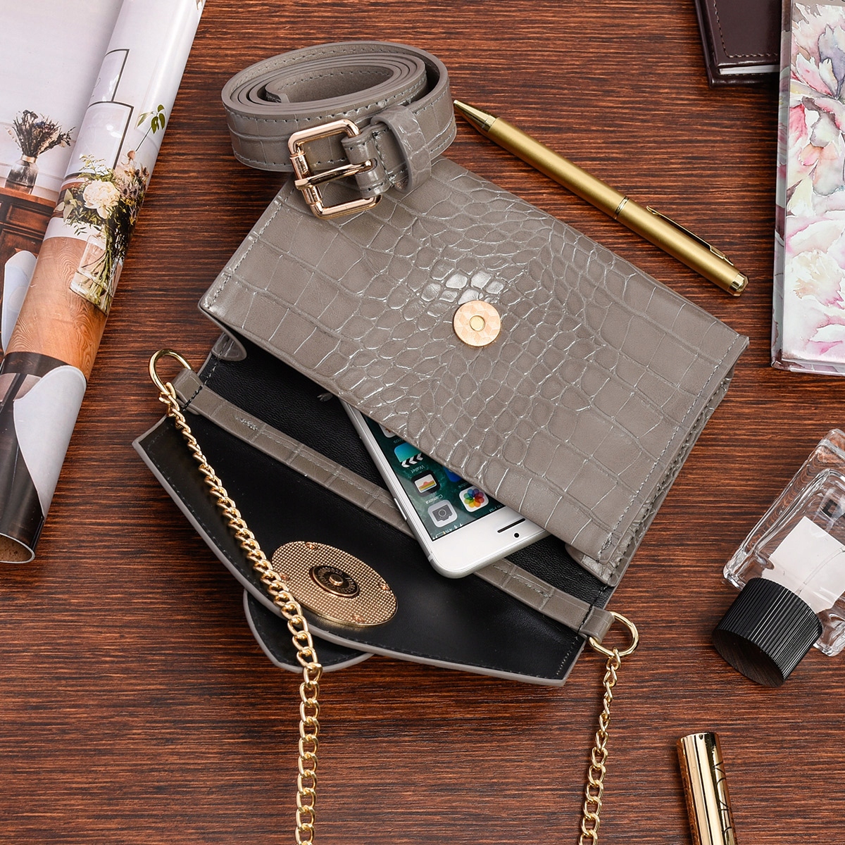 • Torbico lahko nosite na verižici kot ročno torbico ali kot torbico okoli pasu