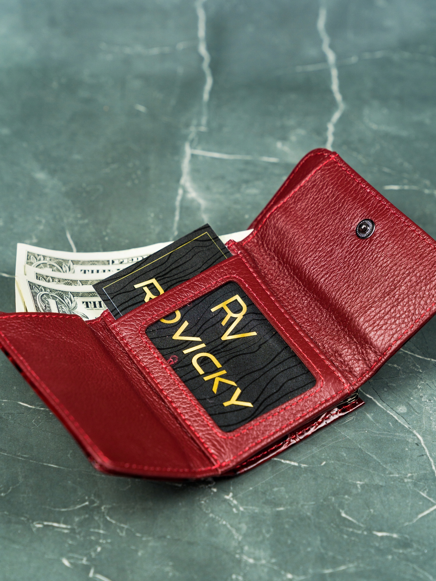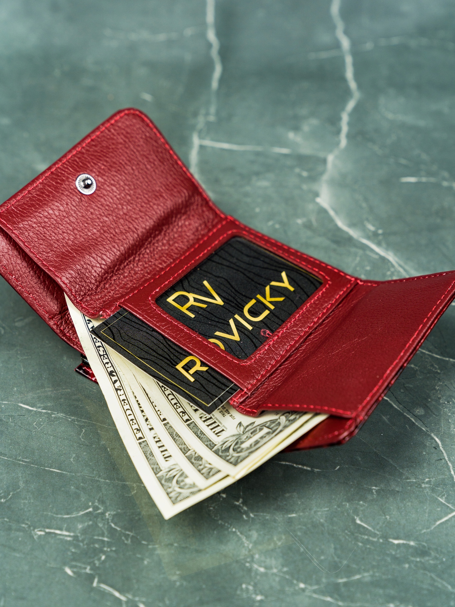 Denarnica se zapenja s pritiskom. Če ga odprete, se razkrije prostoren predal, v katerega lahko shranite: