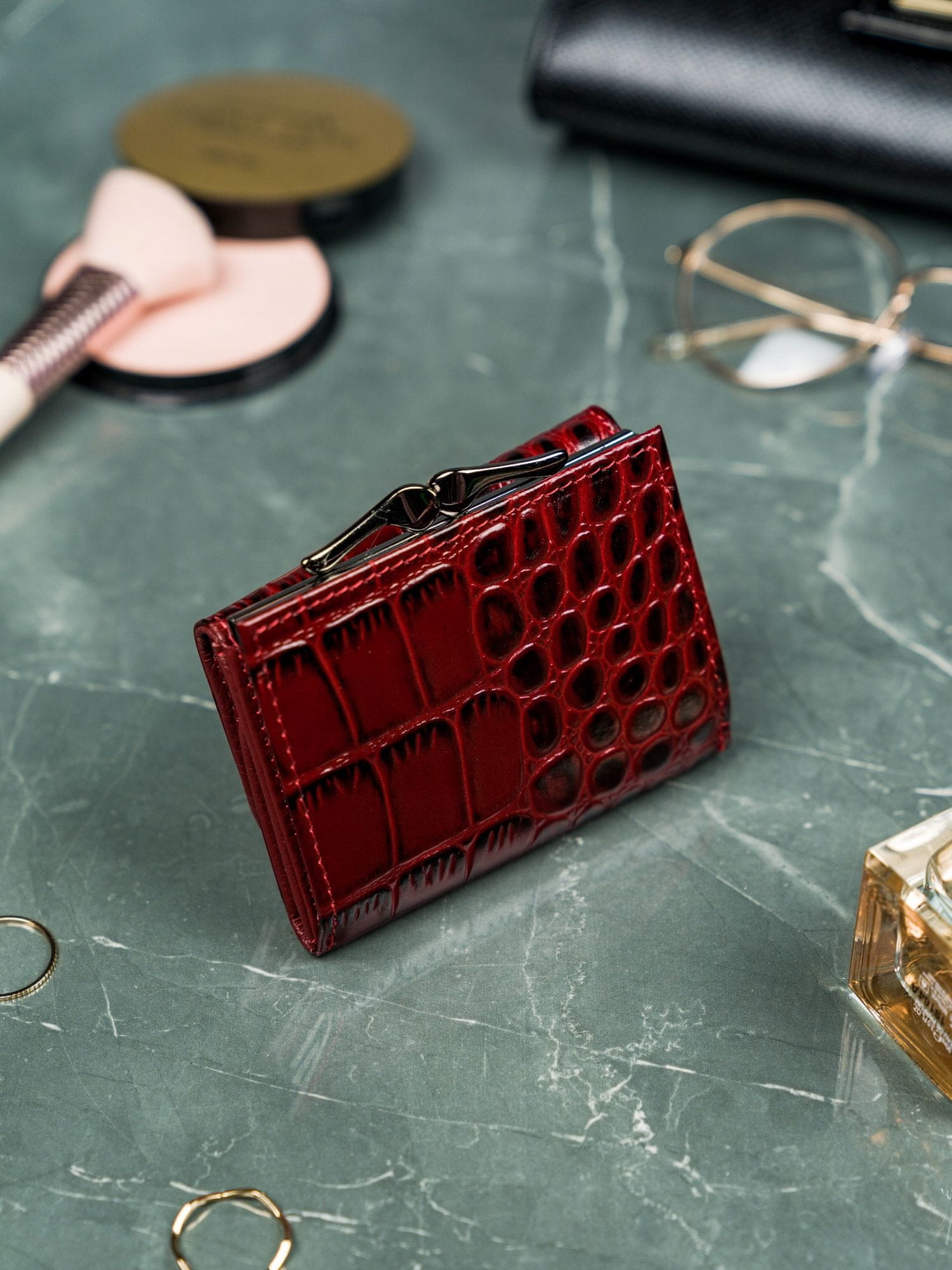 Ženska usnjena denarnica z RFID zaščito znamke LORENTI, z zapiranjem na gumb in zaponko, z motivom aligatorjeve kože.