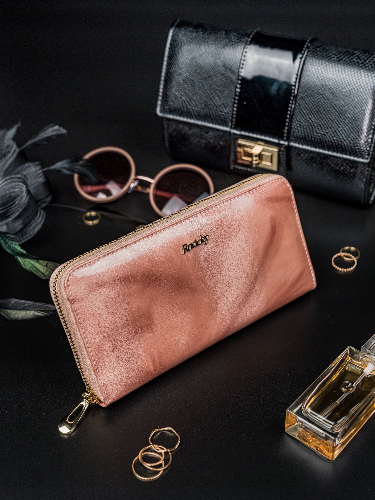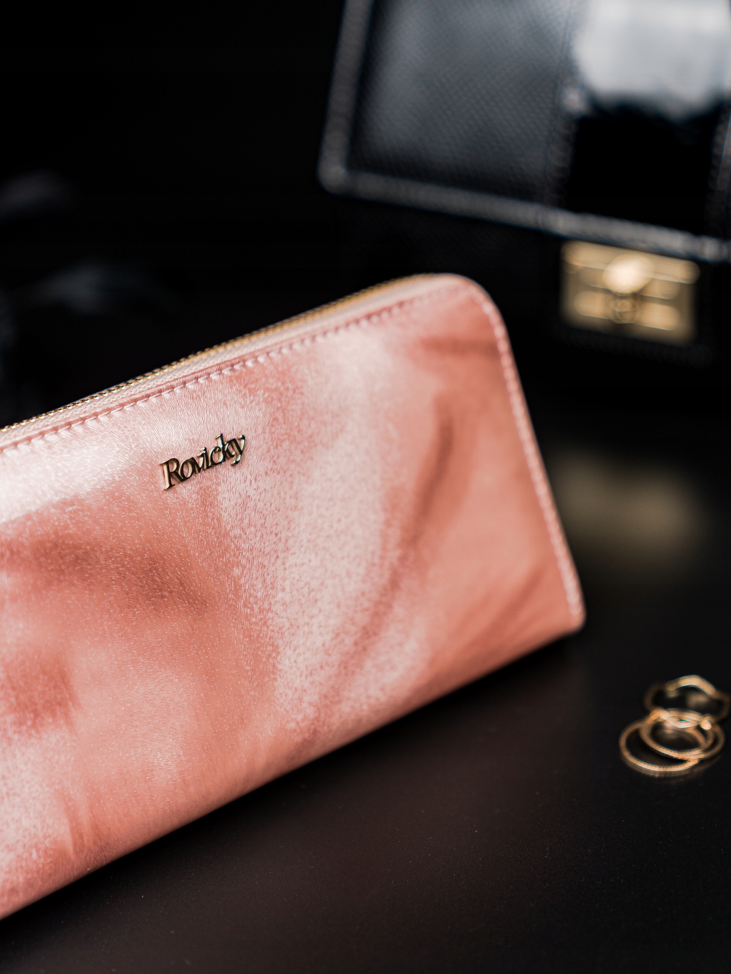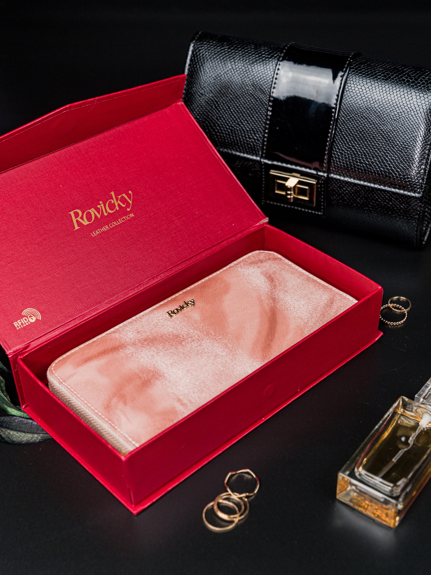 Denarnica iz najnovejše kolekcije Rovicky® je kombinacija umirjene elegance in klasične elegance, ki se odlično dopolnjujeta in vam zagotavljata ne le visokokakovosten izdelek, temveč tudi univerzalen dizajn, ki bo dopolnil vaš slog. Lakasto usnje je nedvomno vrhunec zunanjosti denarnice, notranjost pa se ponaša z vrhunskim mat zaključkom. Sprednja stran denarnice ima nežen, pozlačen logotip.