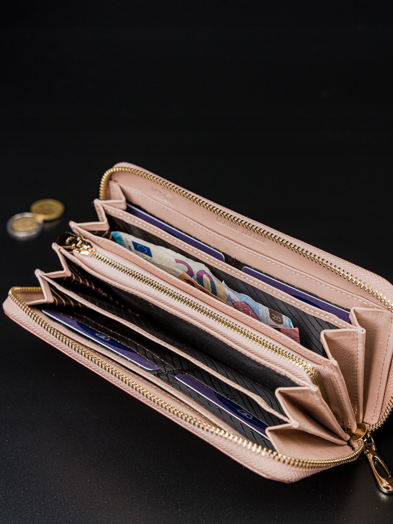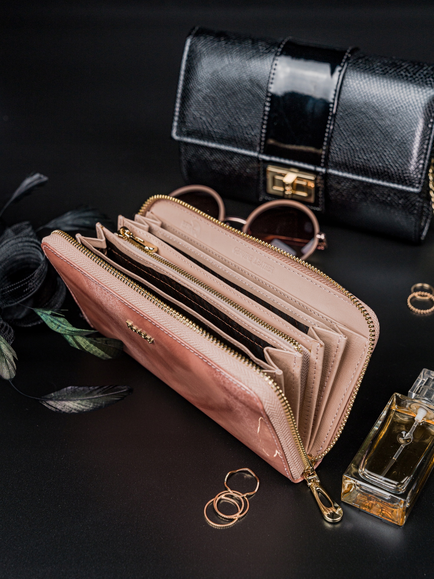 Ta izjemno praktična in elegantna denarnica v edinstvenem odtenku roza, ki odbija svetlobo v več barvah, je kot nalašč za ljubitelje manikure z mačjim očesom. Od danes naprej lahko svoje najljubše stile nohtov uskladite z našimi izdelki.