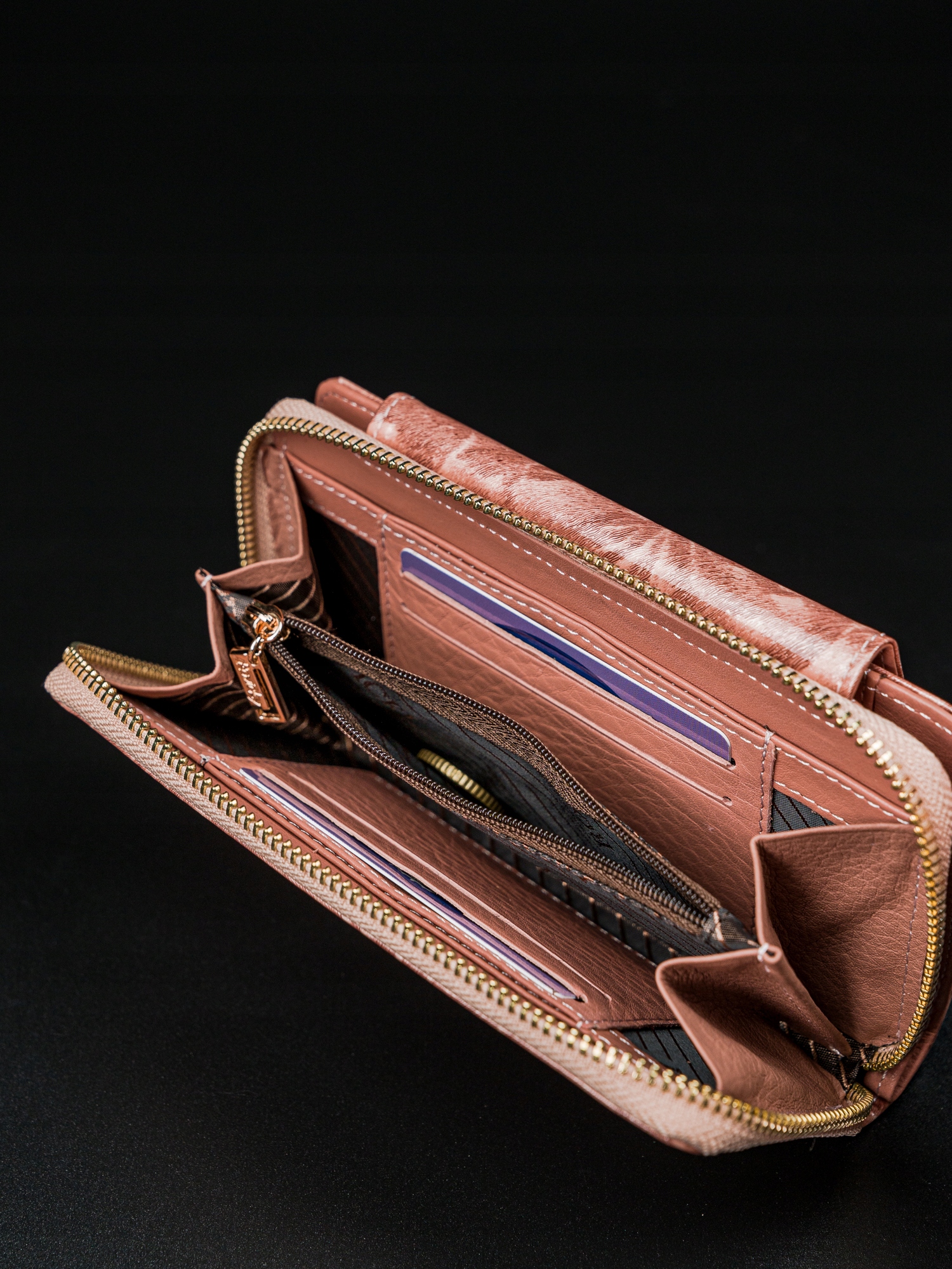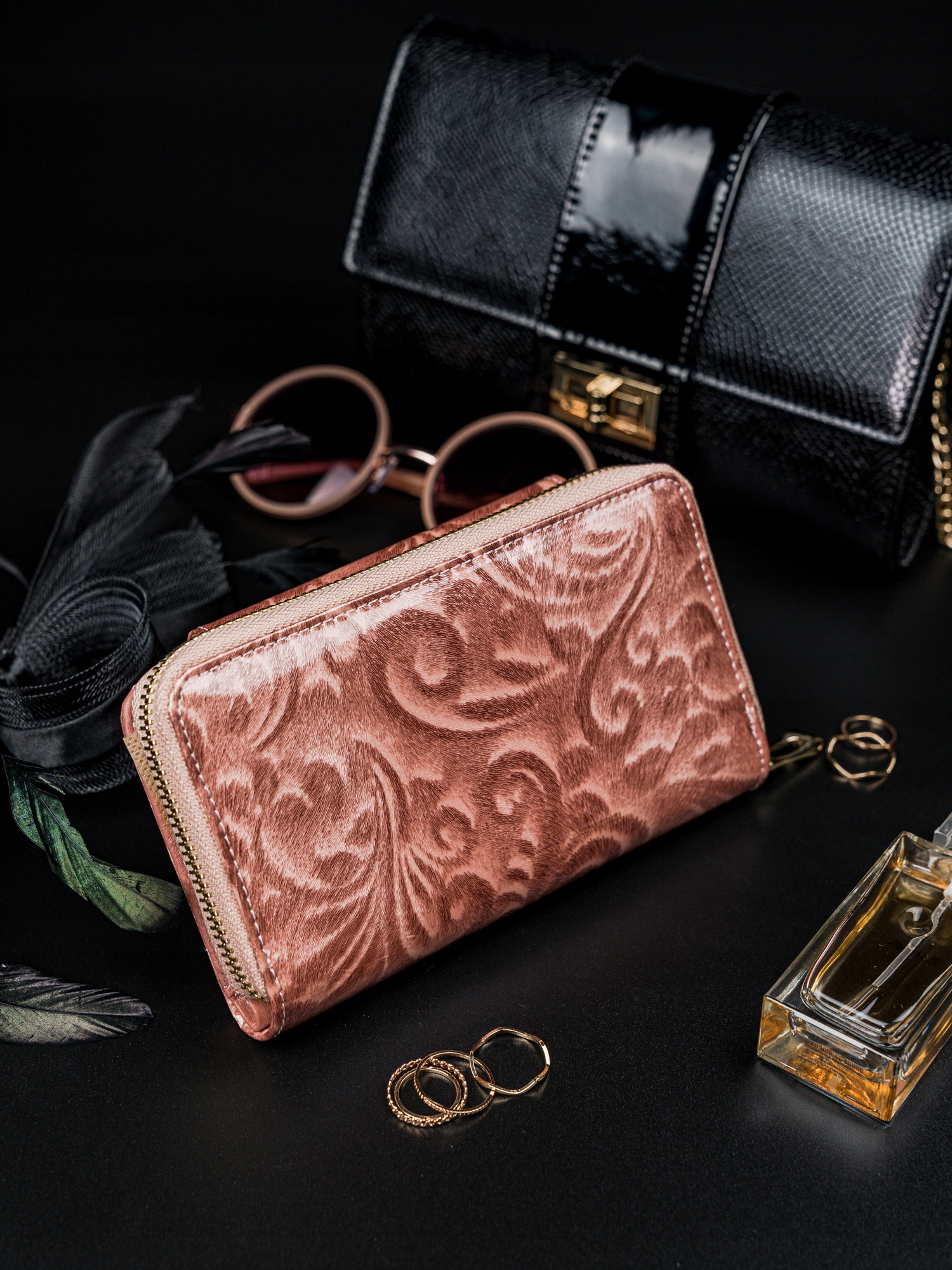 Osupljiva ženska denarnica v klasični in vedno elegantni roza barvi z zelo zanimivimi in modnimi žakardovskimi okraski.