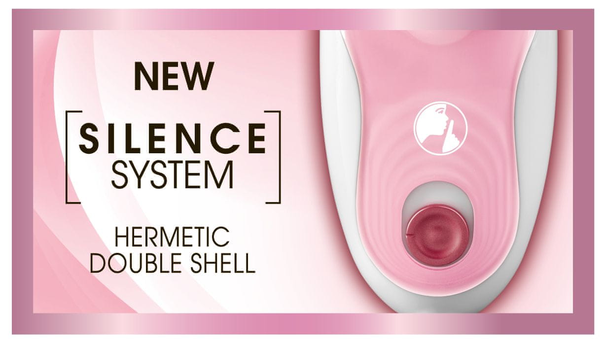 Epilator Rowenta Silence Soft ima tehnologijo Silence, ki v kombinaciji s hermetično zaprtim dvojnim ohišjem učinkovito duši hrup.