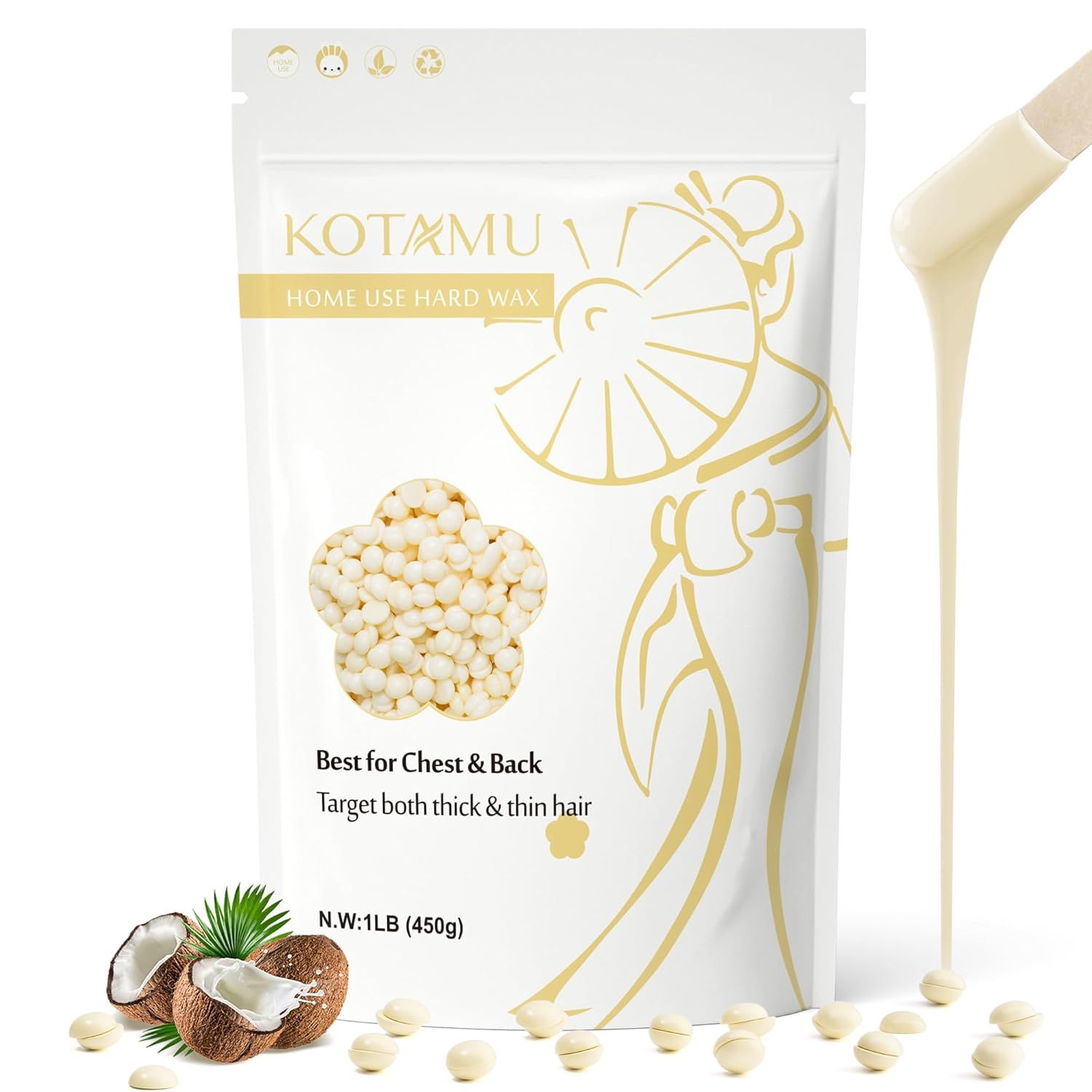 Učinkovito pri gostih in tankih dlakah: Naš kremni trdi vosek vsebuje naravno kokosovo olje, ki zmanjšuje draženje kože pri odstranjevanju dlak. Ti voski so nežni do občutljive kože in ne vsebujejo škodljivih kemikalij. KOTAMU voski učinkovito odstranjujejo goste dlake na prsih in hrbtu. Ekonomična izbira za brazilsko depilacijo, naš vosek zagotavlja dolgotrajno gladkost že po eni uporabi | Vrhunski rezultati odstranjevanja dlak: KOTAMU trdi voskasti zrnci so narejeni za obvladovanje najbolj trdovratnih dlak. Ti voski za odstranjevanje dlak trdno in učinkovito primejo neželene dlake pri korenini, odstranjujejo neželene grobe dlake na predelu bikinija, prsih, brazilski depilaciji, hrbtu, nogah, rokah, pazduhah, obrazu, trebuhu ali skoraj kjer koli drugje na telesu | Gladka in enostavna uporaba: KOTAMU trdi voskasti zrnci se topijo pri nizki temperaturi za nežno uporabo, kar poenostavi vašo pripravo. Njihova fina konsistenca zagotavlja vrhunski oprijem in zagotavlja celovito odstranjevanje neposredno iz korenin. Kremasta tekstura omogoča udobno odstranjevanje tudi finih, gostih dlak in pušča vašo kožo svilnato in brezhibno. Naši voskasti zrnci vam nudijo prijetno izkušnjo | Rešitev za odstranjevanje dlak v salonu doma: V primerjavi z dragimi saloni, naši topli voski za odstranjevanje dlak ponujajo stroškovno učinkovito možnost za voskanje doma. Posamezen paket se lahko uporablja za več sej, kar znatno zniža skupne stroške voskanja. Redna uporaba voskastih zrnc za odstranjevanje grobih dlak zmanjšuje tudi potrebo po obiskih salona, s čimer prihranite dragoceni čas in denar | Enostavno čiščenje in popolna konsistenca: KOTAMU voski za odstranjevanje dlak so posebej formulirani za čiščenje brez težav. Za razliko od drugih voskov ima naš visokokakovostni vosek idealno teksturo, ki preprečuje, da bi bil preveč tekoč ali predebel, in zagotavlja, da ga je mogoče zlahka odstraniti v enem kosu, ne da bi pustil ostanke voska, in razkriva čisto, svilnato in mehko kožo. Dosezite učinek brez dlak brez nereda z našimi voskastimi zrnci | Dolgoročna garancija in stalna služba za stranke: Ekipa KOTAMU stoji za našim trdim voskom s 5-letno garancijo. Naša obljuba zanesljivosti vam zagotavlja vrhunsko zmogljivost v prihodnjih letih. Če imate kakršna koli vprašanja ali niste zadovoljni z našimi izdelki – voskastimi zrnci za odstranjevanje dlak – ne oklevajte in nas kontaktirajte. Vedno smo pripravljeni hitro odgovoriti in razjasniti vaše pomisleke.