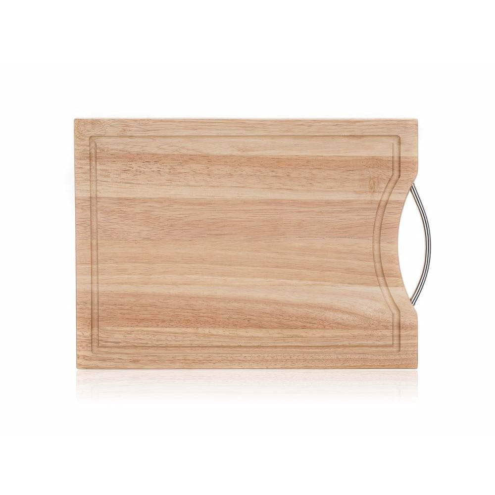 Lesena deska za rezanje 34 × 24 × 1,5 cm iz tropskega lesa kavčukovca. Deska je pravokotne oblike z žlebom na robu, višina deske je 1,5 cm. Opremljen je z ročajem iz nerjavečega jekla. Tradicionalni naravni material za pripravo hrane je namenjen vsem, ki imajo raje les kot plastiko. Celoten opis